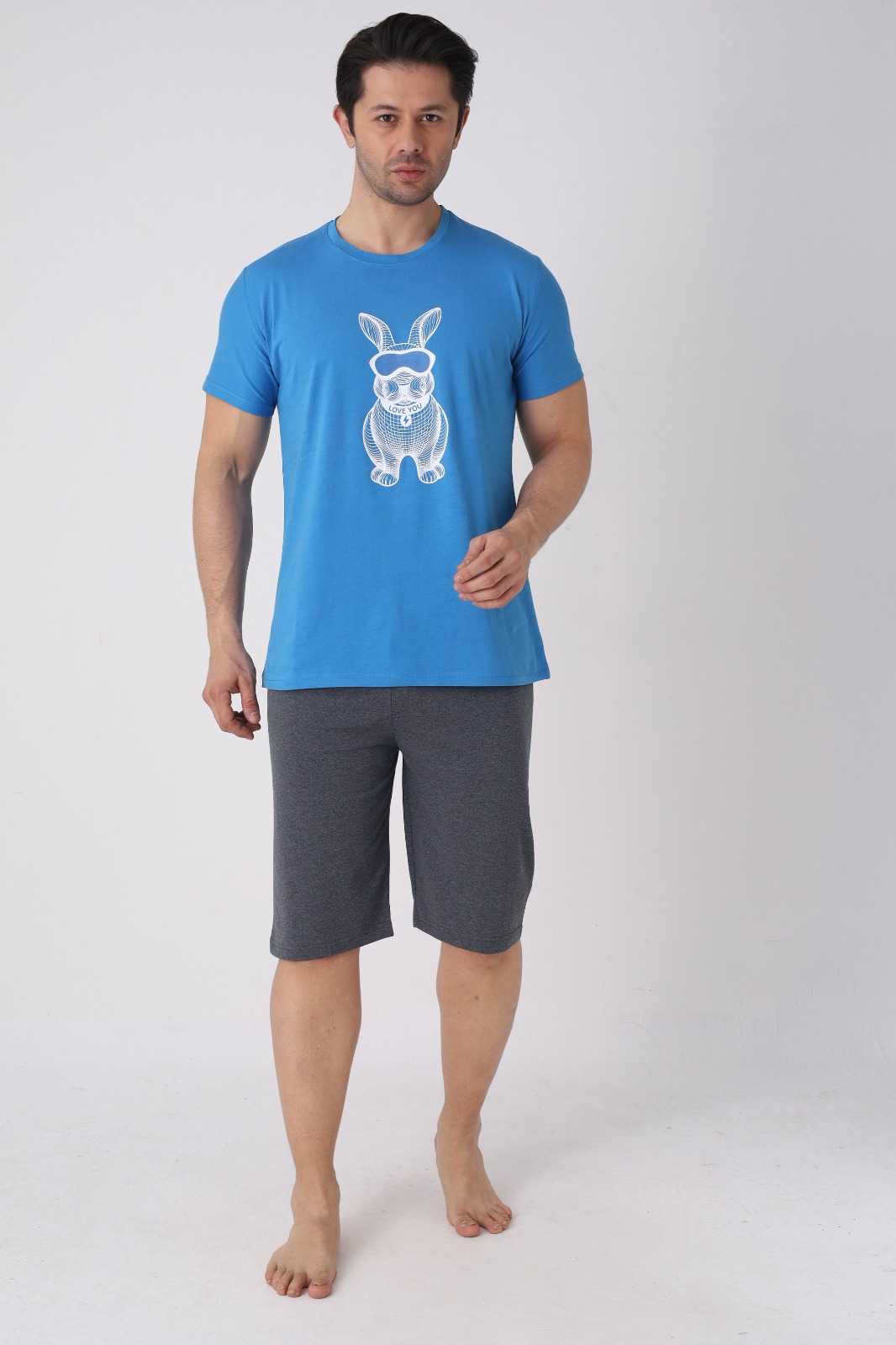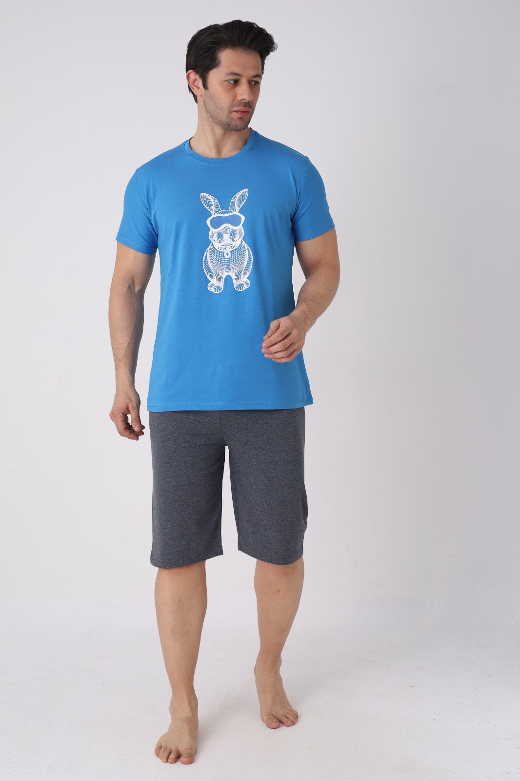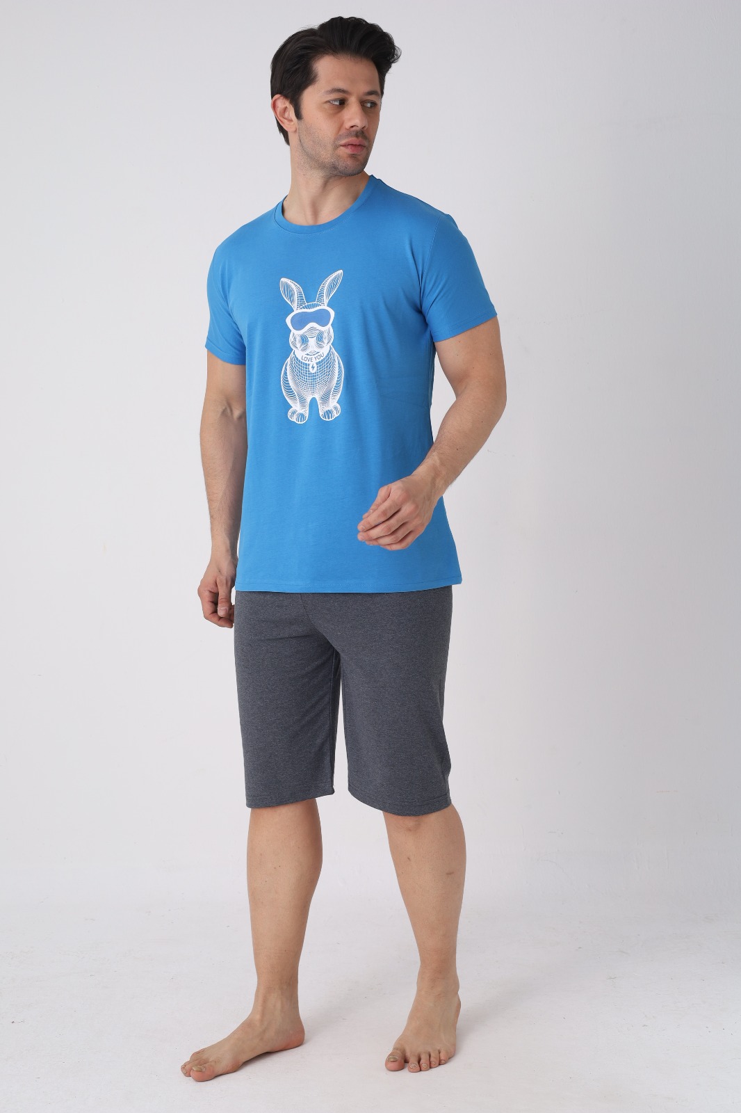 Pijama pentru bărbați, confortabilă și practică, perfectă pentru nopțile călduroase și pentru momentele de relaxare acasă. Setul este format dintr-un tricou cu mânecă scurtă și pantaloni 3/4, oferind lejeritate și libertate de mișcare.