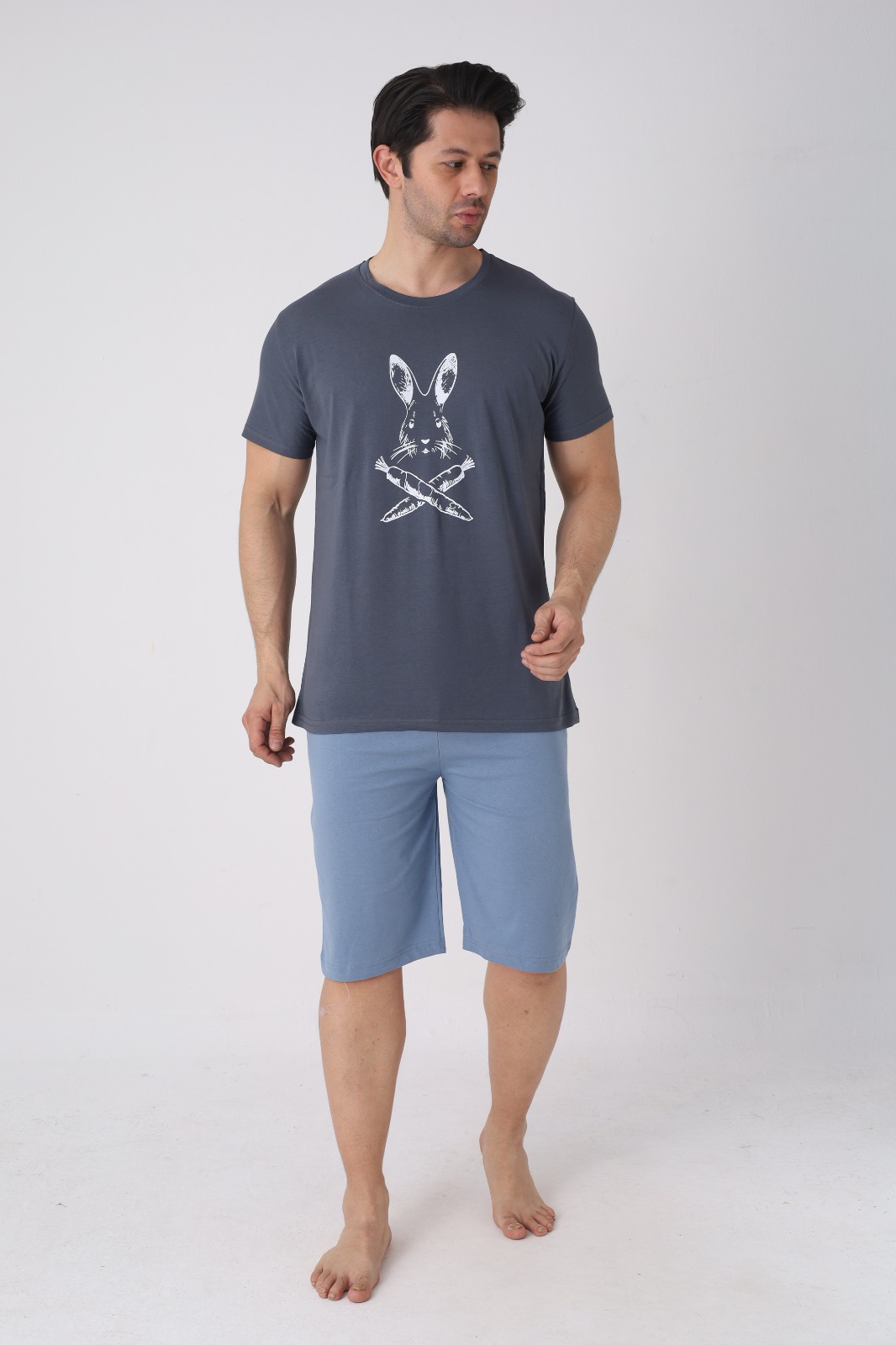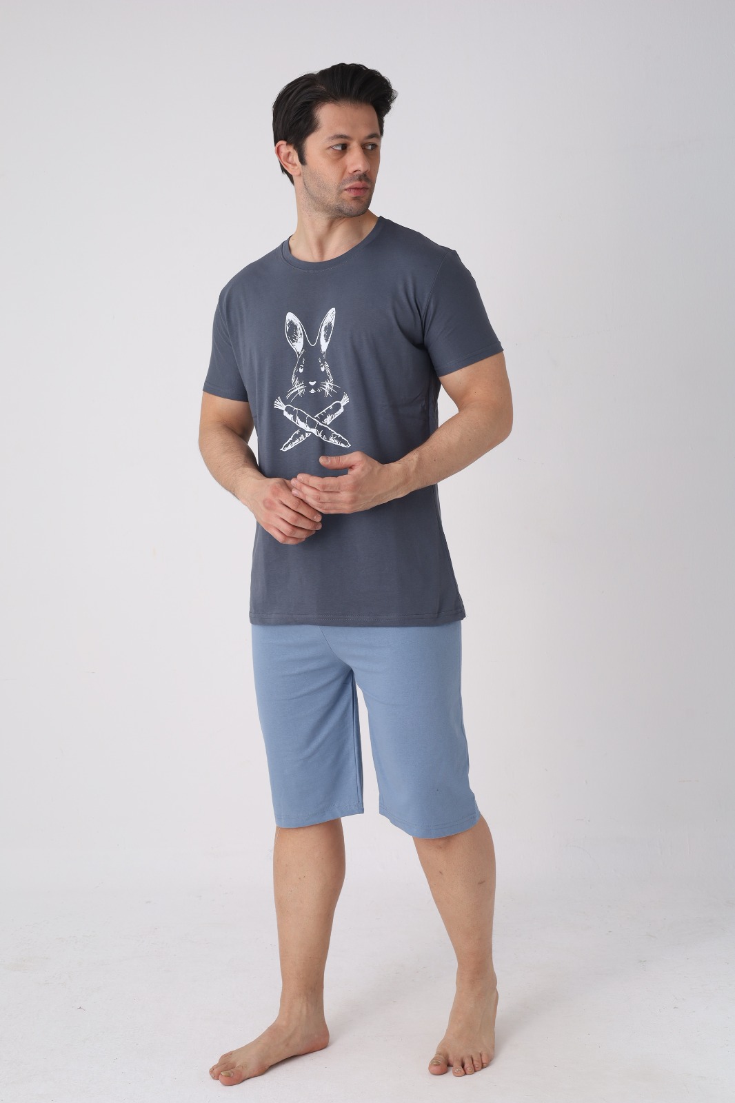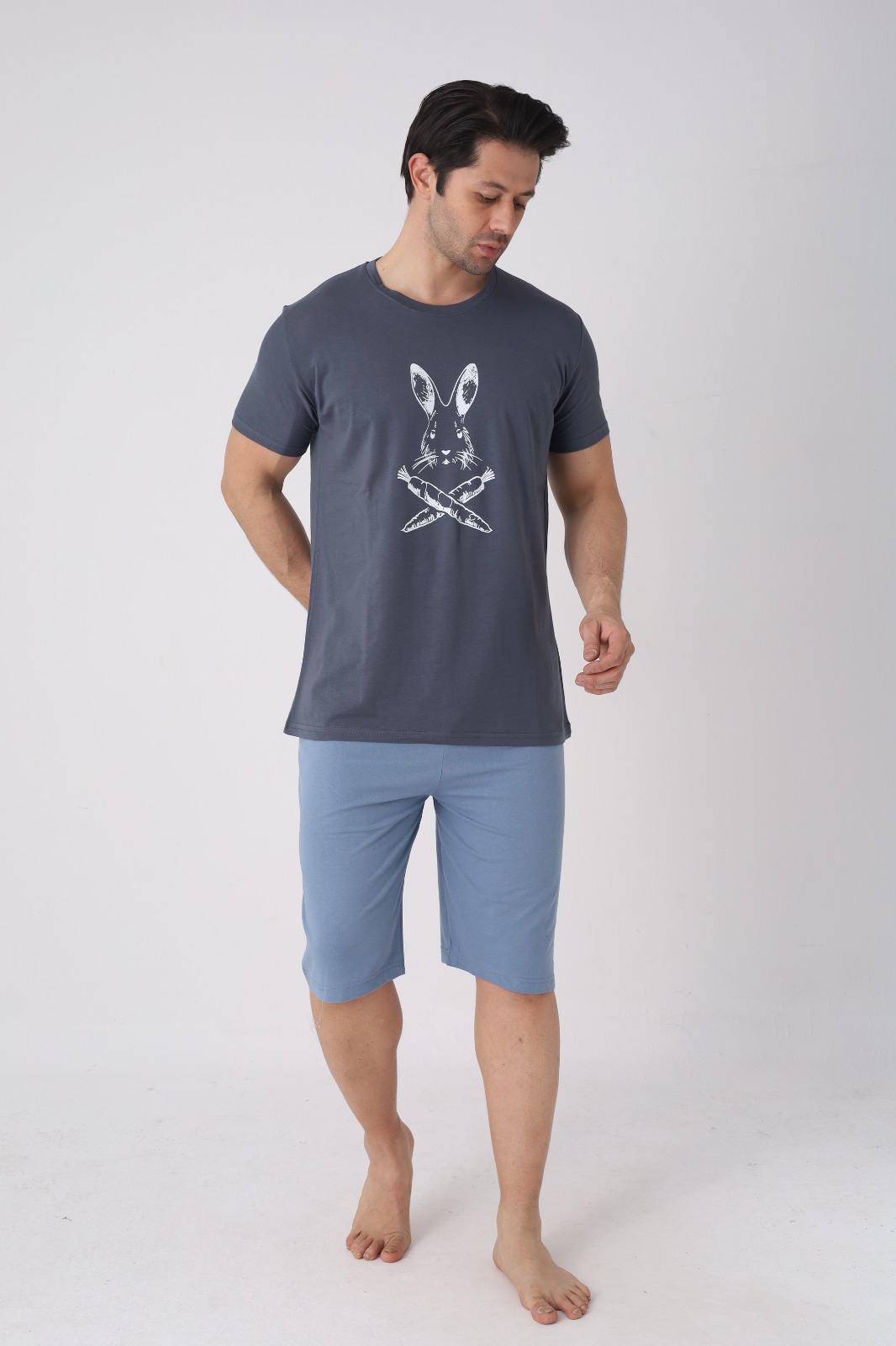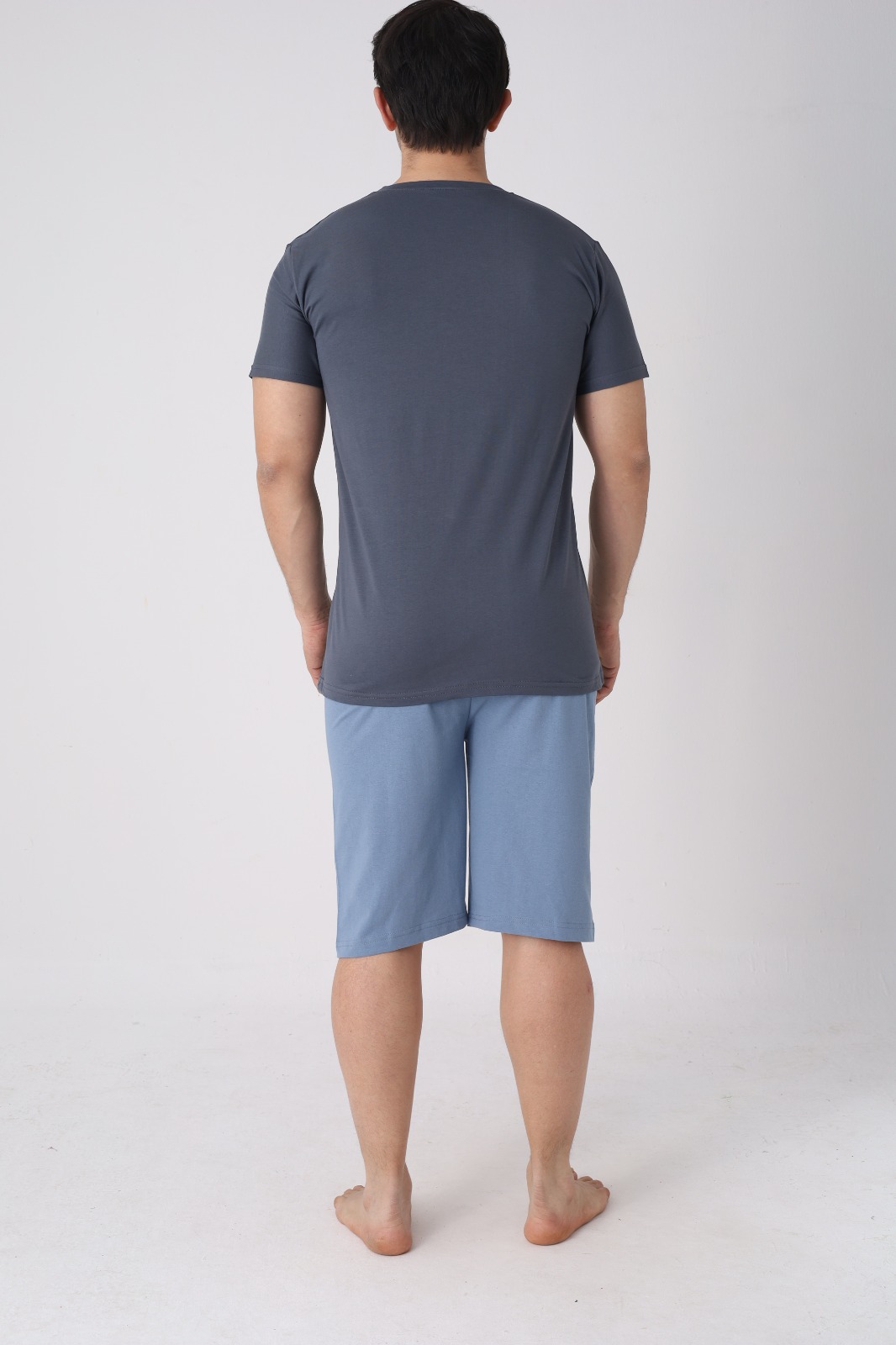 Pijama pentru bărbați, confortabilă și practică, perfectă pentru nopțile călduroase și pentru momentele de relaxare acasă. Setul este format dintr-un tricou cu mânecă scurtă și pantaloni 3/4, oferind lejeritate și libertate de mișcare.