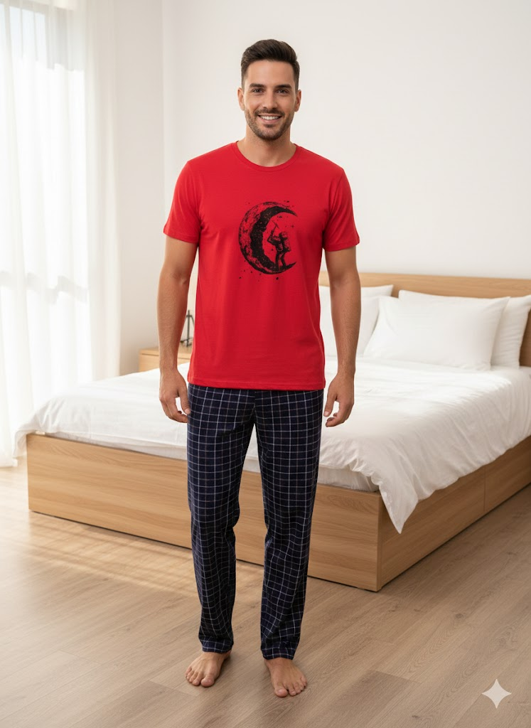Alege confortul ideal pentru odihnă și relaxare cu această pijama pentru bărbați, compusă din tricou cu mânecă scurtă și pantalon lung. Practică și versatilă, este potrivită pentru orice sezon, oferind lejeritate și libertate de mișcare pe timpul nopții.