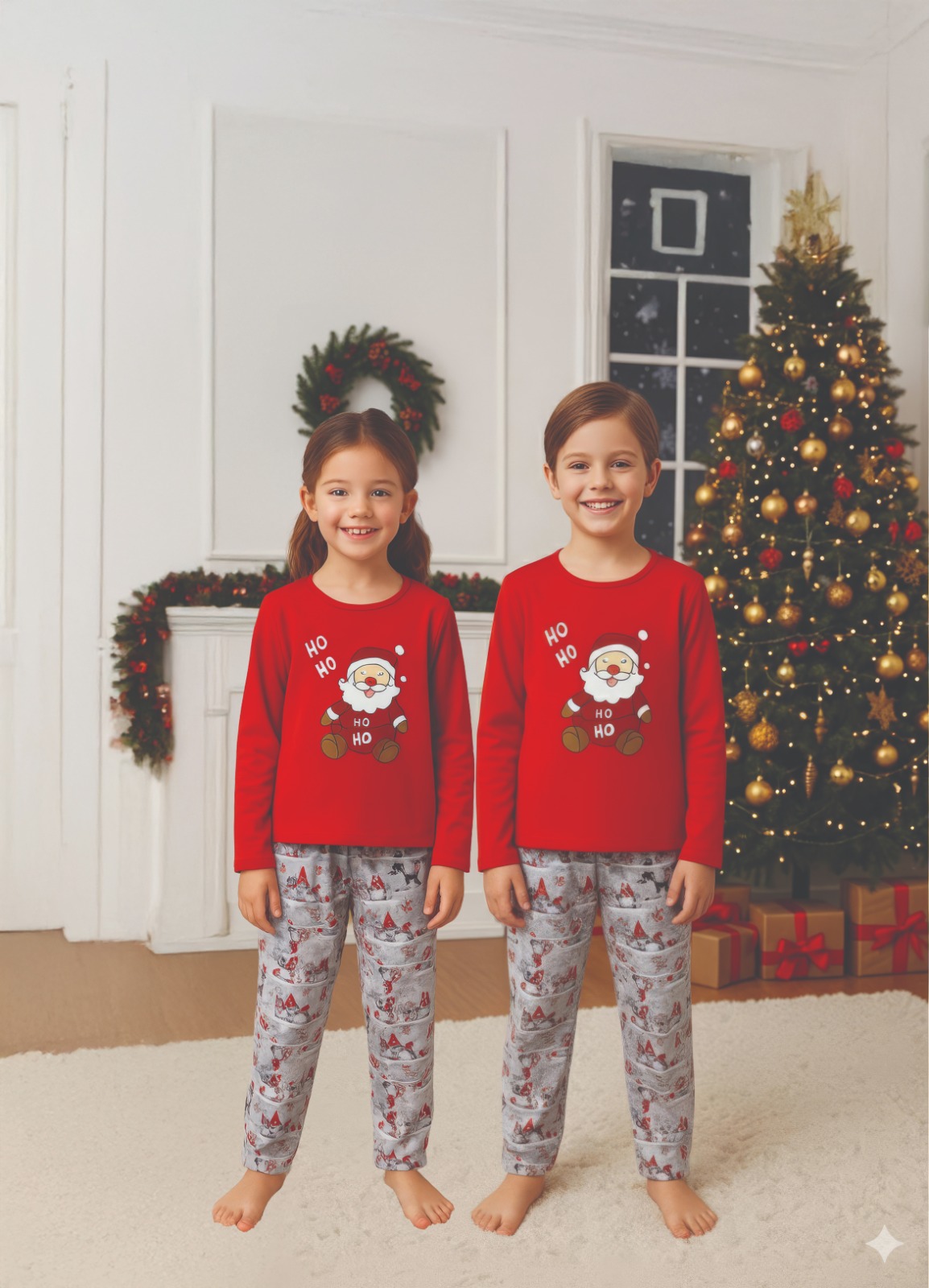 Sunt alegerea perfecta pentru serile de iarna si atmosfera magica a sarbatorilor.Set este cofectionat dintr-un material moale ,placut la atingere si confortabil ,ideal pentru pielea sensibila a celor mici .Pijamalele sunt perfecte pentru somn ,joaca in casa sau pentru poze de familie in spirit festiv.