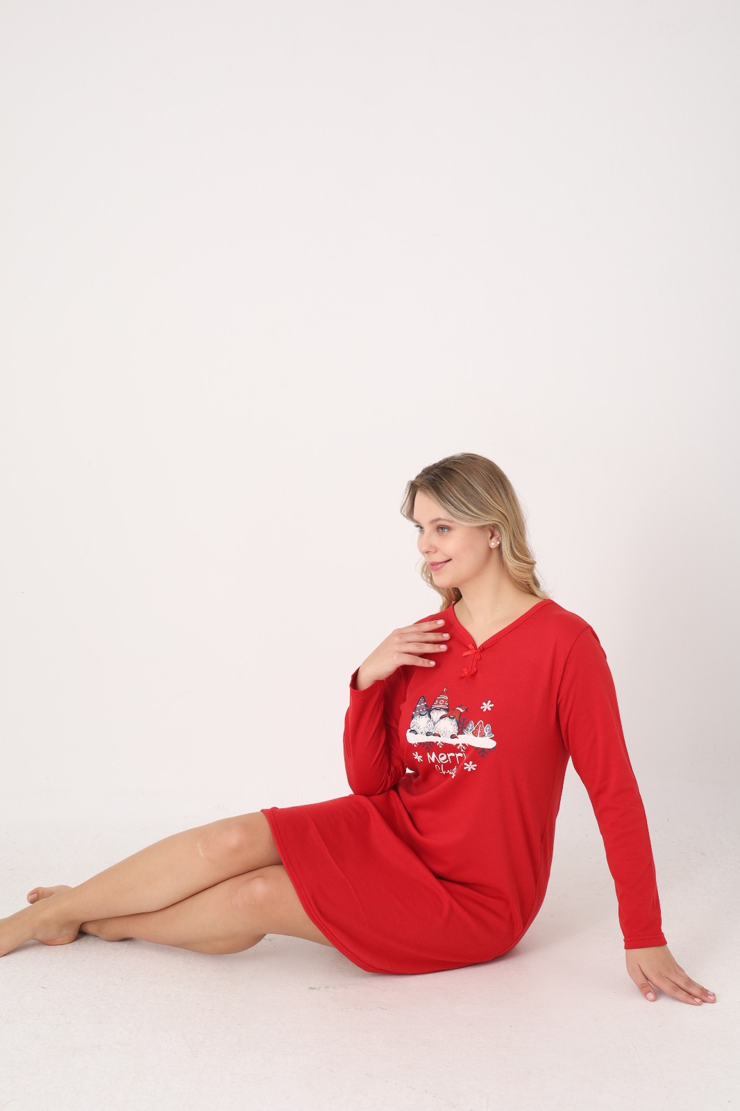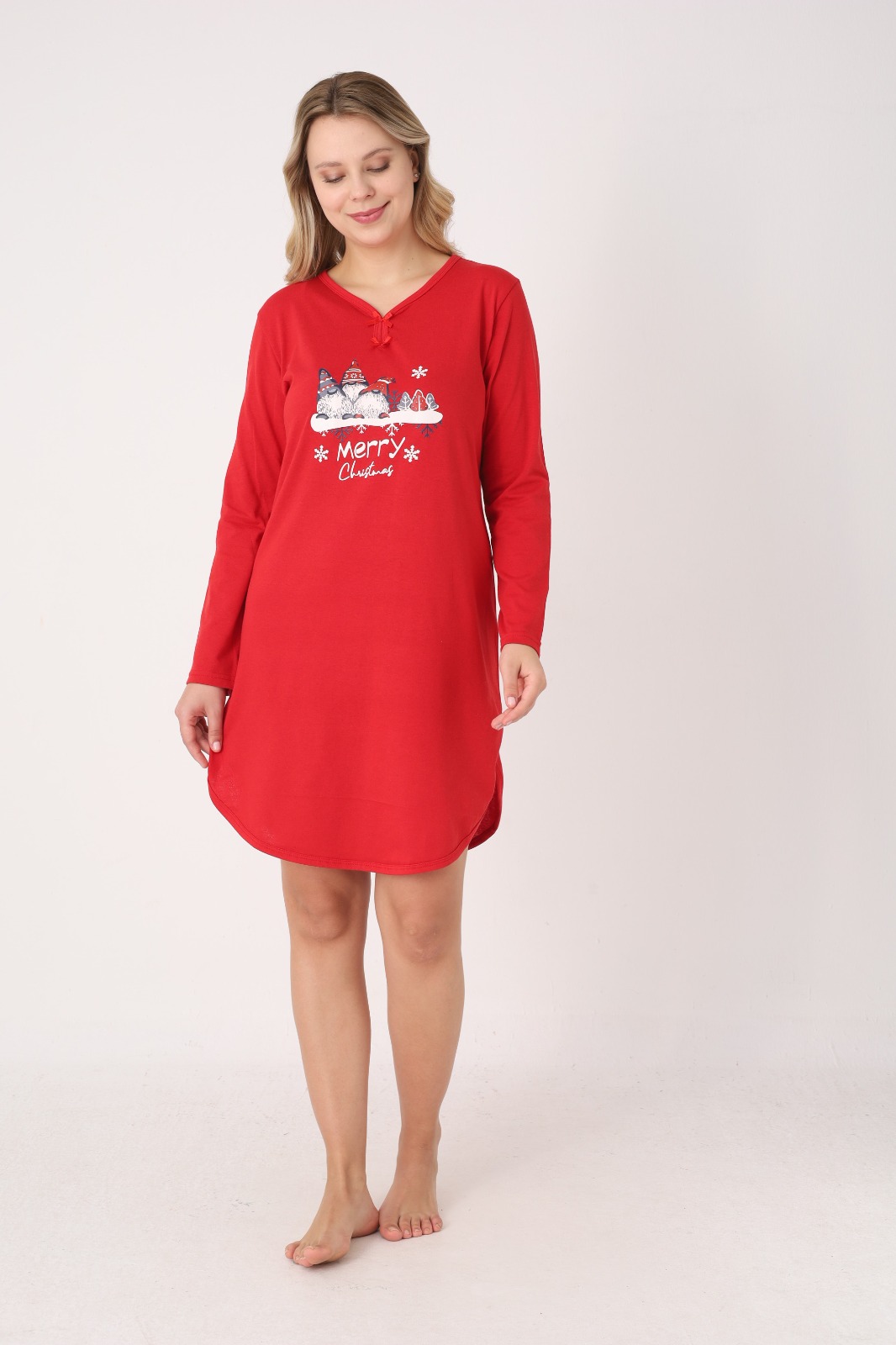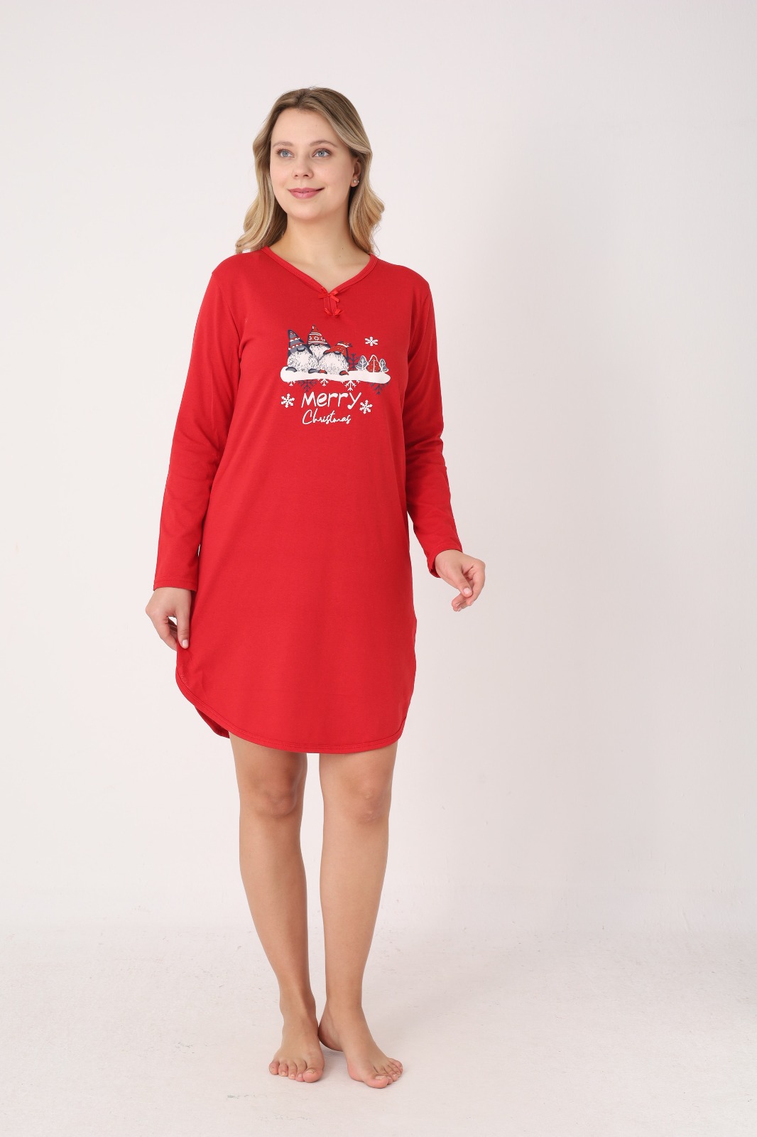 Bucură-te de confort și spirit festiv cu această cămașă de noapte pentru damă, perfectă pentru sezonul sărbătorilor. Realizată din material moale și plăcut la atingere, este ideală pentru nopți liniștite și momente de relaxare acasă. Modelul are croială lejeră, mâneci lungi și decolteu în V, accesorizat cu fundiță decorativă.