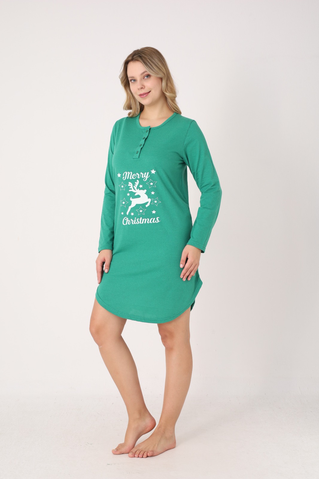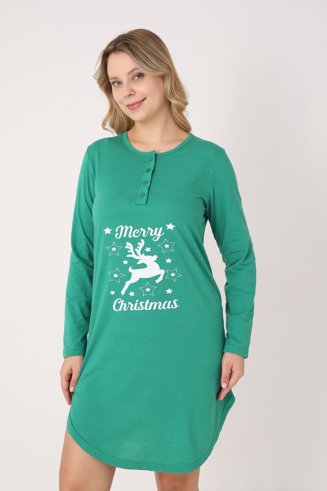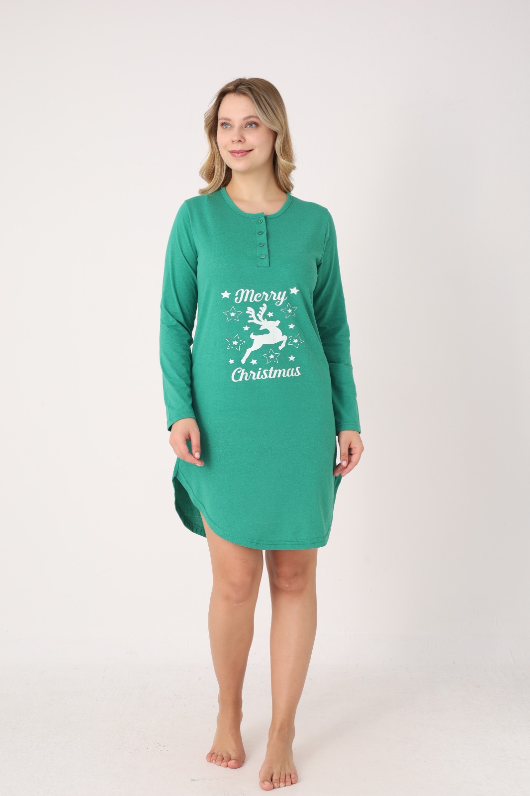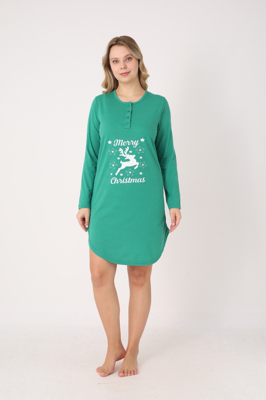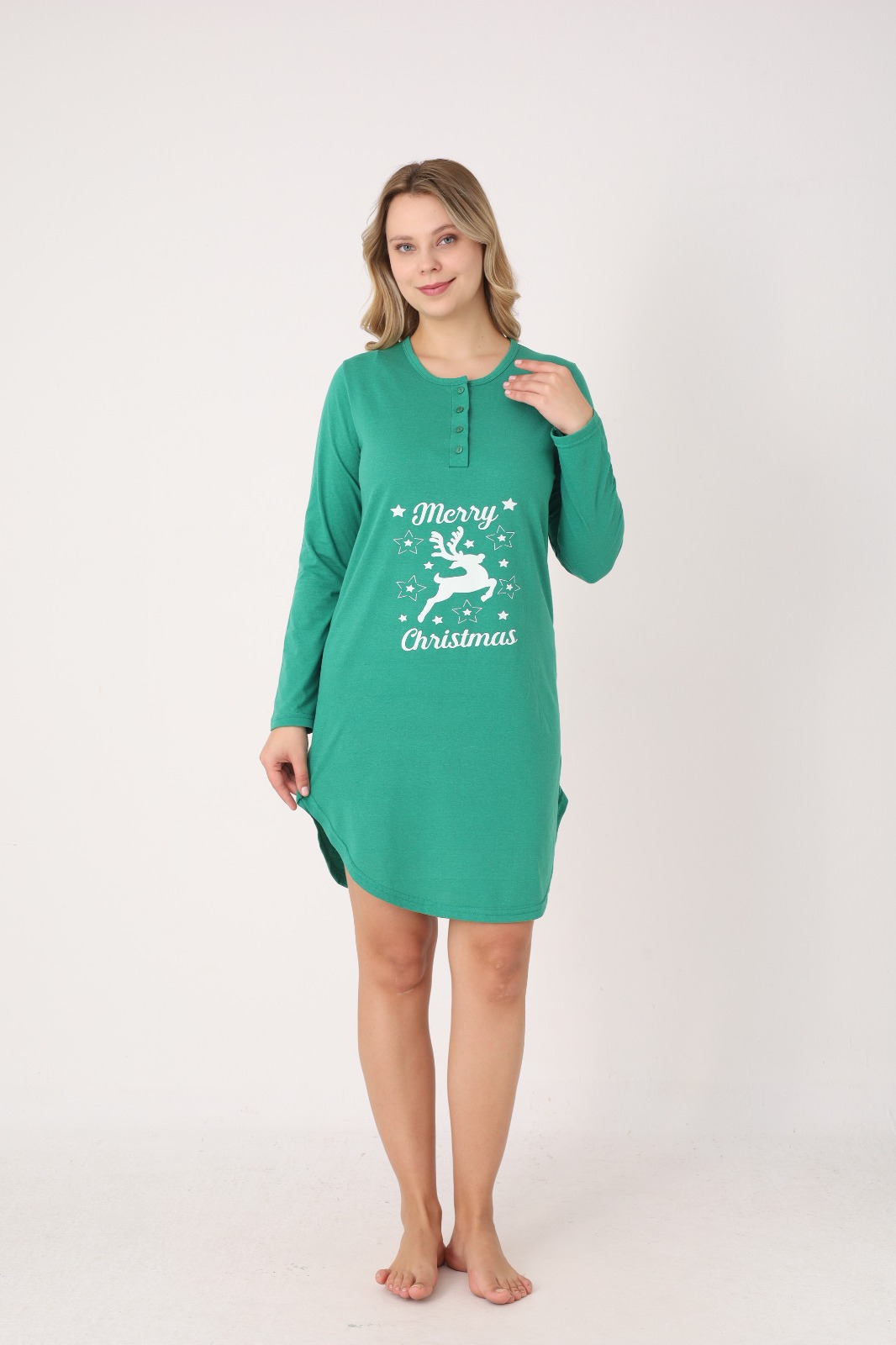 Cămașă de noapte pentru damă, cu design festiv de Crăciun. Modelul este realizat din material moale și confortabil, cu mâneci lungi și croială lejeră, ideală pentru relaxare sau somn. Are decolteu rotund cu nasturi decorativi în partea frontală.Lungimea este deasupra genunchilor, iar culoarea verde îi conferă un aer elegant și plăcut. Potrivită pentru serile de iarnă sau ca idee de cadou de sărbători.