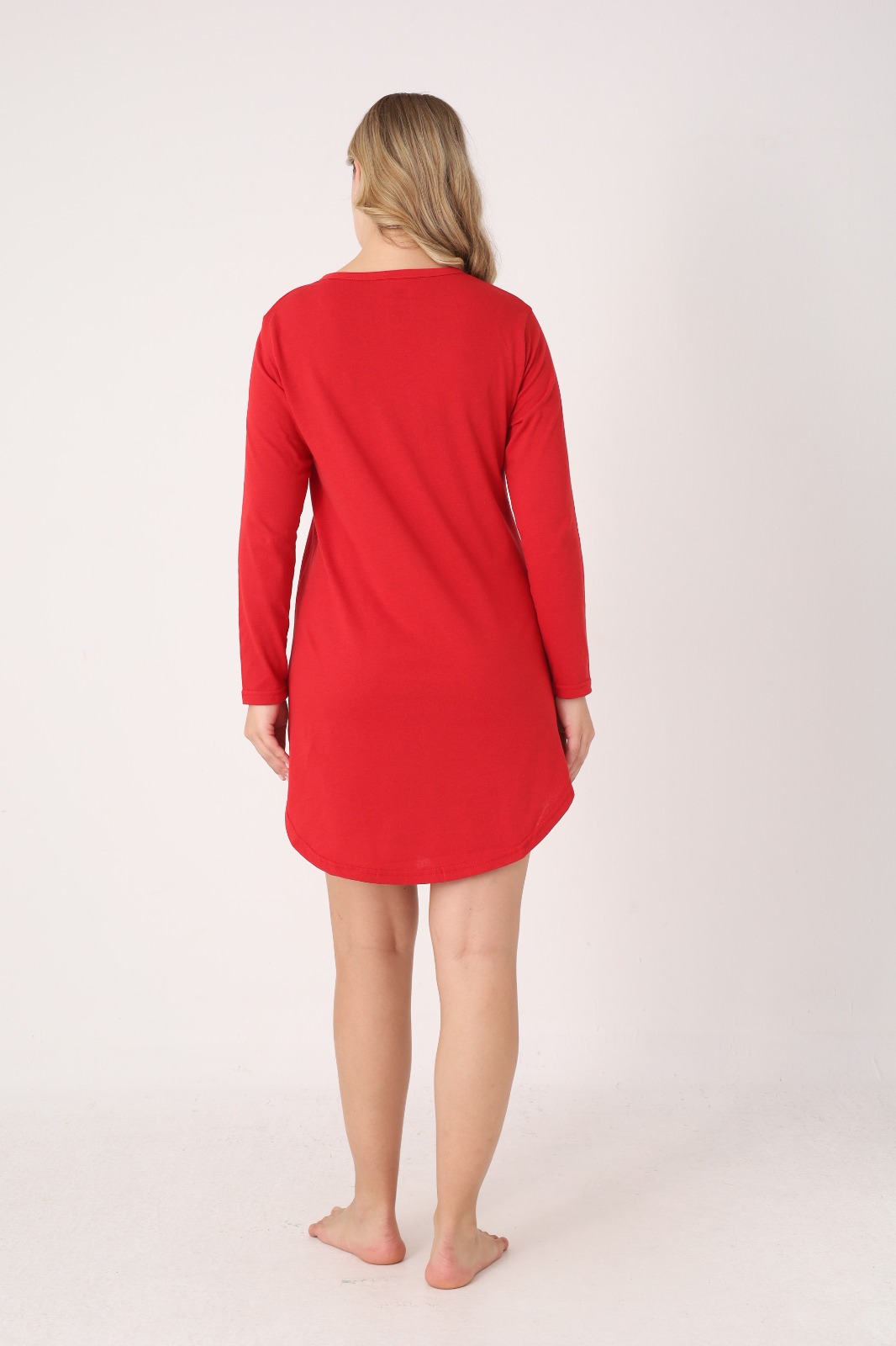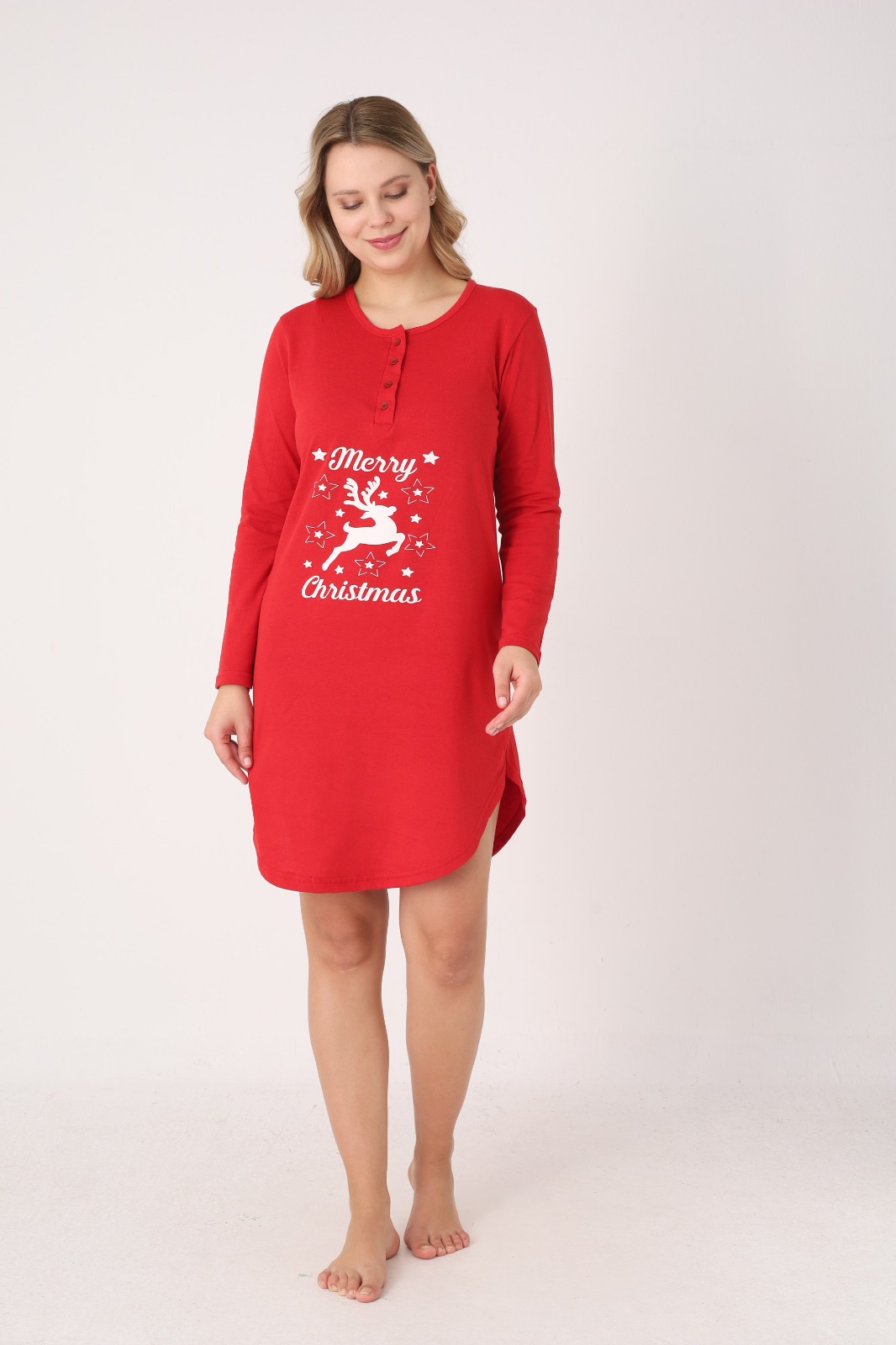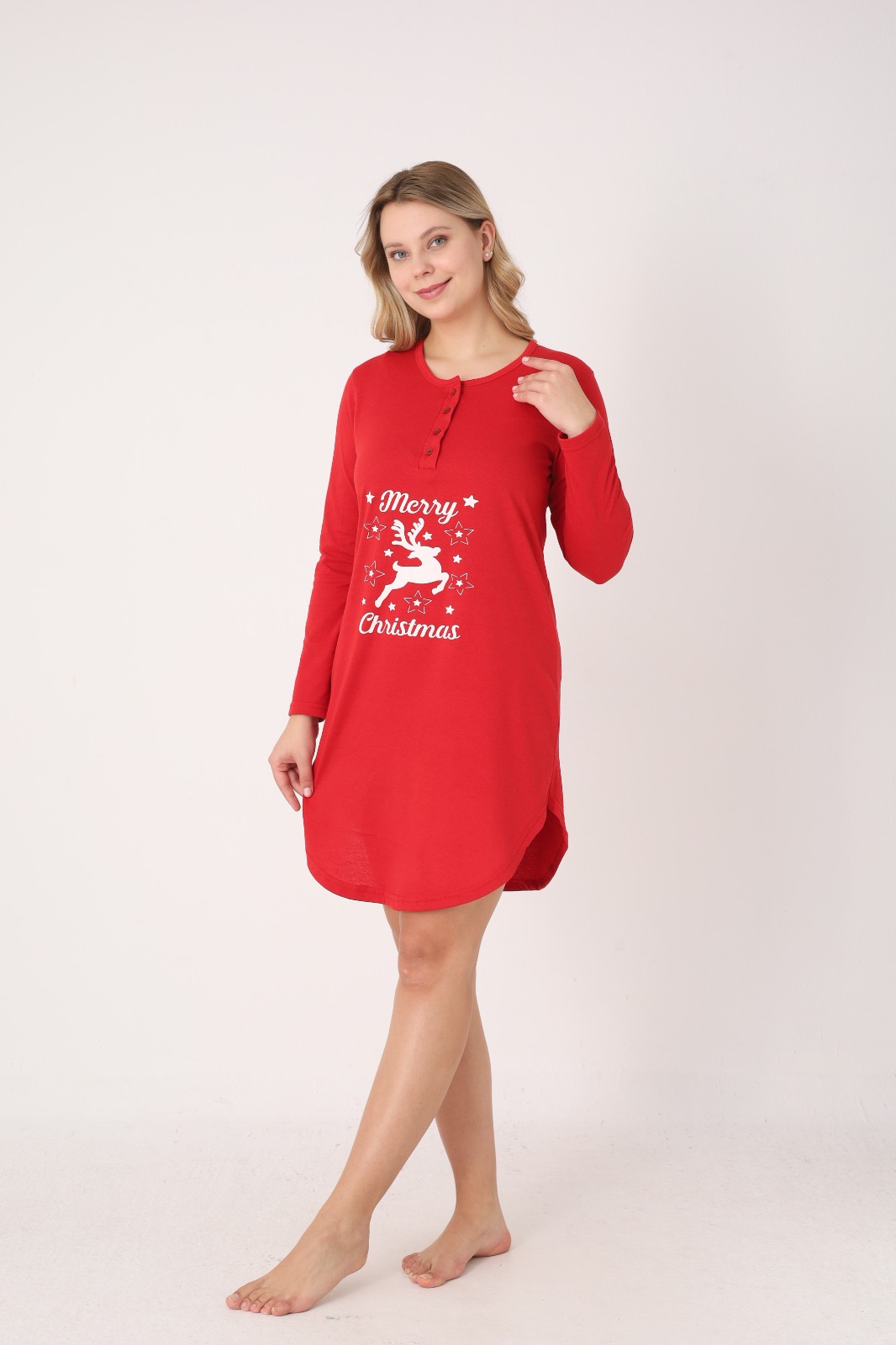 Cămașă de noapte pentru damă, cu design festiv de Crăciun. Modelul este realizat din material moale și confortabil, cu mâneci lungi și croială lejeră, ideală pentru relaxare sau somn. Are decolteu rotund cu nasturi decorativi în partea frontală.Lungimea este deasupra genunchilor, iar culoarea verde îi conferă un aer elegant și plăcut. Potrivită pentru serile de iarnă sau ca idee de cadou de sărbători.