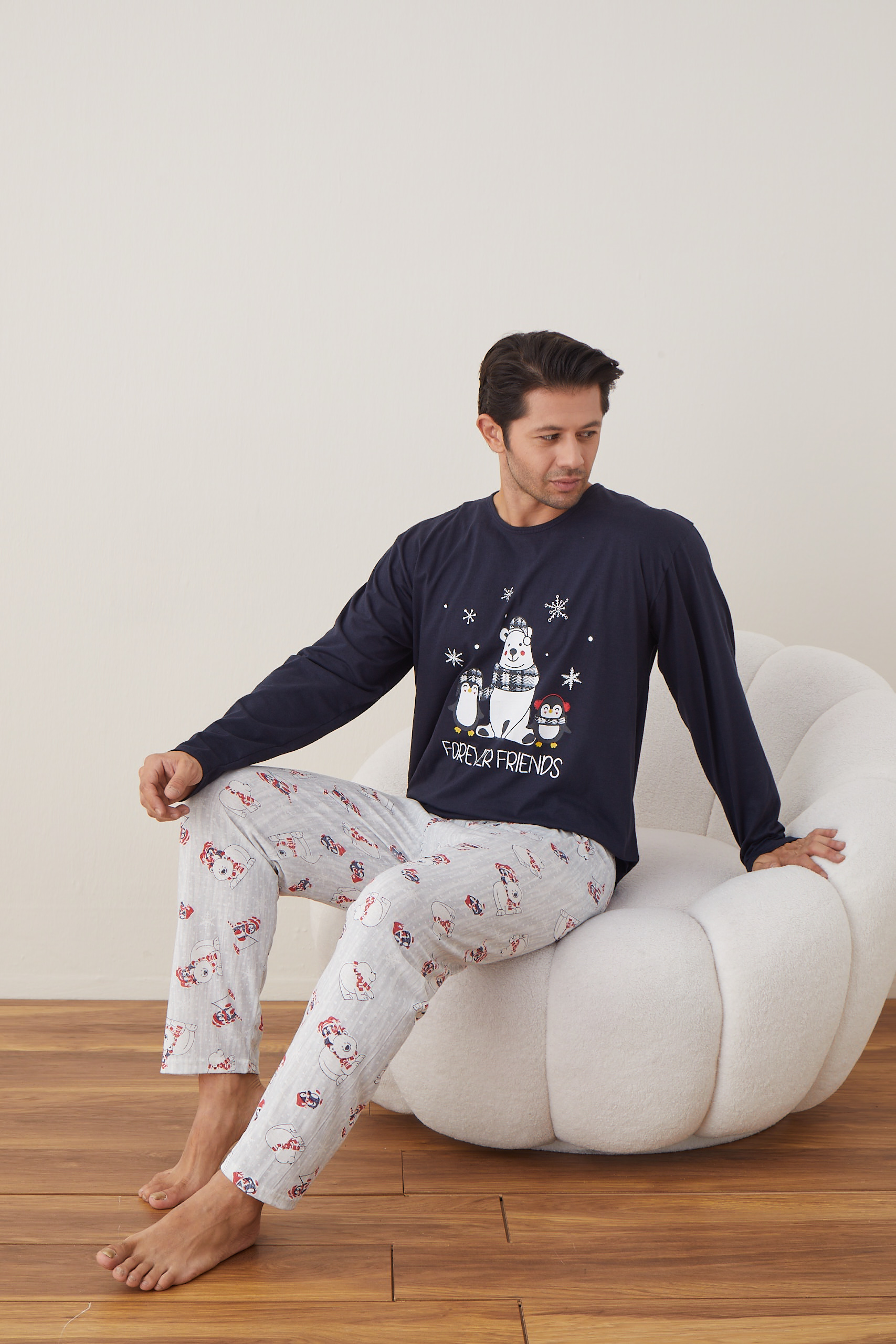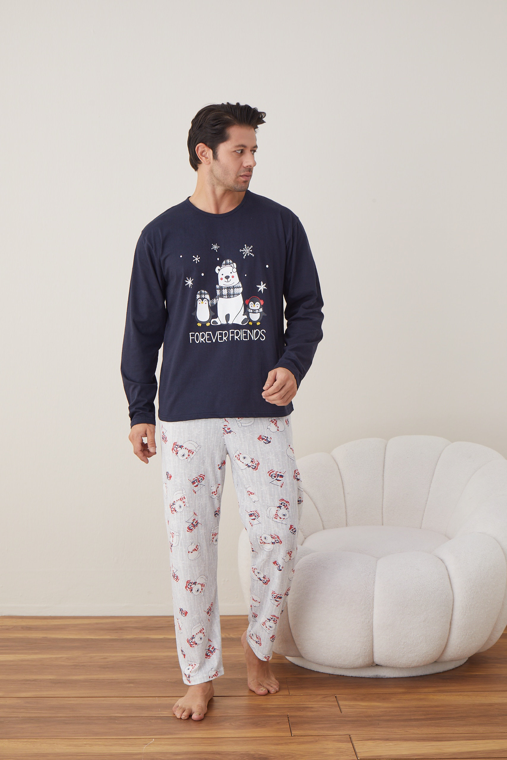 Pijama barbati Craciun "FOREVER FRIENDS " maneca lunga ,pantaloni lungi,Culoare Bleumarin ,Engros