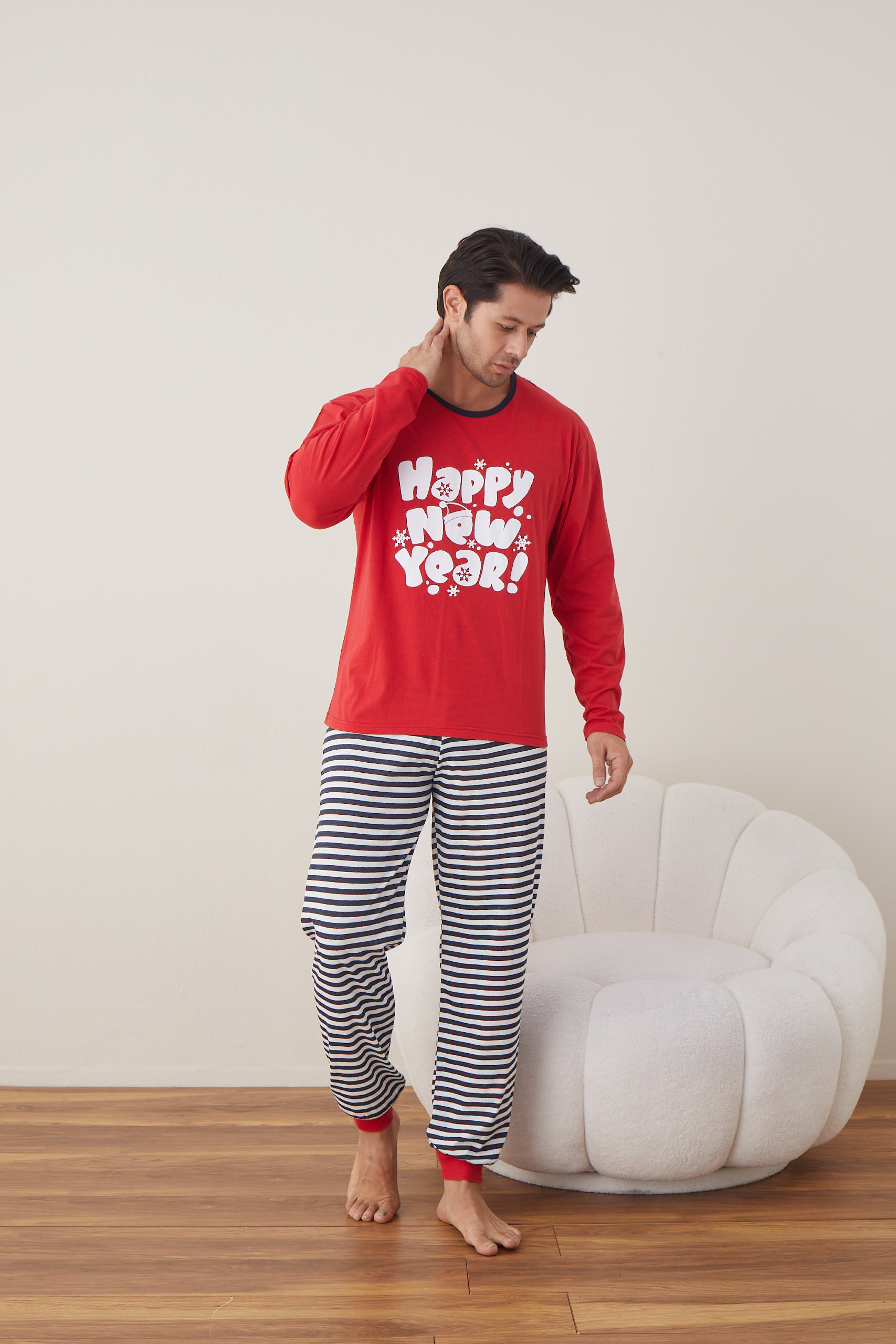 Pijama barbati Craciun "HAPPY NEW YEAR" , maneca lunga ,pantaloni lungi,Culoare Rosu ,Engros