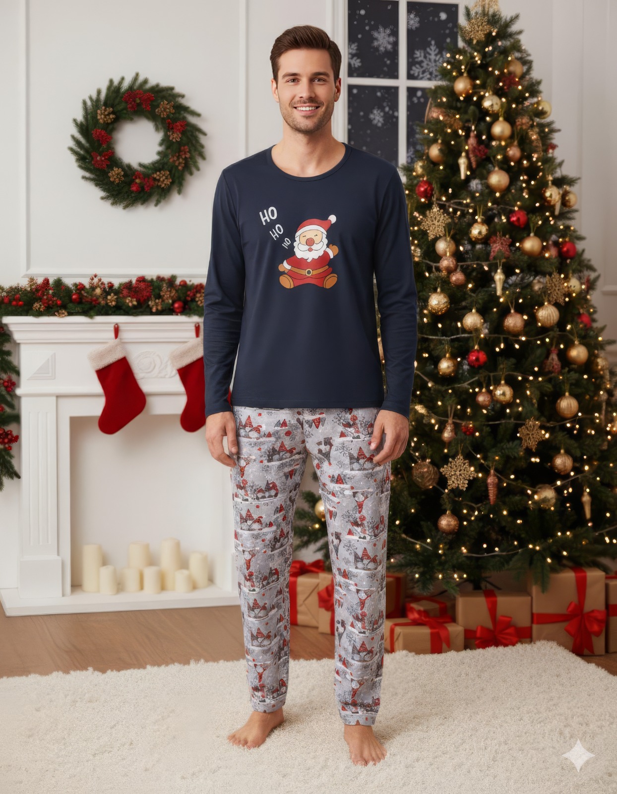 Adaugă spiritul sărbătorilor în garderoba de iarnă cu această pijama de bărbați cu tematică de Crăciun! Setul este format din bluză cu mânecă lungă și pantaloni lungi, ambele decorate cu un imprimeu modern  de Crăciun, perfect pentru cei care adoră atmosfera festivă.