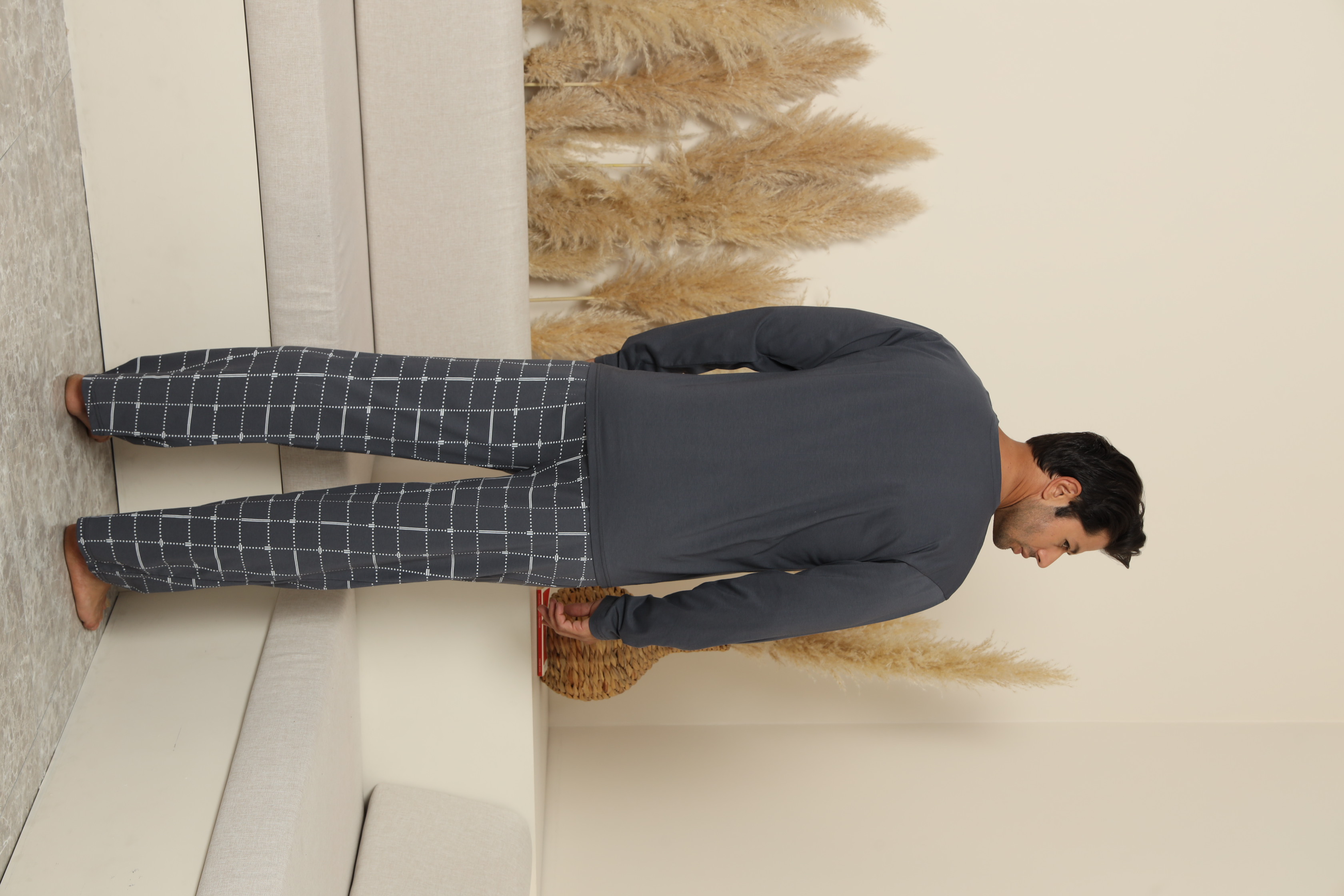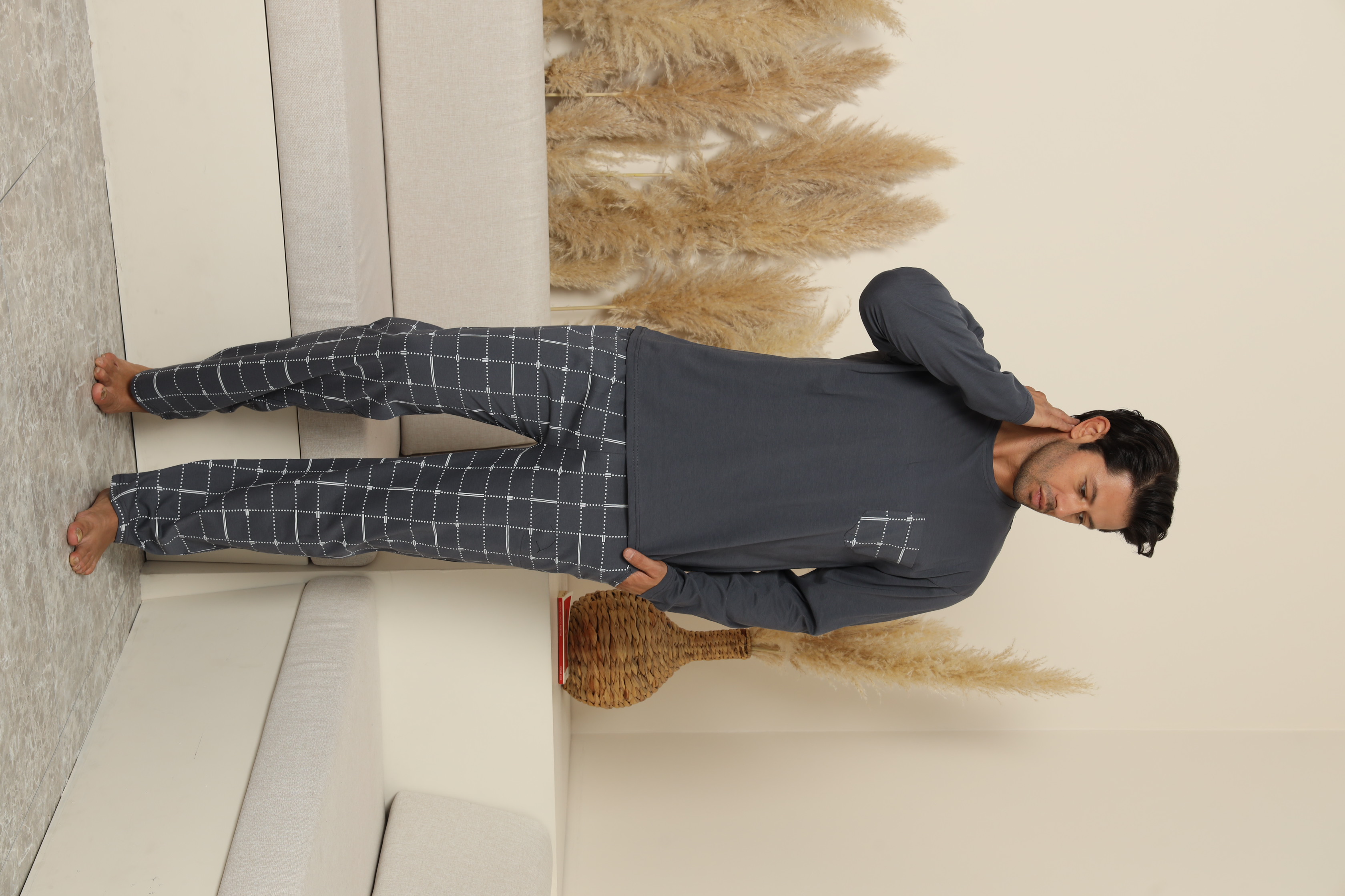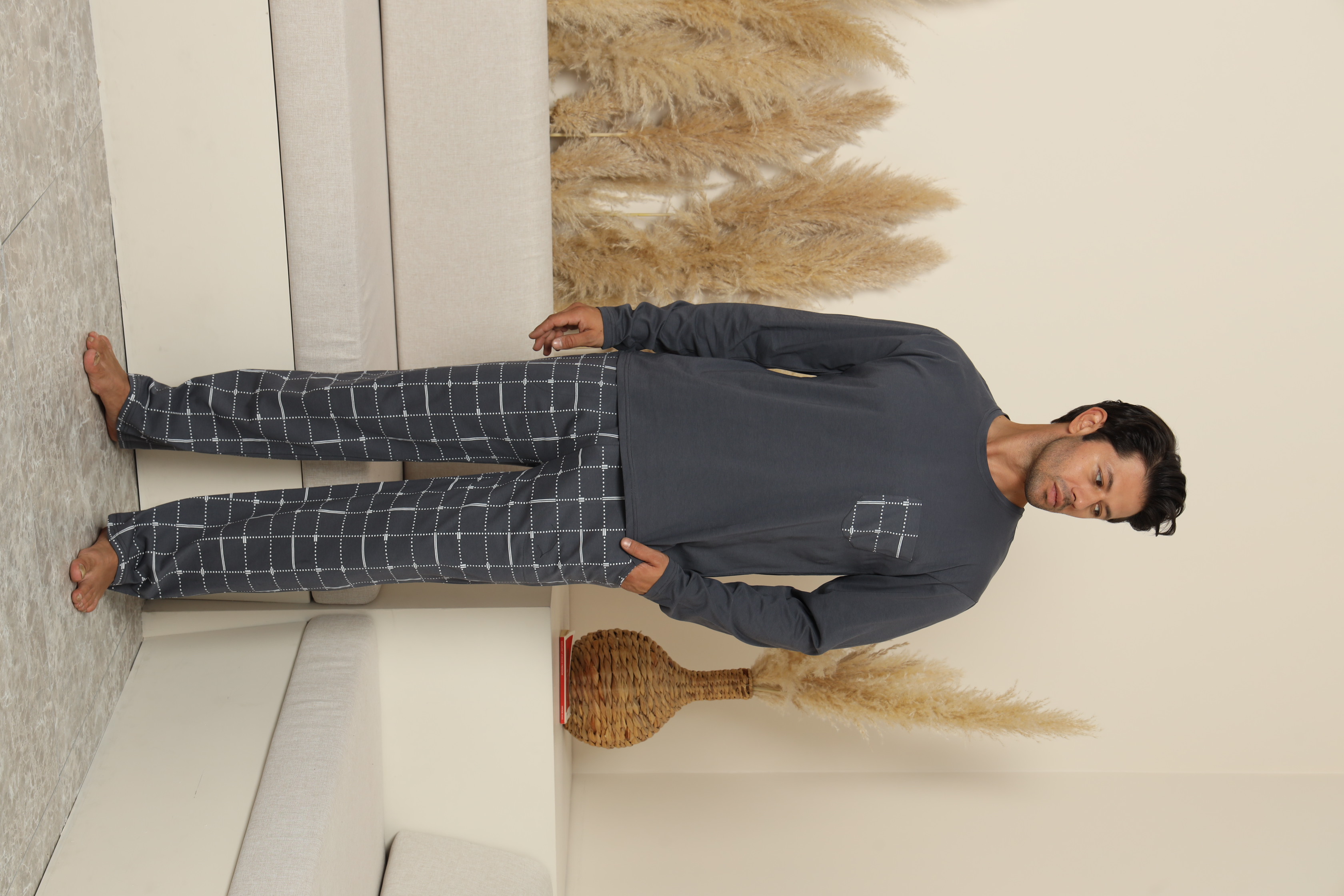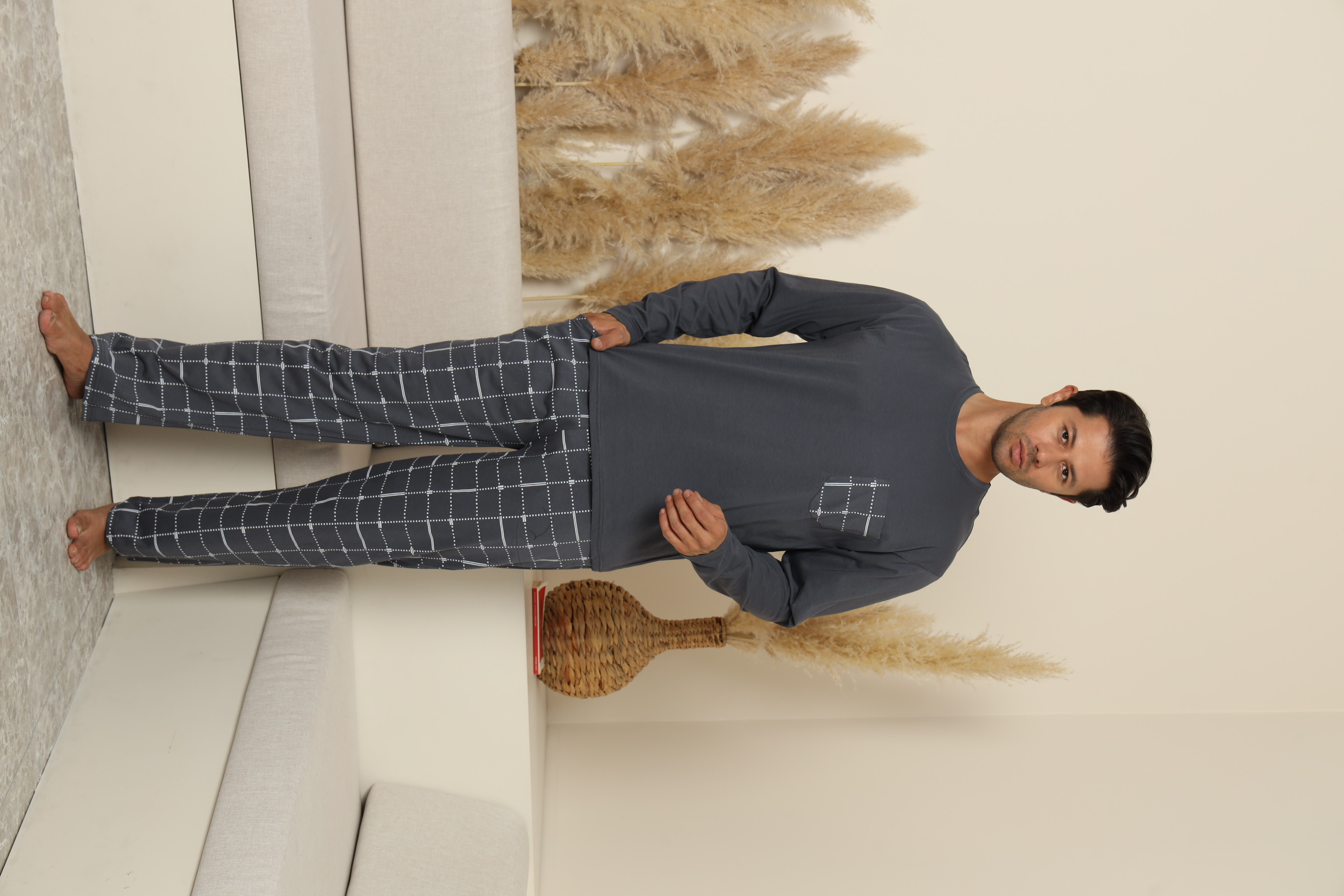 Pijama confortabilă pentru bărbați, cu bluză cu mâneci lungi și pantaloni lungi cu buzunare .Guler rotund si buzunar  atasat pe piept. Fabricată dintr-un material moale și respirabil, perfect pentru un somn odihnitor.