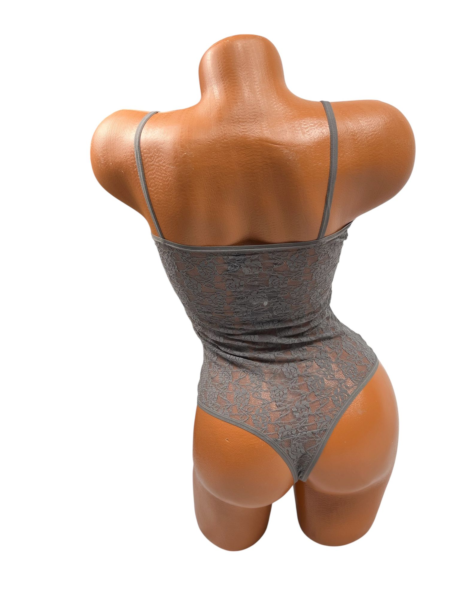 Body gri transparent din dantelă florală, cu bretele subtiri – perfect pentru un look elegant și provocator.