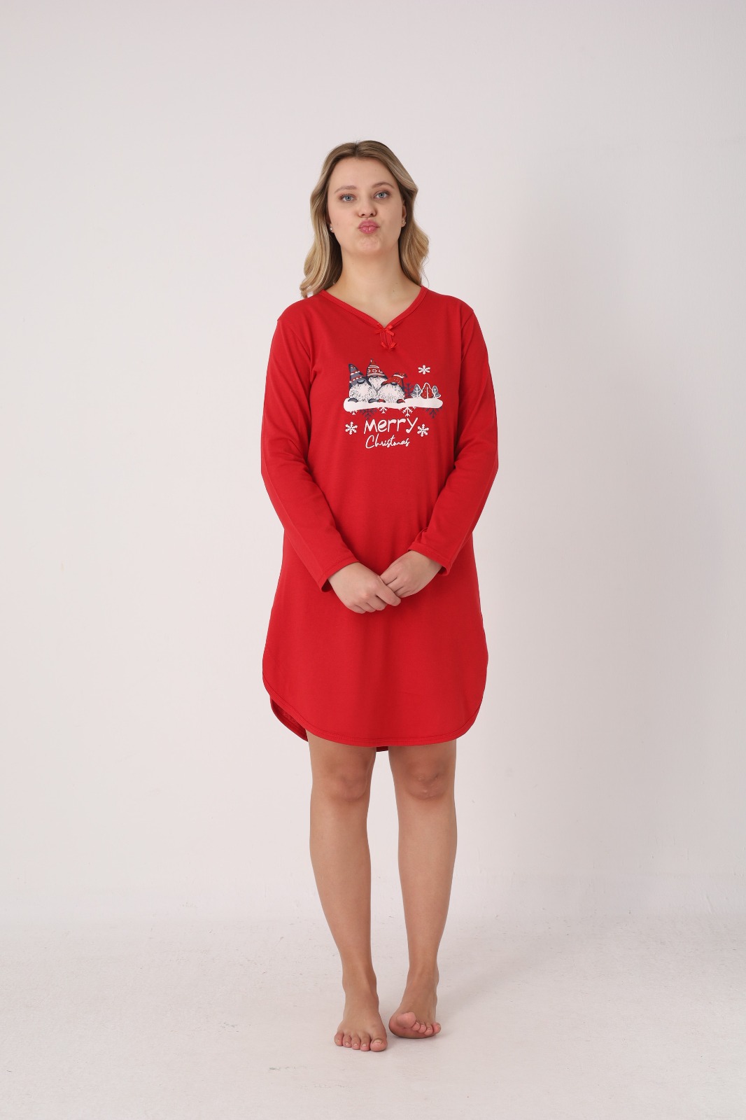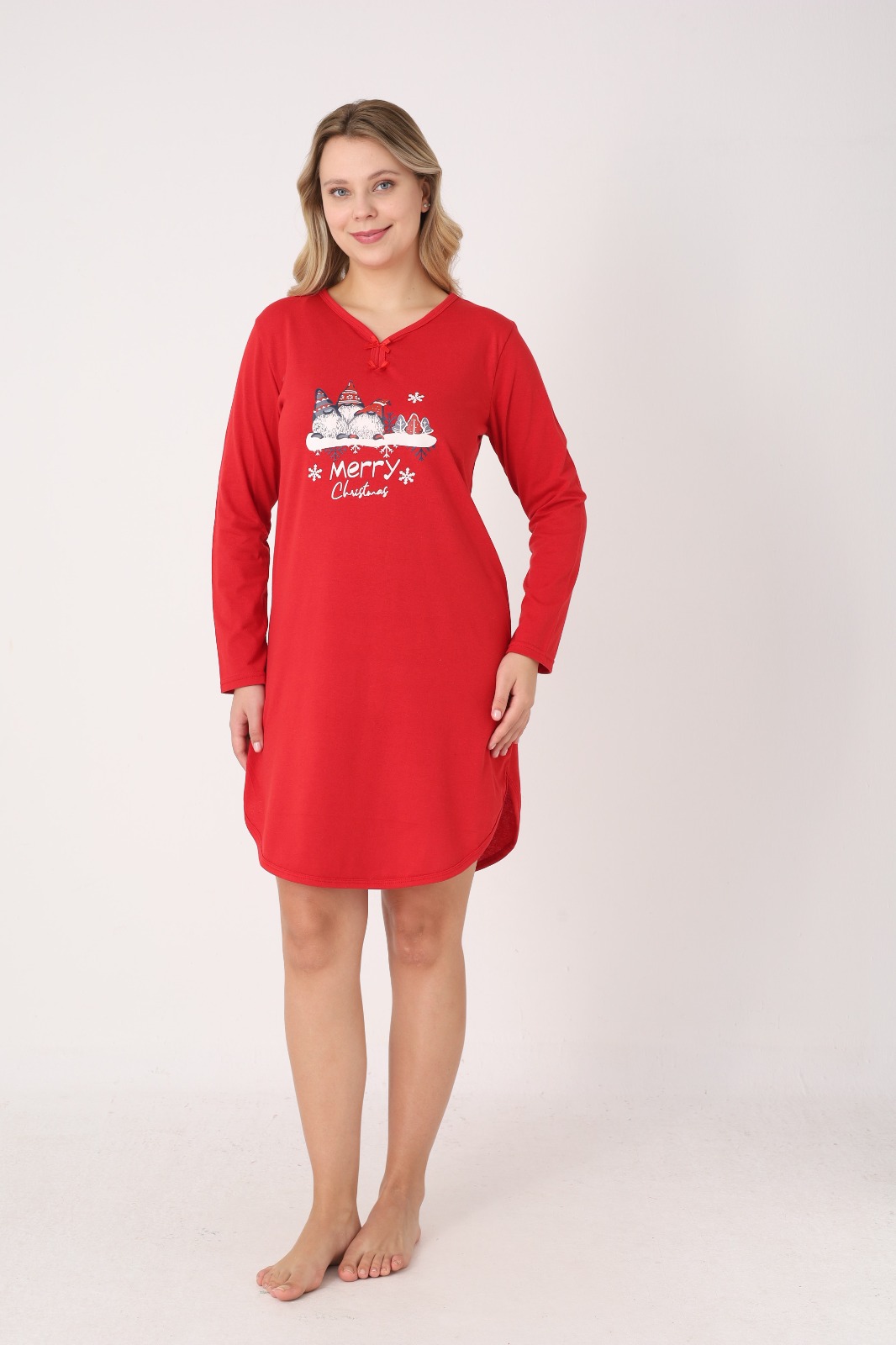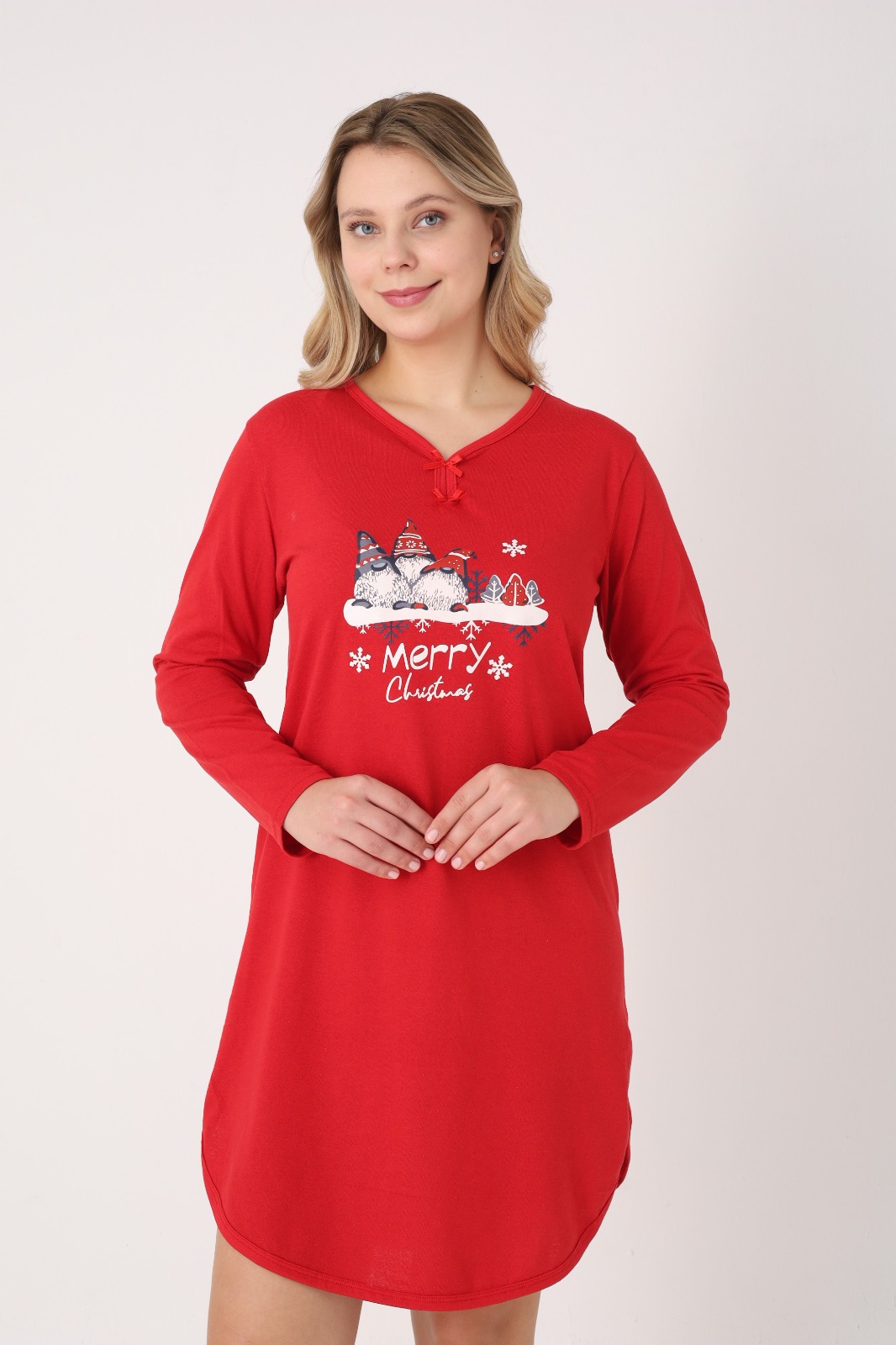 Bucură-te de confort și spirit festiv cu această cămașă de noapte pentru damă, perfectă pentru sezonul sărbătorilor. Realizată din material moale și plăcut la atingere, este ideală pentru nopți liniștite și momente de relaxare acasă. Modelul are croială lejeră, mâneci lungi și decolteu în V, accesorizat cu fundiță decorativă.