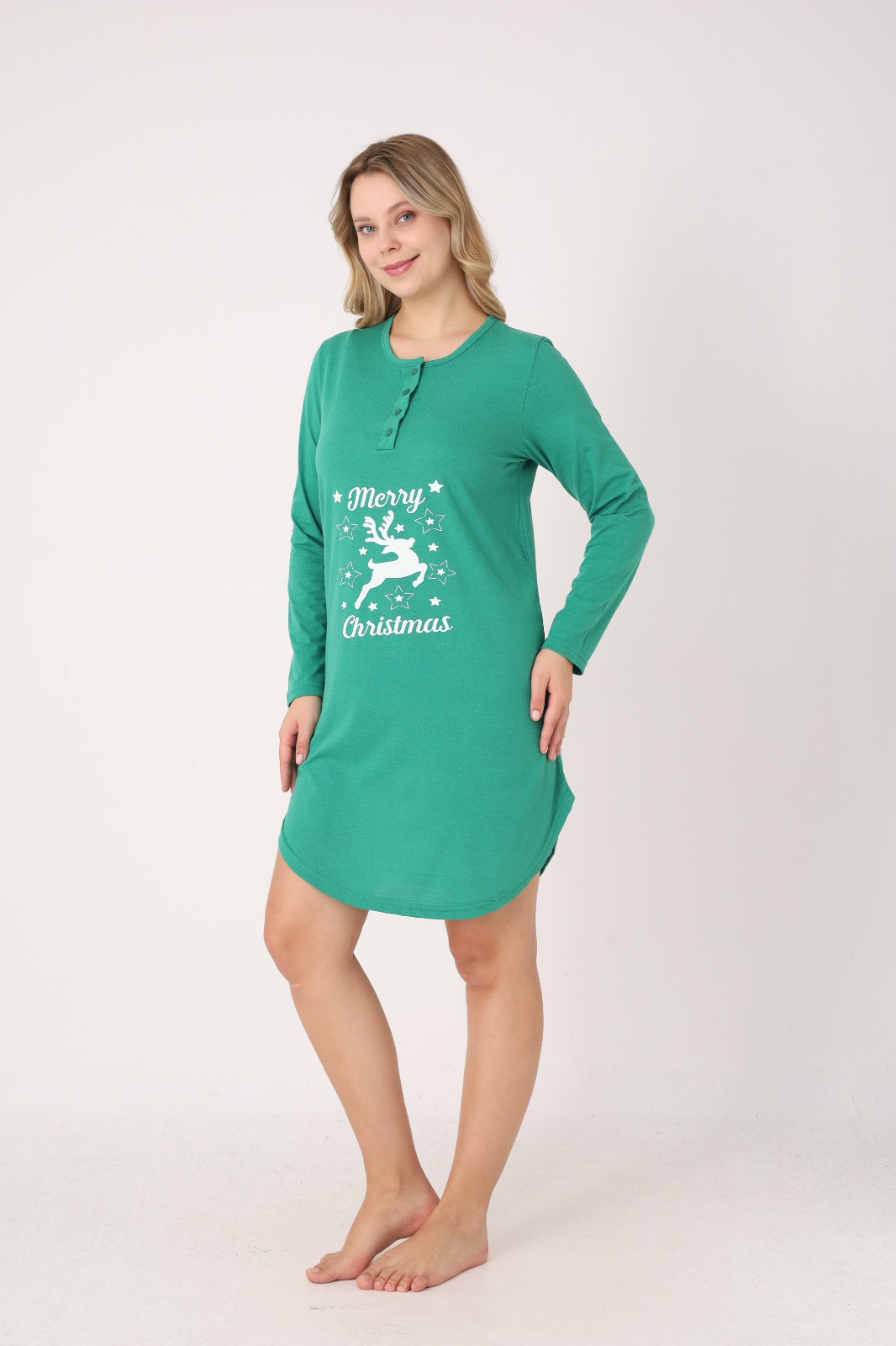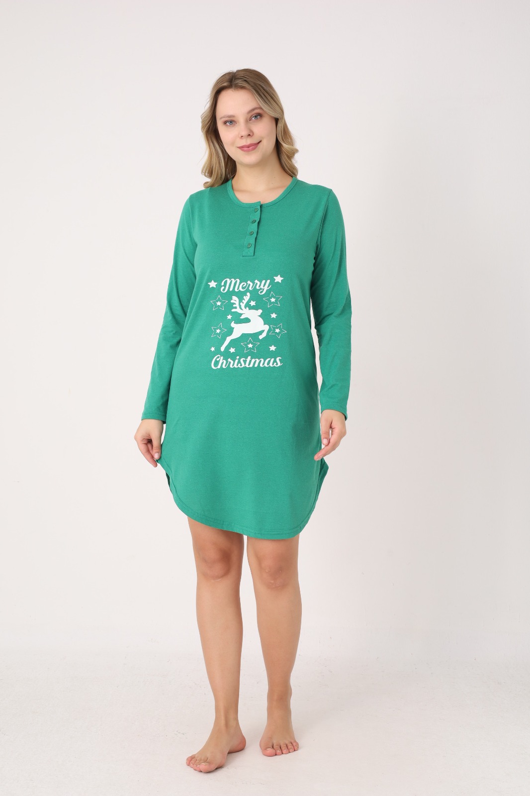 Cămașă de noapte pentru damă, cu design festiv de Crăciun. Modelul este realizat din material moale și confortabil, cu mâneci lungi și croială lejeră, ideală pentru relaxare sau somn. Are decolteu rotund cu nasturi decorativi în partea frontală.Lungimea este deasupra genunchilor, iar culoarea verde îi conferă un aer elegant și plăcut. Potrivită pentru serile de iarnă sau ca idee de cadou de sărbători.