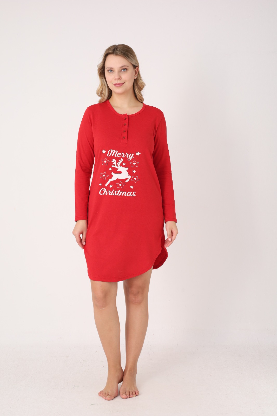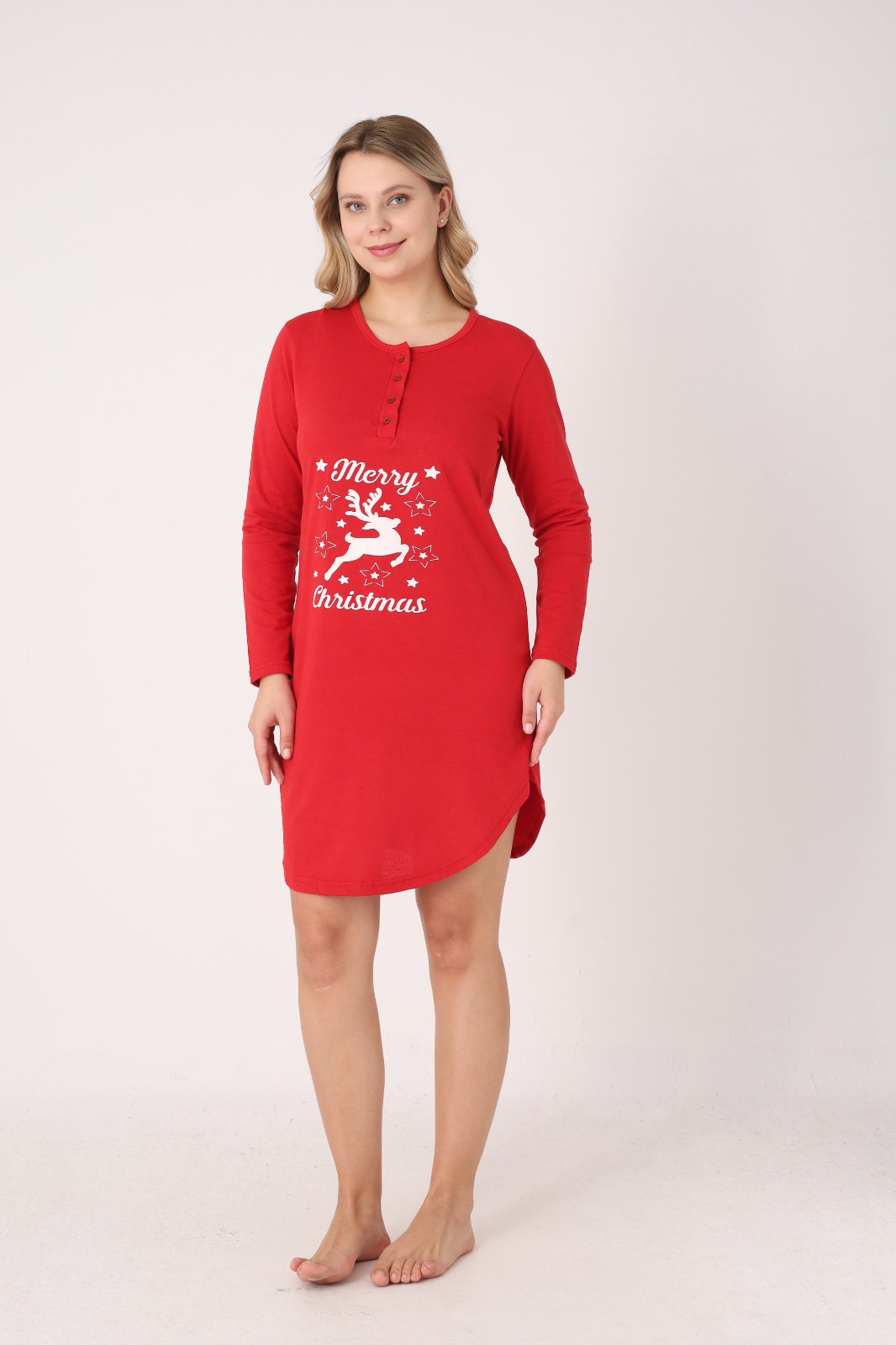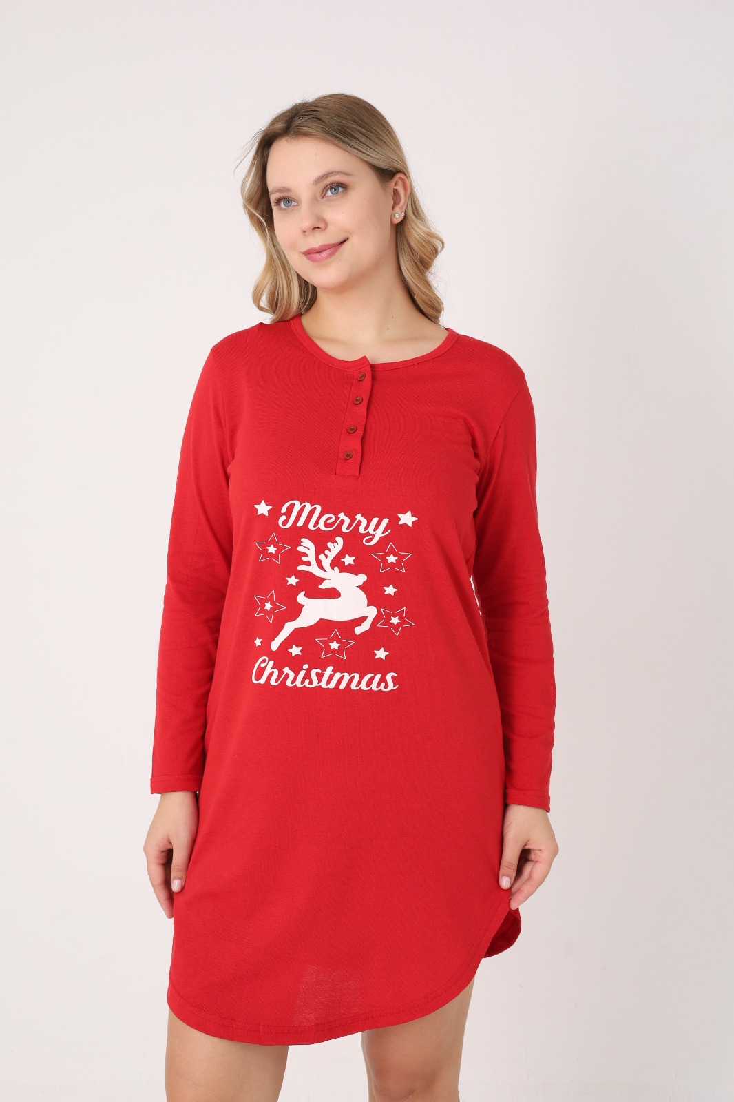 Cămașă de noapte pentru damă, cu design festiv de Crăciun. Modelul este realizat din material moale și confortabil, cu mâneci lungi și croială lejeră, ideală pentru relaxare sau somn. Are decolteu rotund cu nasturi decorativi în partea frontală.Lungimea este deasupra genunchilor, iar culoarea verde îi conferă un aer elegant și plăcut. Potrivită pentru serile de iarnă sau ca idee de cadou de sărbători.
