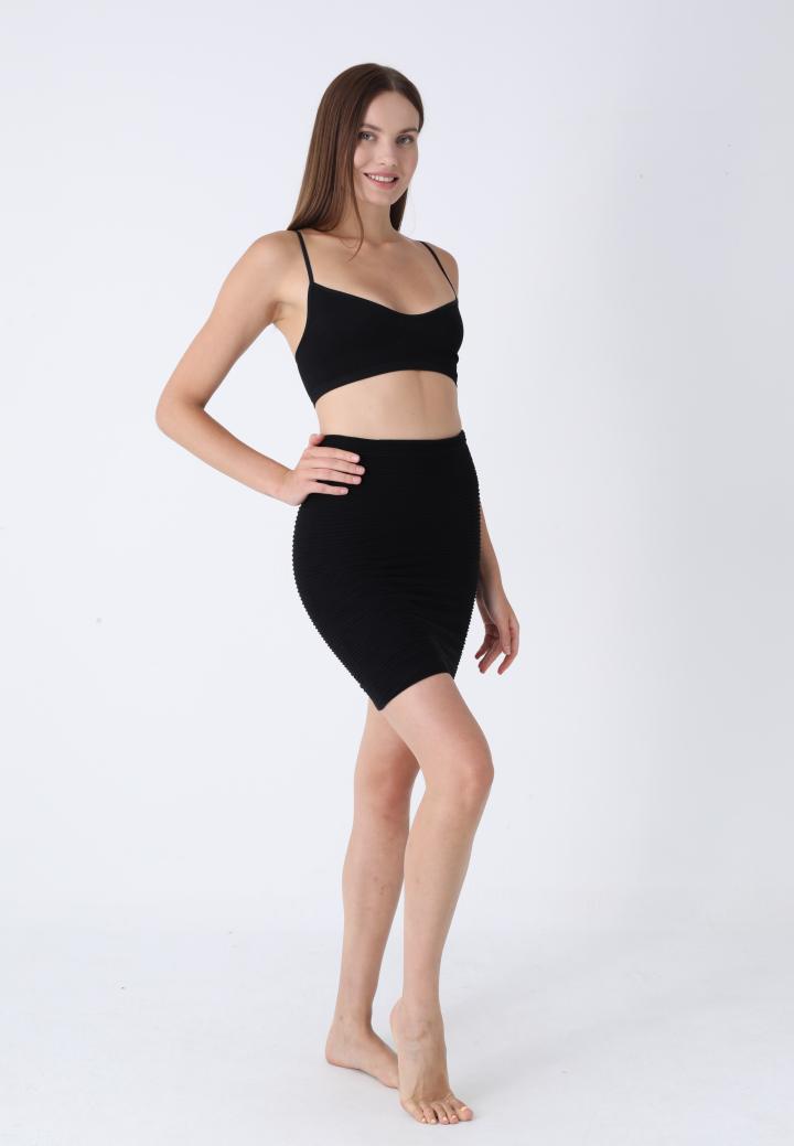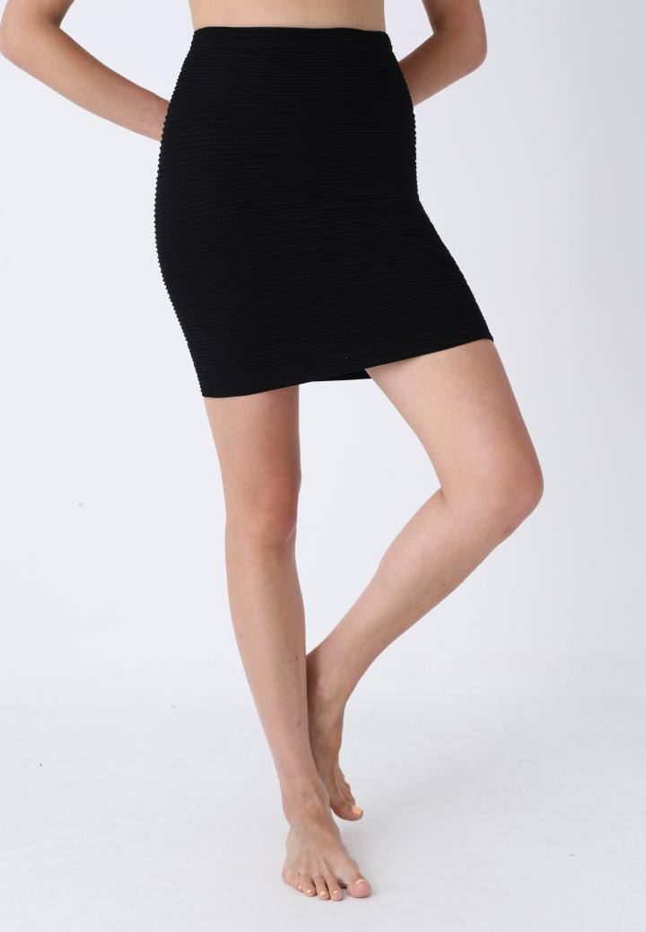 Fustă de lungime medie, neagră cu dungi, din material elastic, fără cusături și fără elastic în talie, pentru o purtare confortabilă și un aspect modern.