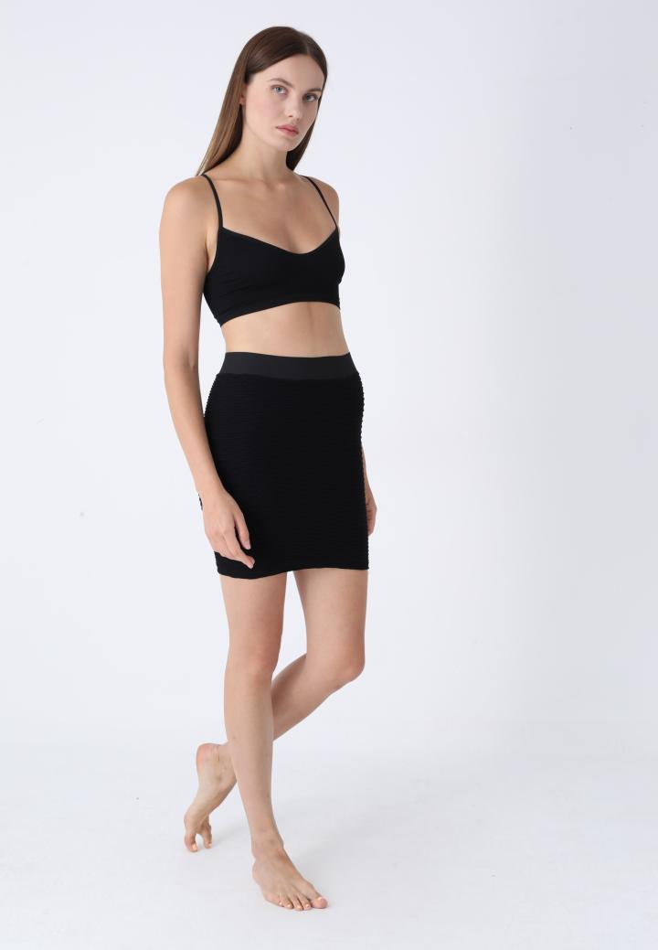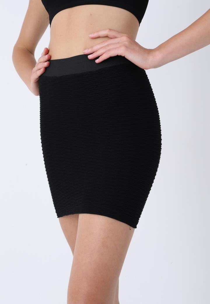 Fustă de lungime medie, neagră cu dungi, din material elastic, fără cusături și fără elastic în talie, pentru o purtare confortabilă și un aspect modern.