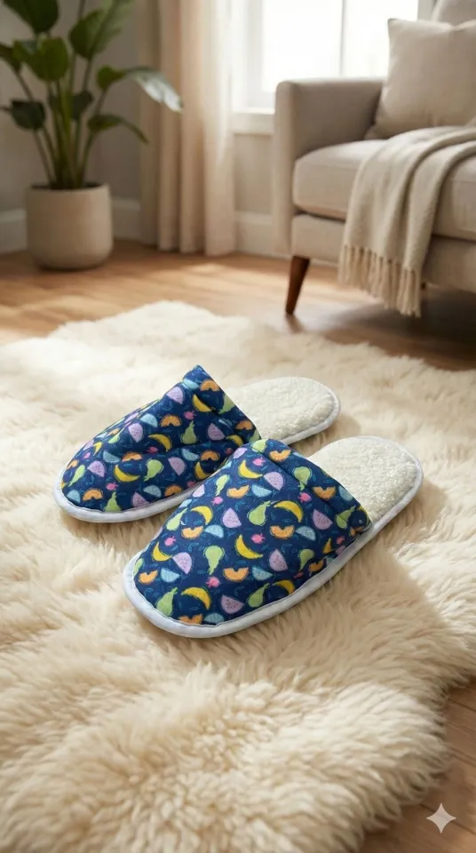 Papuci de damă pentru casă, bleumarin, cu imprimeu cu fructe și interior căptușit cu puf moale, ideali pentru confortul de zi cu zi.