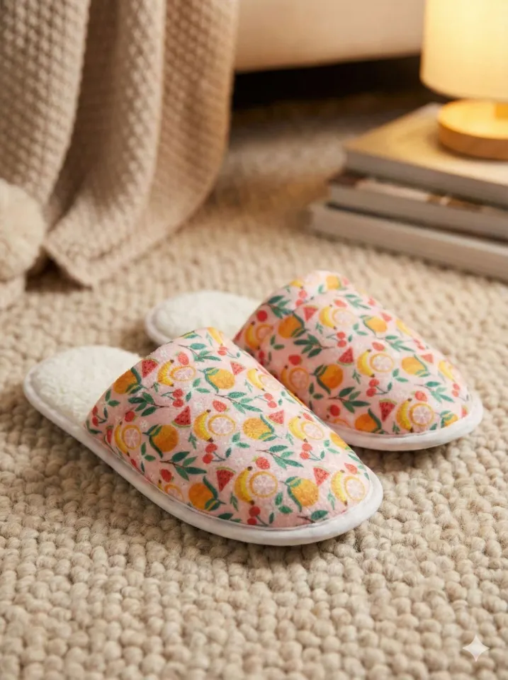 Acești papuci de damă în nuanță de roz aduc un plus de veselie și confort oricărei zile petrecute acasă. Imprimeul jucăuș cu fructe oferă un design modern și feminin, iar interiorul îmblănit cu puf moale asigură o senzație călduroasă și plăcută la fiecare pas.