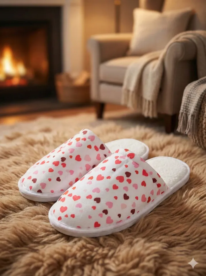 Răsfață-te acasă cu acești papuci albi pentru damă, decorați cu inimioare drăguțe și cu puf pentru extra confort și căldură.