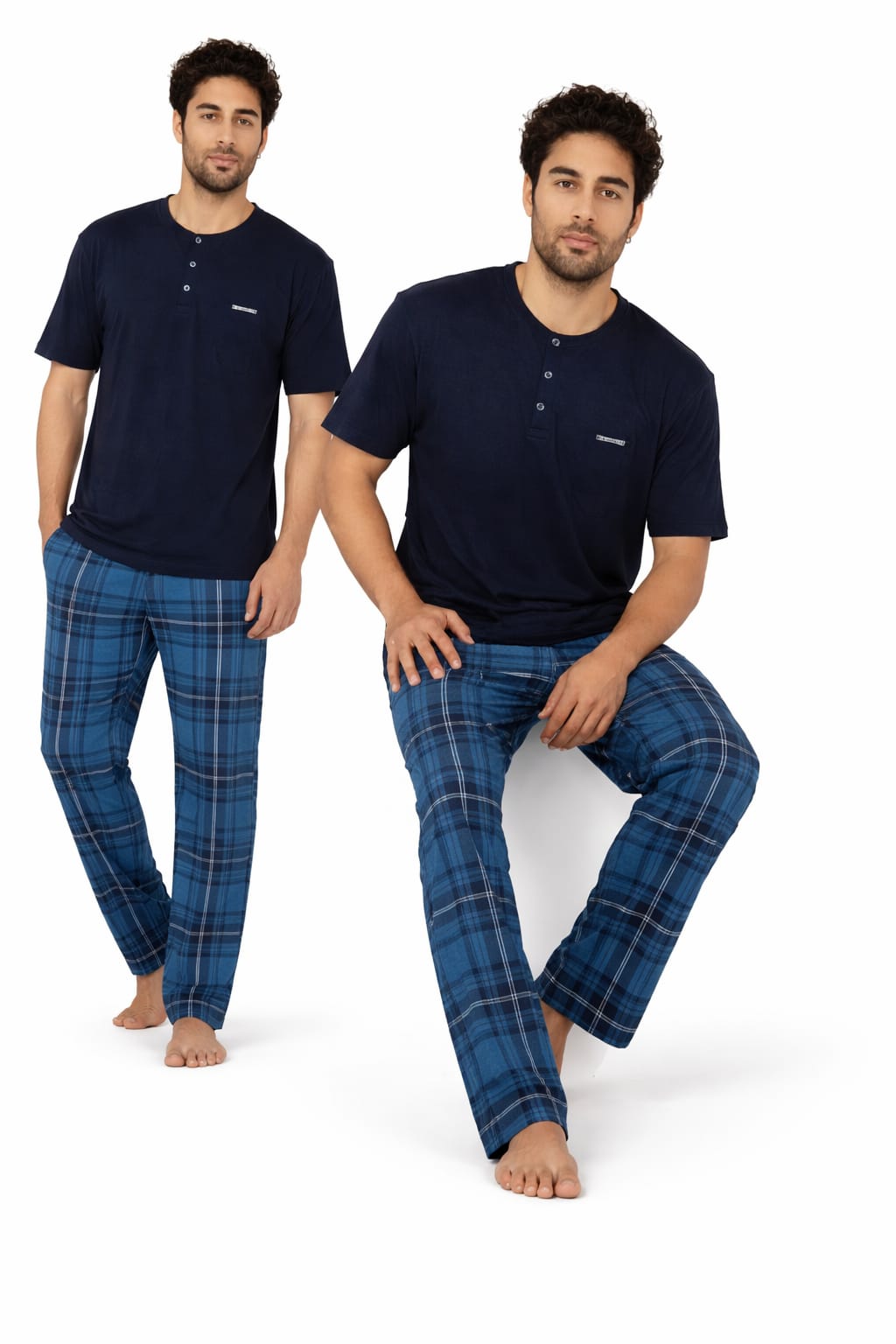 Pijamă bărbătească confortabilă, ideală pentru un somn odihnitor sau momente de relaxare acasă. Setul este compus din tricou cu mânecă scurtă și pantaloni lungi asortați.Materialul este moale și plăcut la atingere, asigurând confort pe tot parcursul nopții. Designul practic și croiala lejeră oferă libertate de mișcare și un aspect îngrijit.