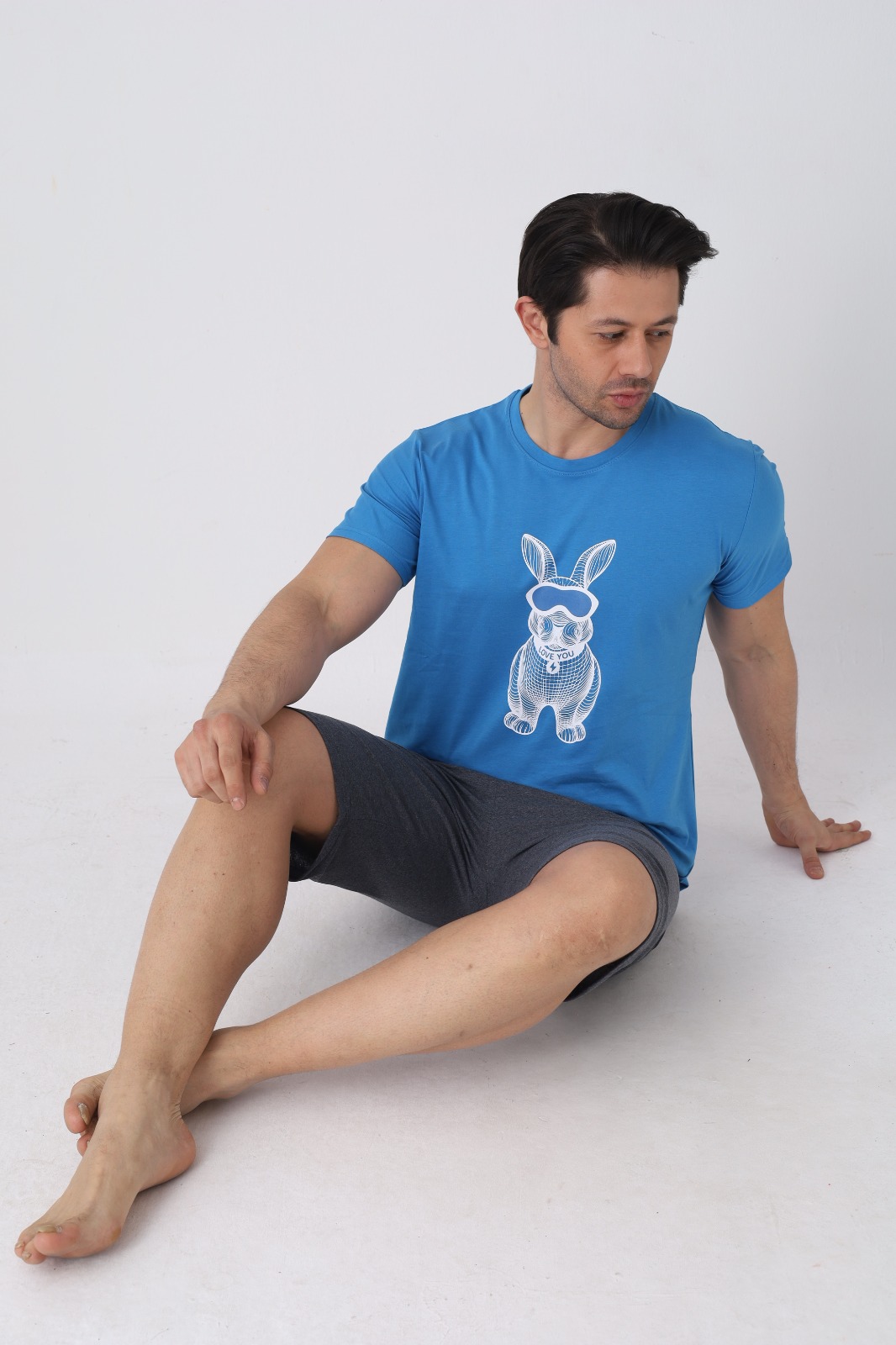 Pijama pentru bărbați, confortabilă și practică, perfectă pentru nopțile călduroase și pentru momentele de relaxare acasă. Setul este format dintr-un tricou cu mânecă scurtă și pantaloni 3/4, oferind lejeritate și libertate de mișcare.