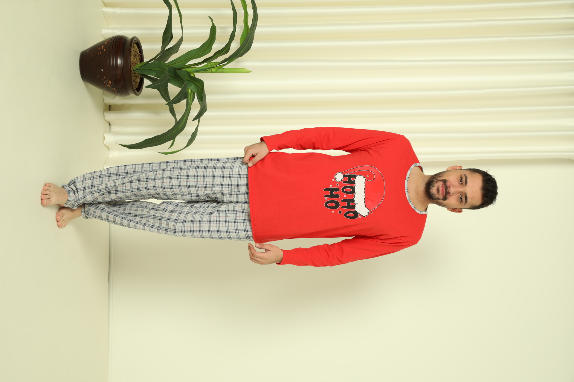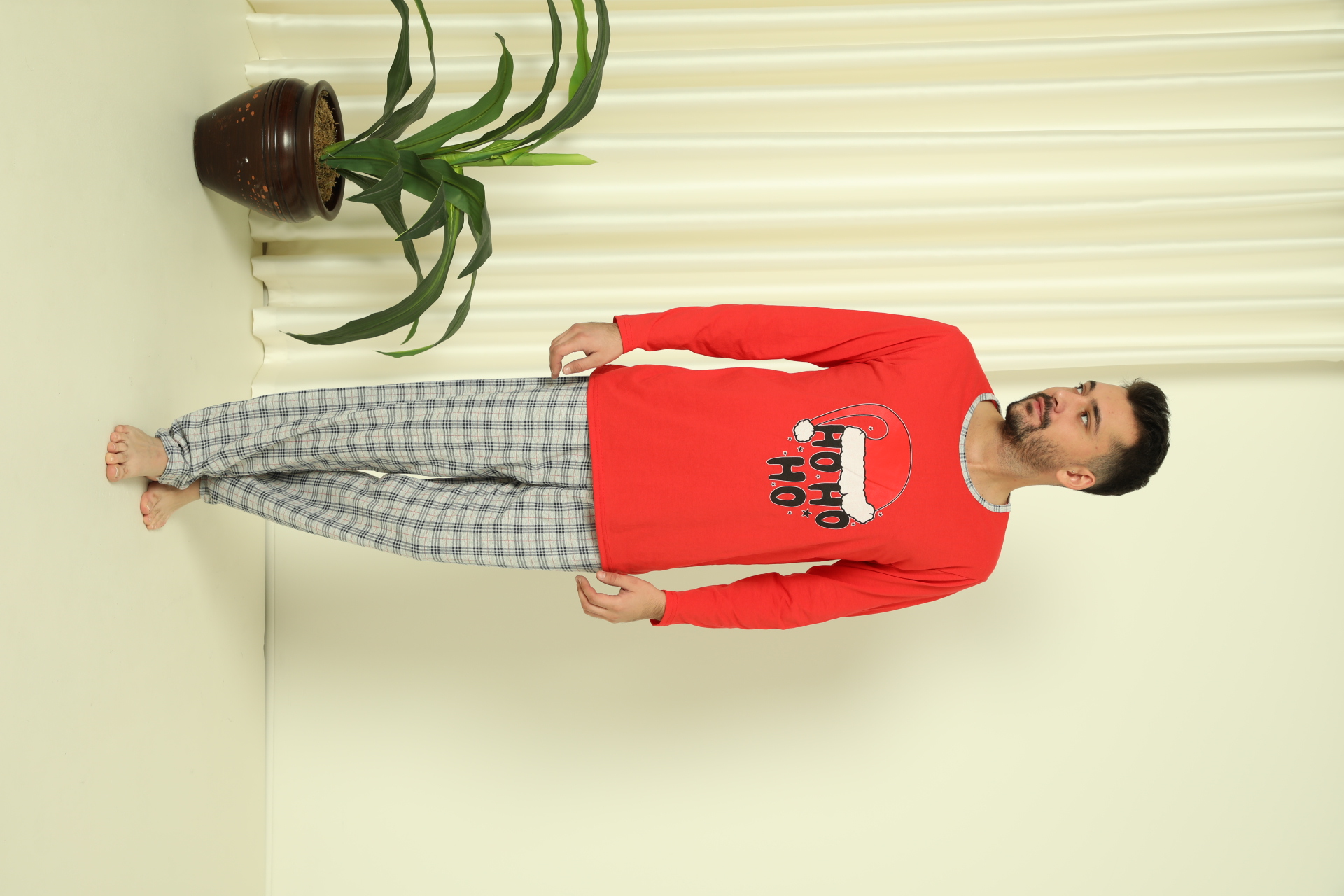 Pijama barbati Craciun "HO HO" maneca lunga ,pantaloni lungi,Culoare Rosu, Engros