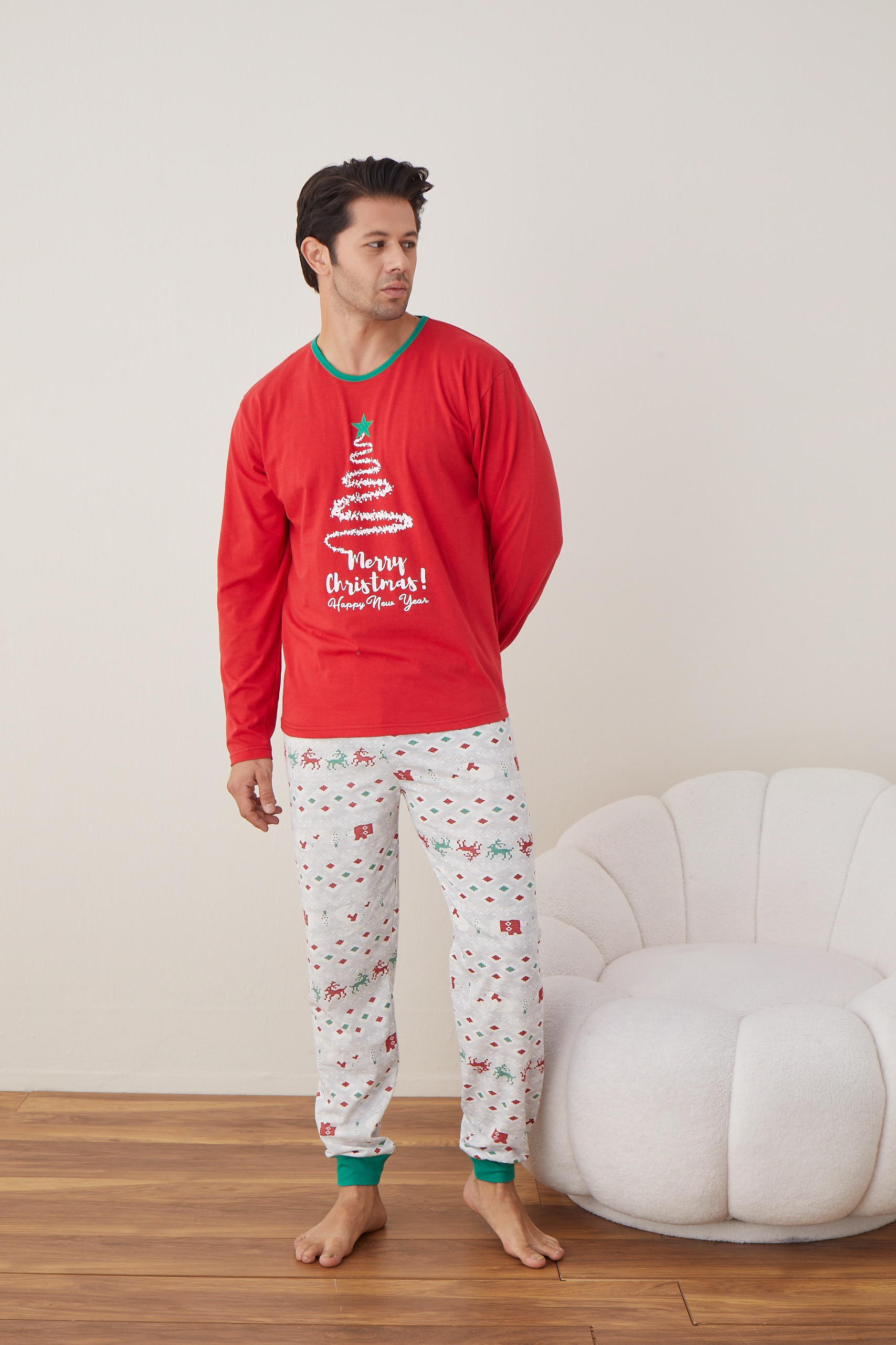 Pijama barbati Craciun " Merry Chrystmas " maneca lunga ,pantaloni lungi,Culoare Rosu Engros