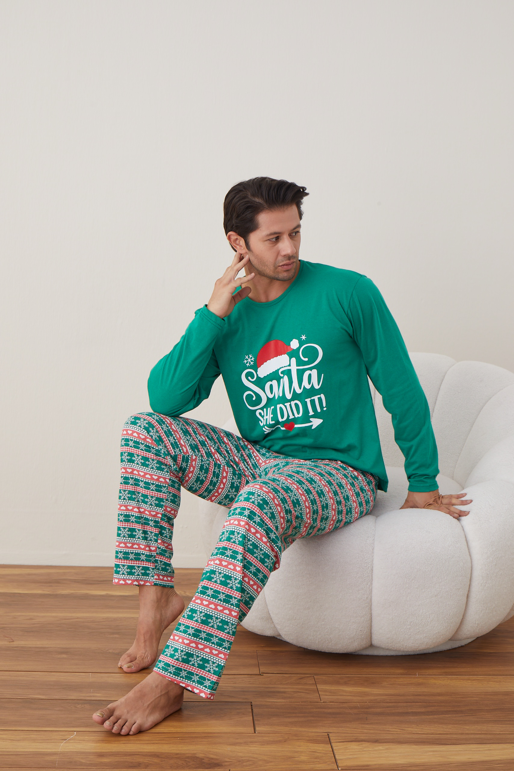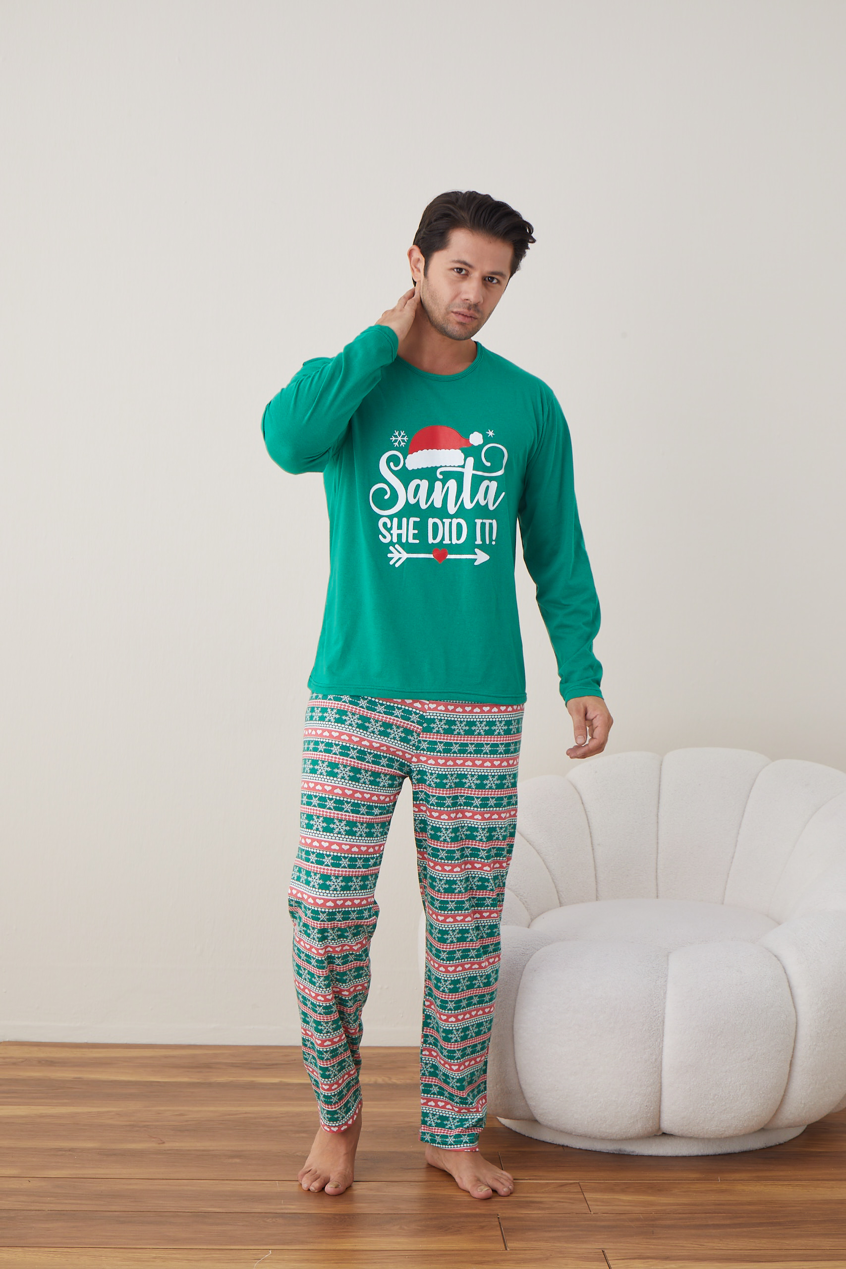 Pijama barbati Craciun "SANTA SHE DID IT" , maneca lunga ,pantaloni lungi,Culoare Verde,Engros
