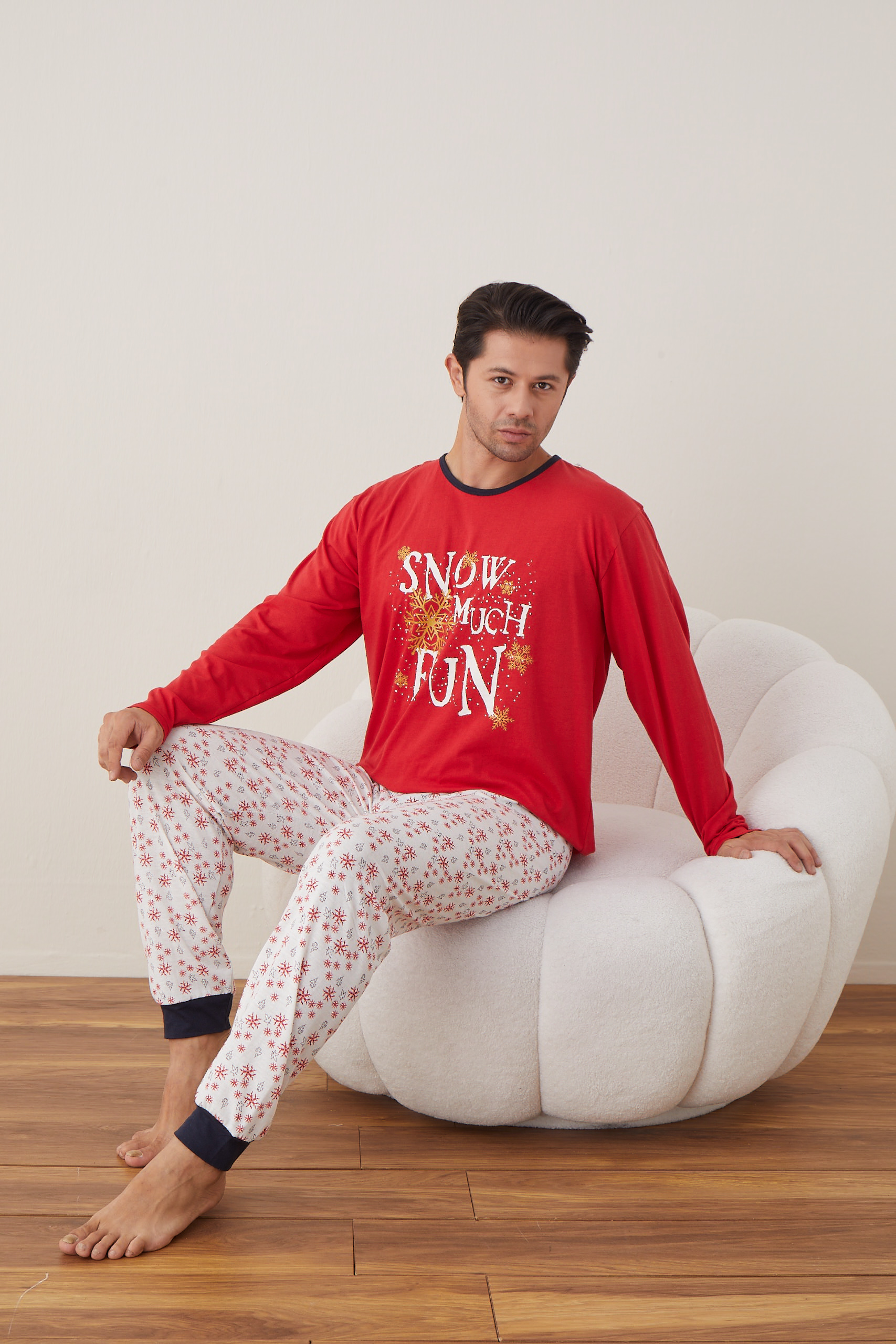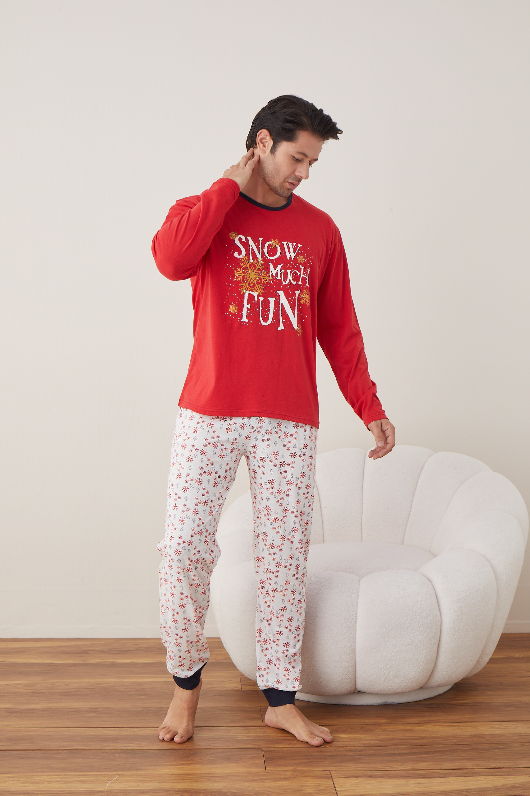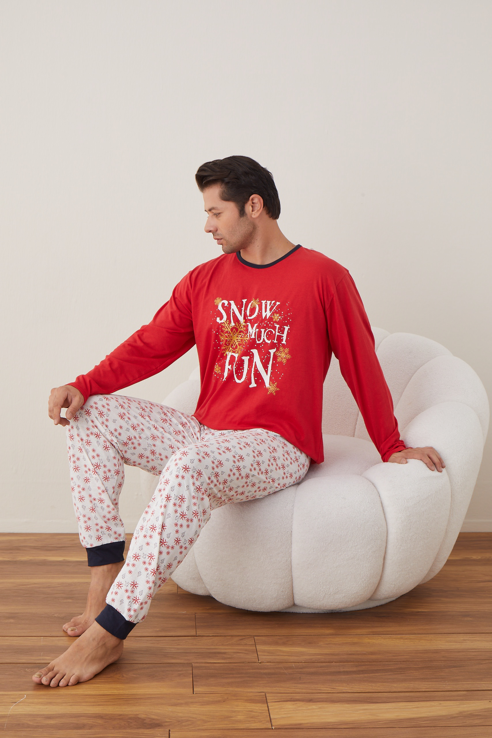 Pijama barbati Craciun "SNOW MUCH FUN" , maneca lunga ,pantaloni lungi,Culoare Rosu ,Engros