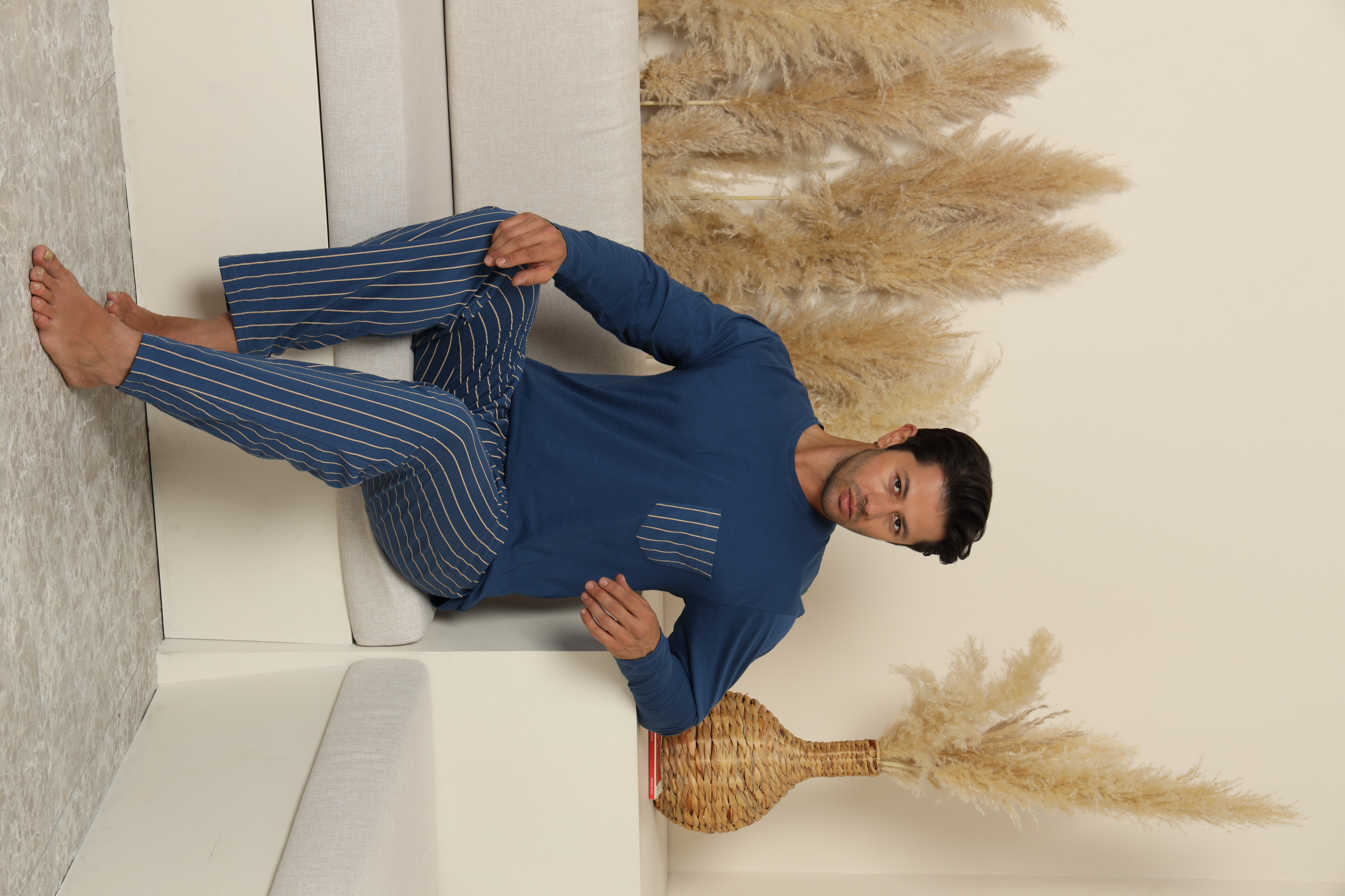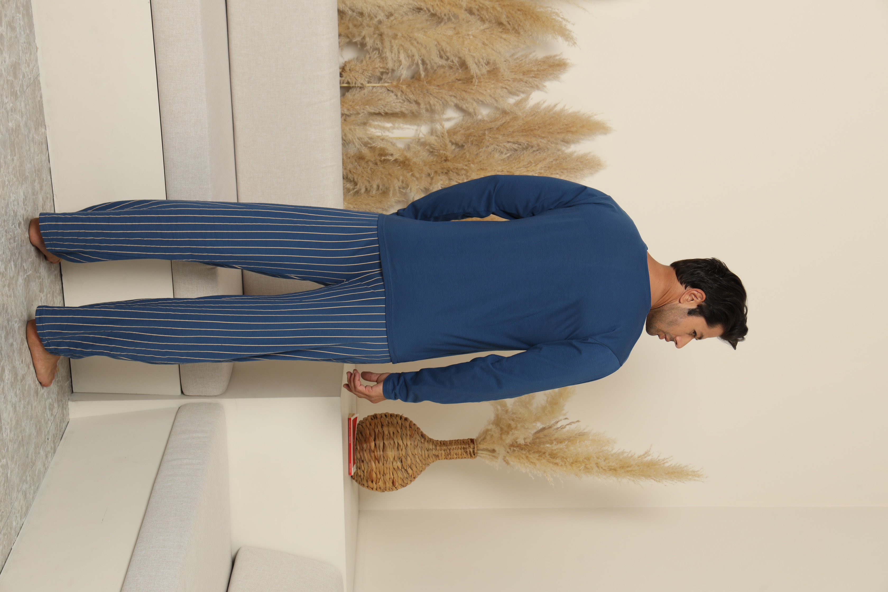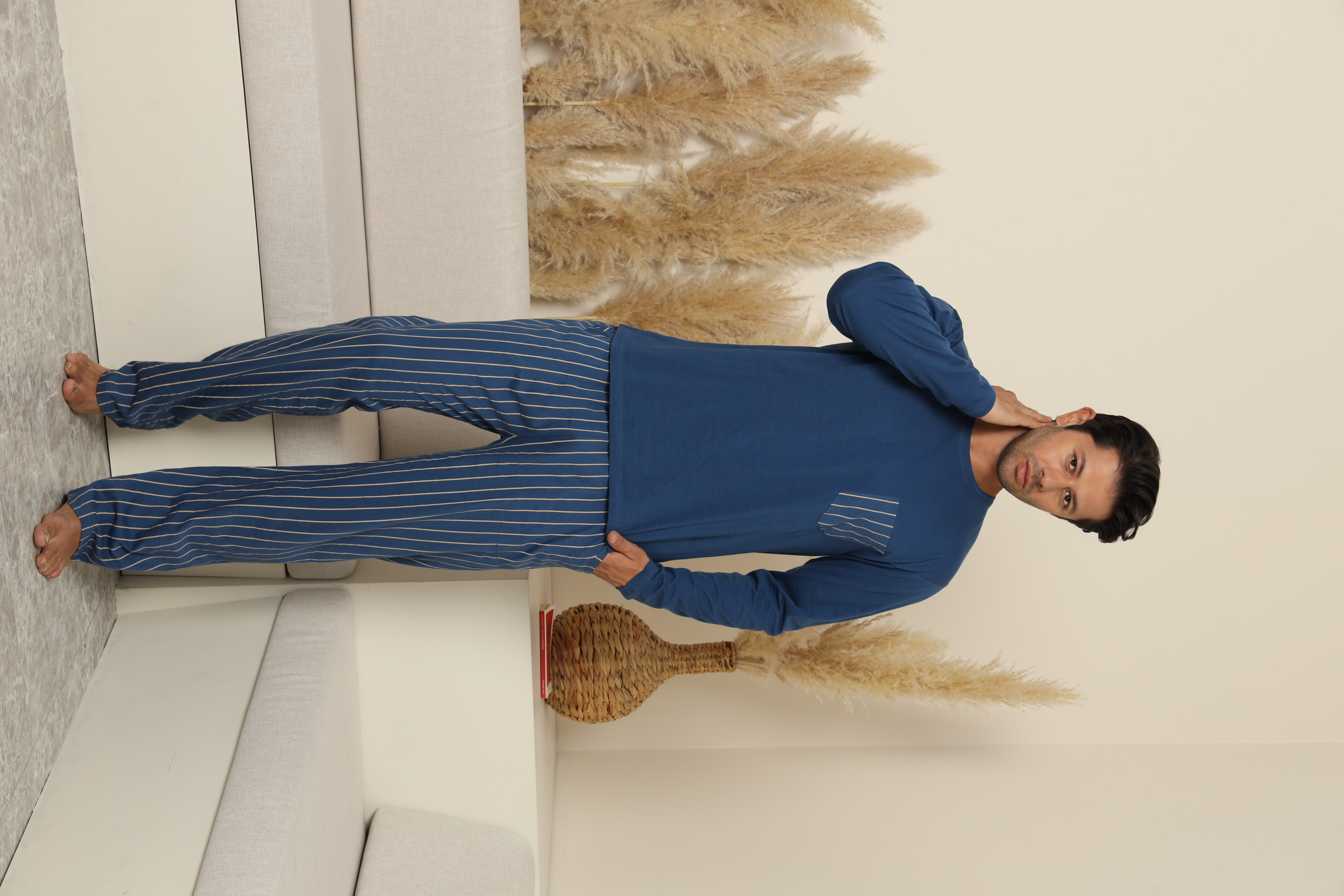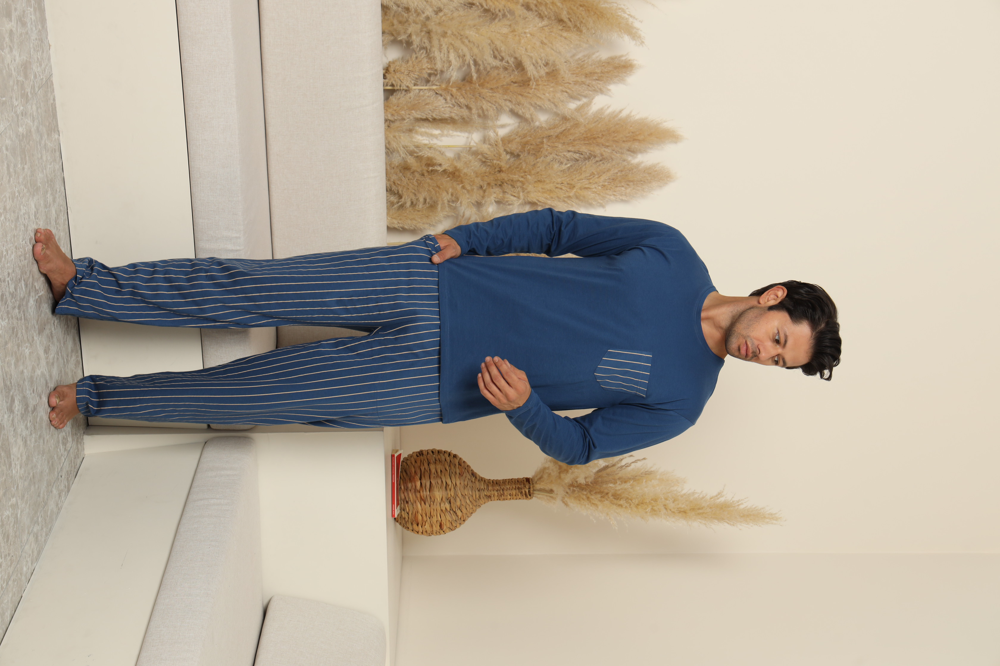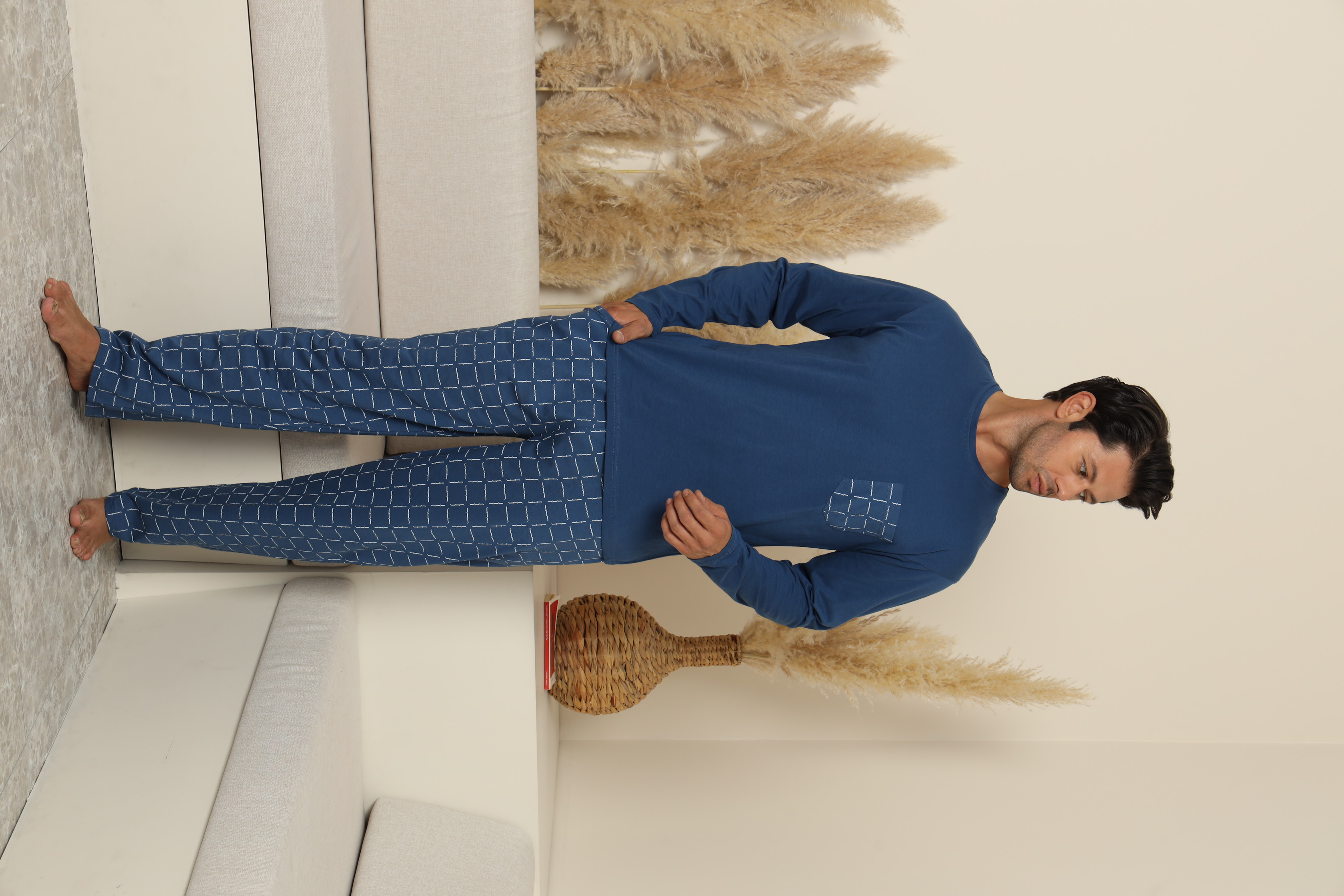 Pijama confortabilă pentru bărbați, cu bluză cu mâneci lungi și pantaloni lungi cu buzunare .Guler rotund si buzunar  atasat pe piept. Fabricată dintr-un material moale și respirabil, perfect pentru un somn odihnitor.