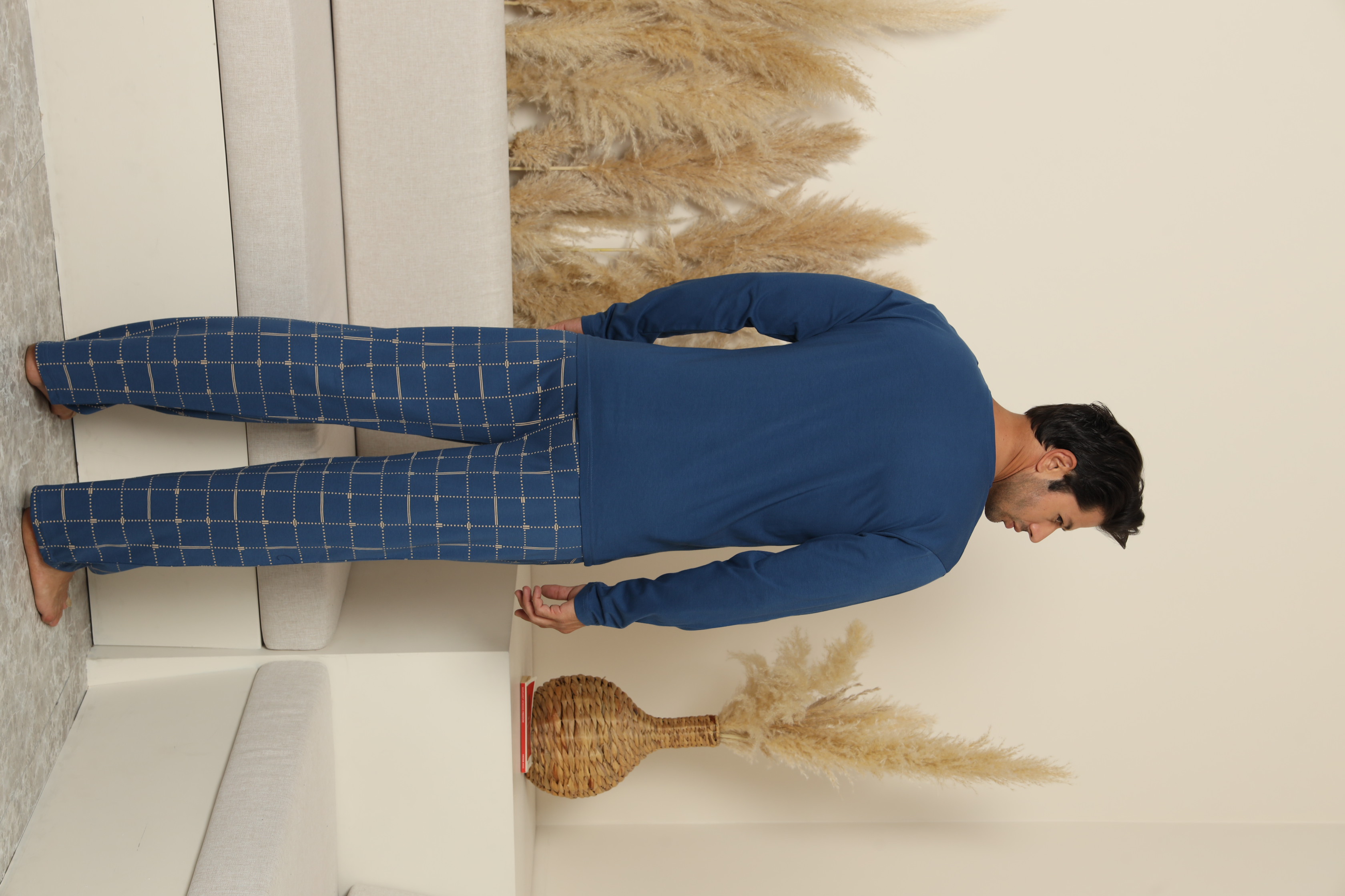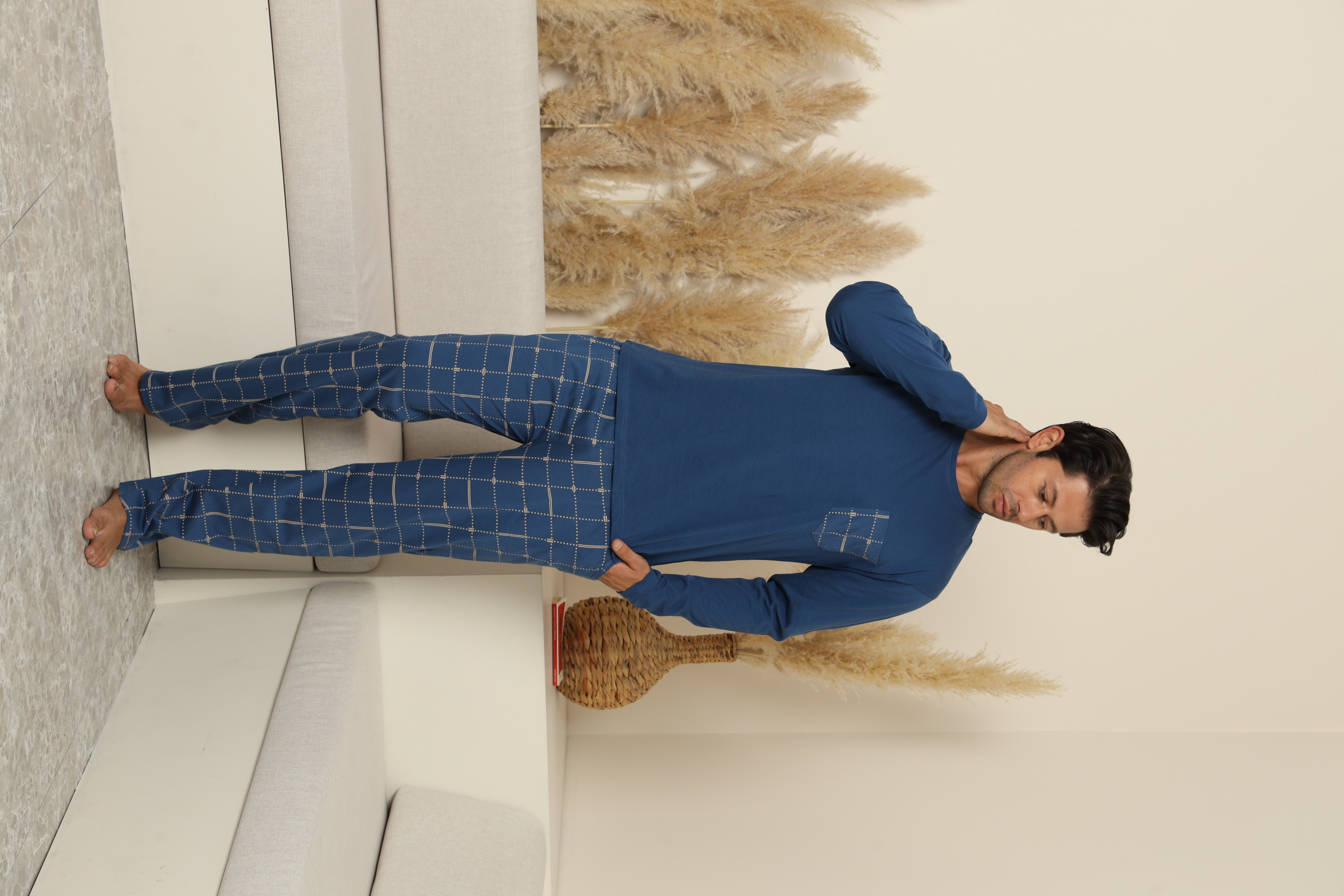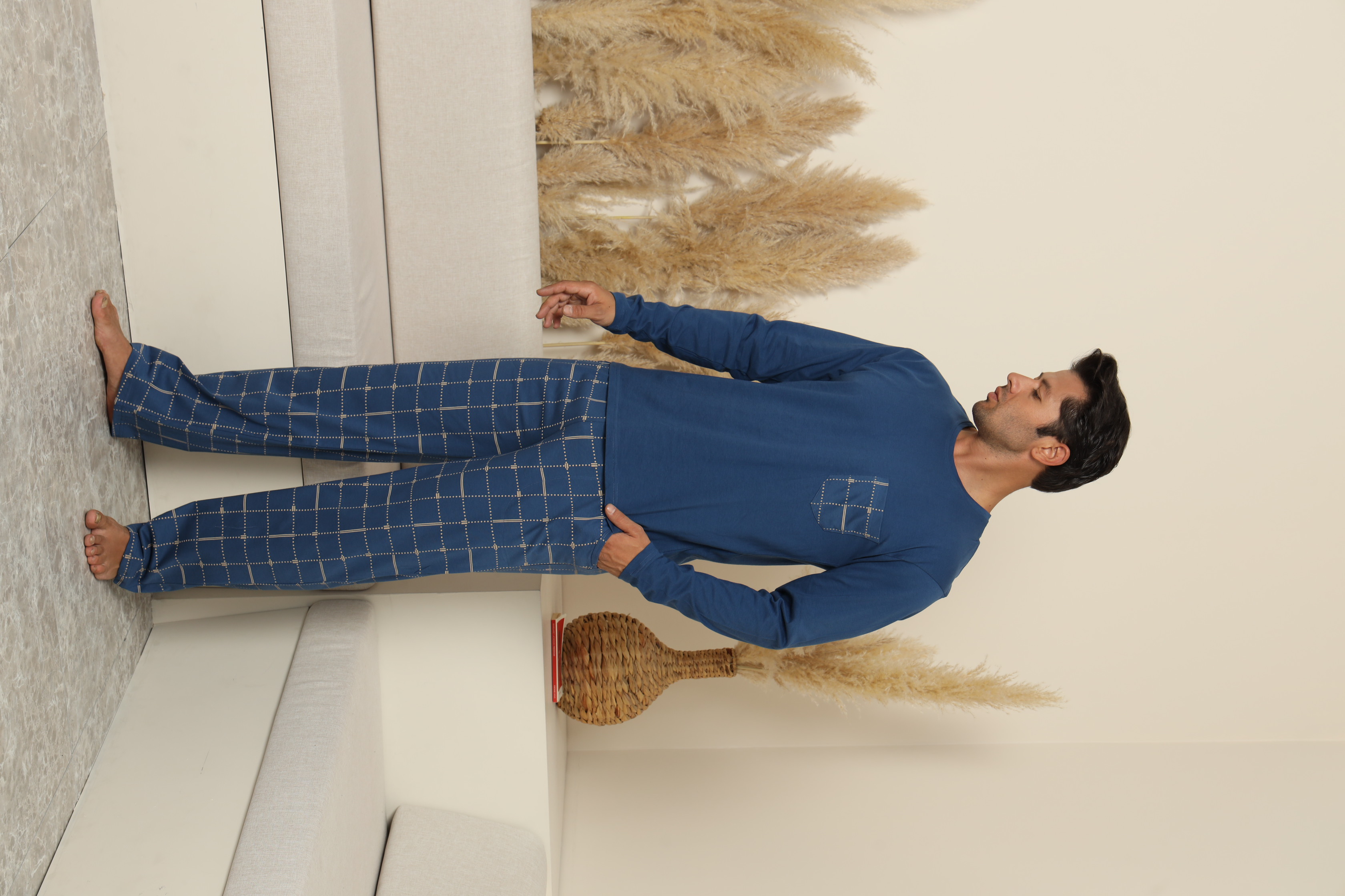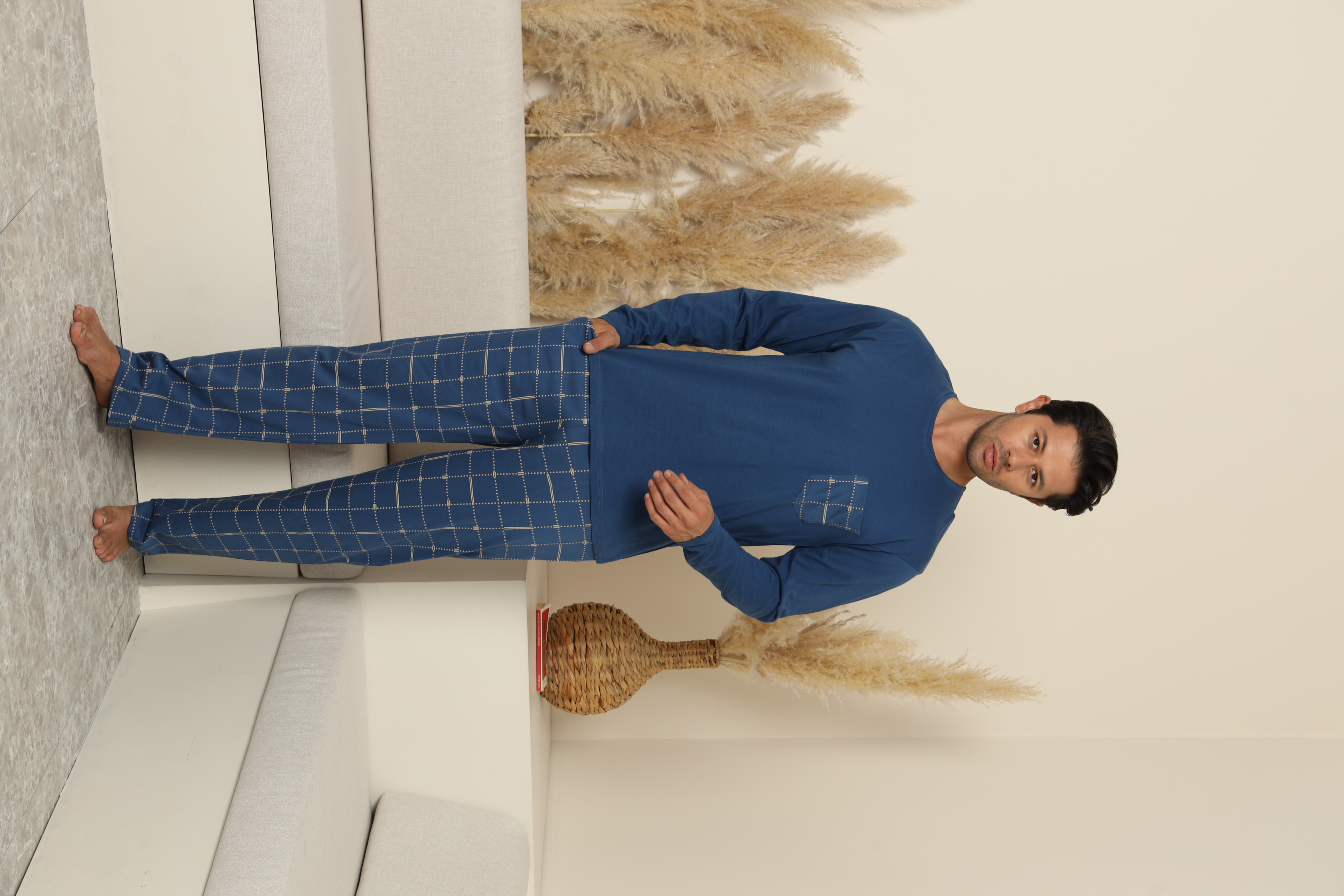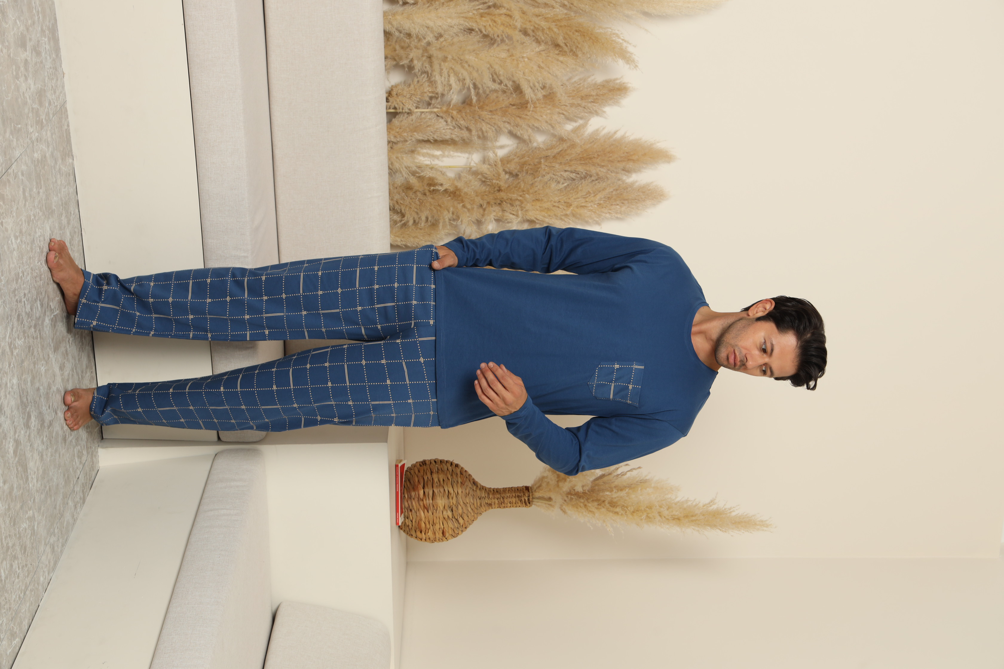 Pijama confortabilă pentru bărbați, cu bluză cu mâneci lungi și pantaloni lungi cu buzunare .Guler rotund si buzunar  atasat pe piept. Fabricată dintr-un material moale și respirabil, perfect pentru un somn odihnitor.