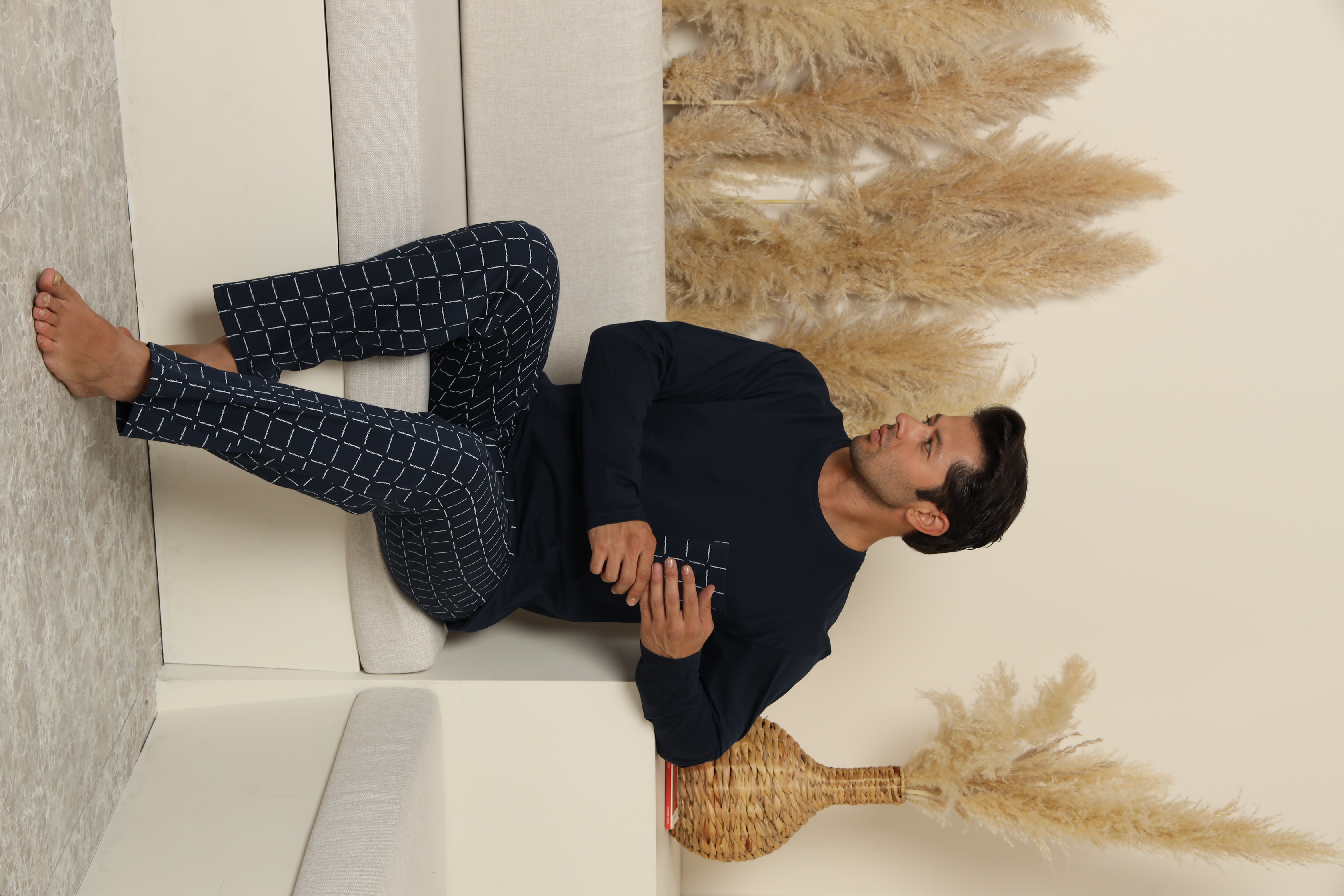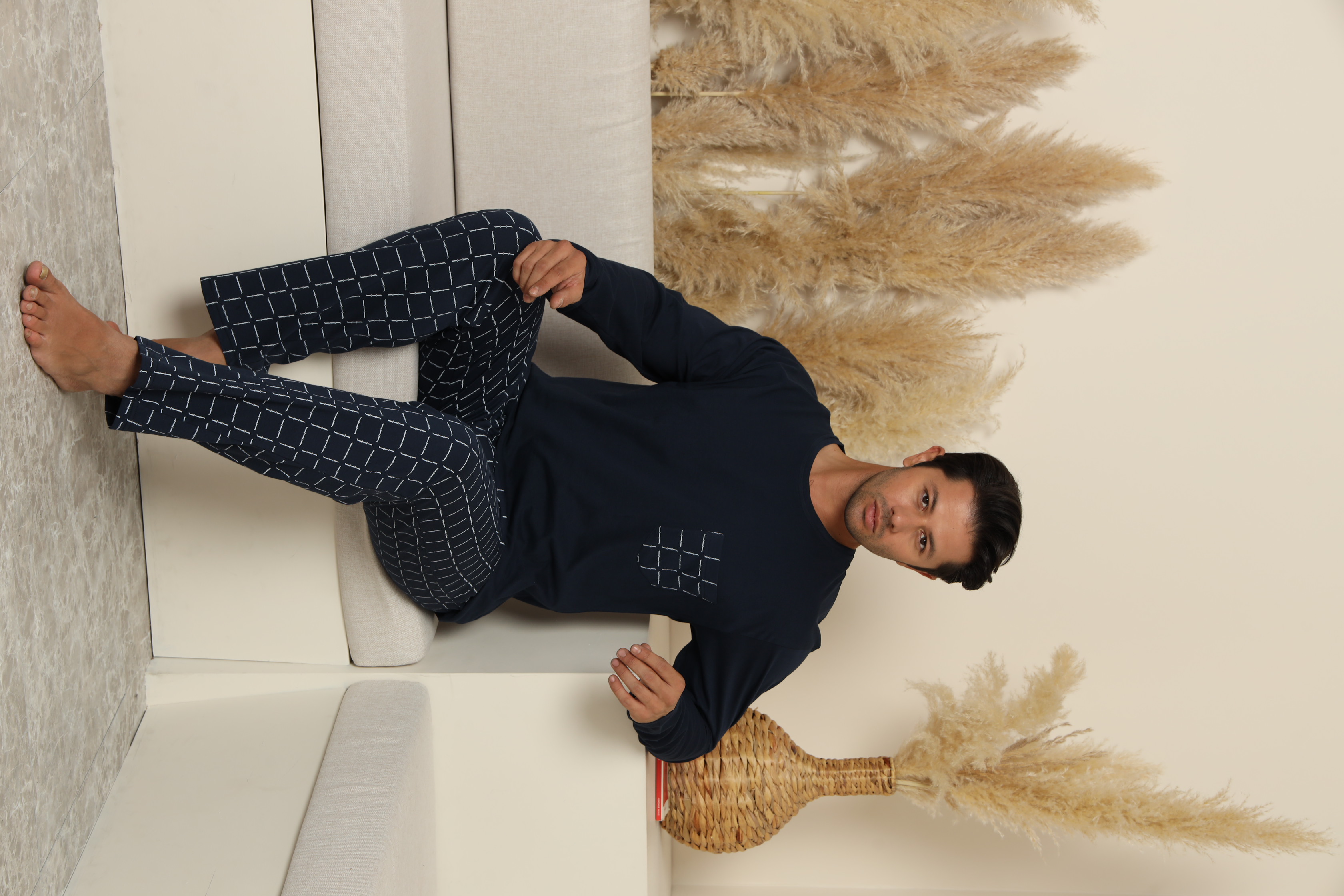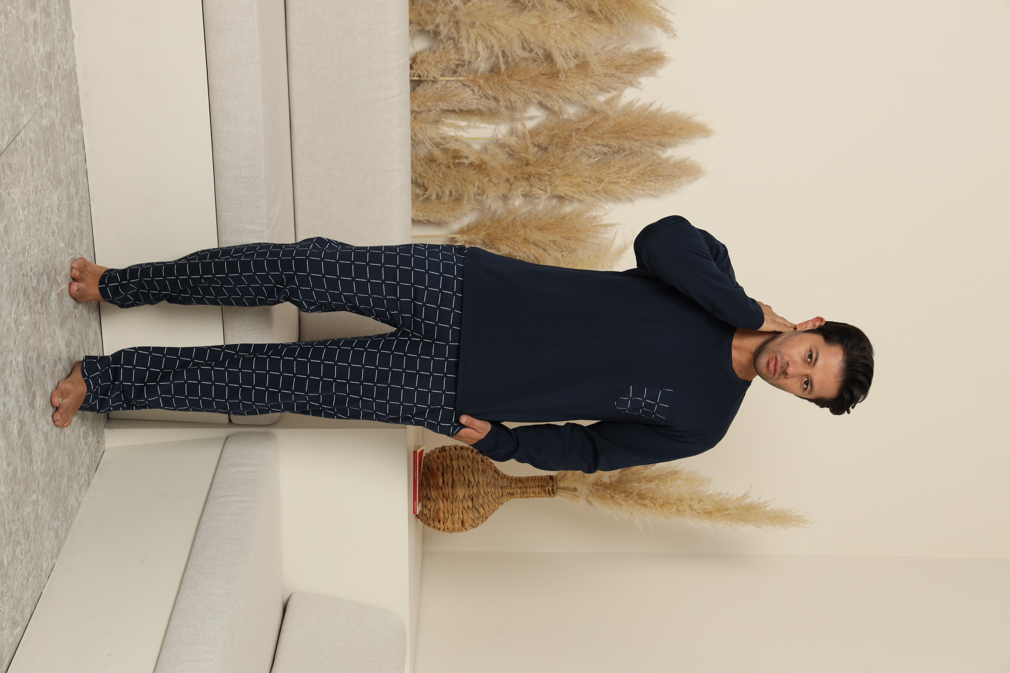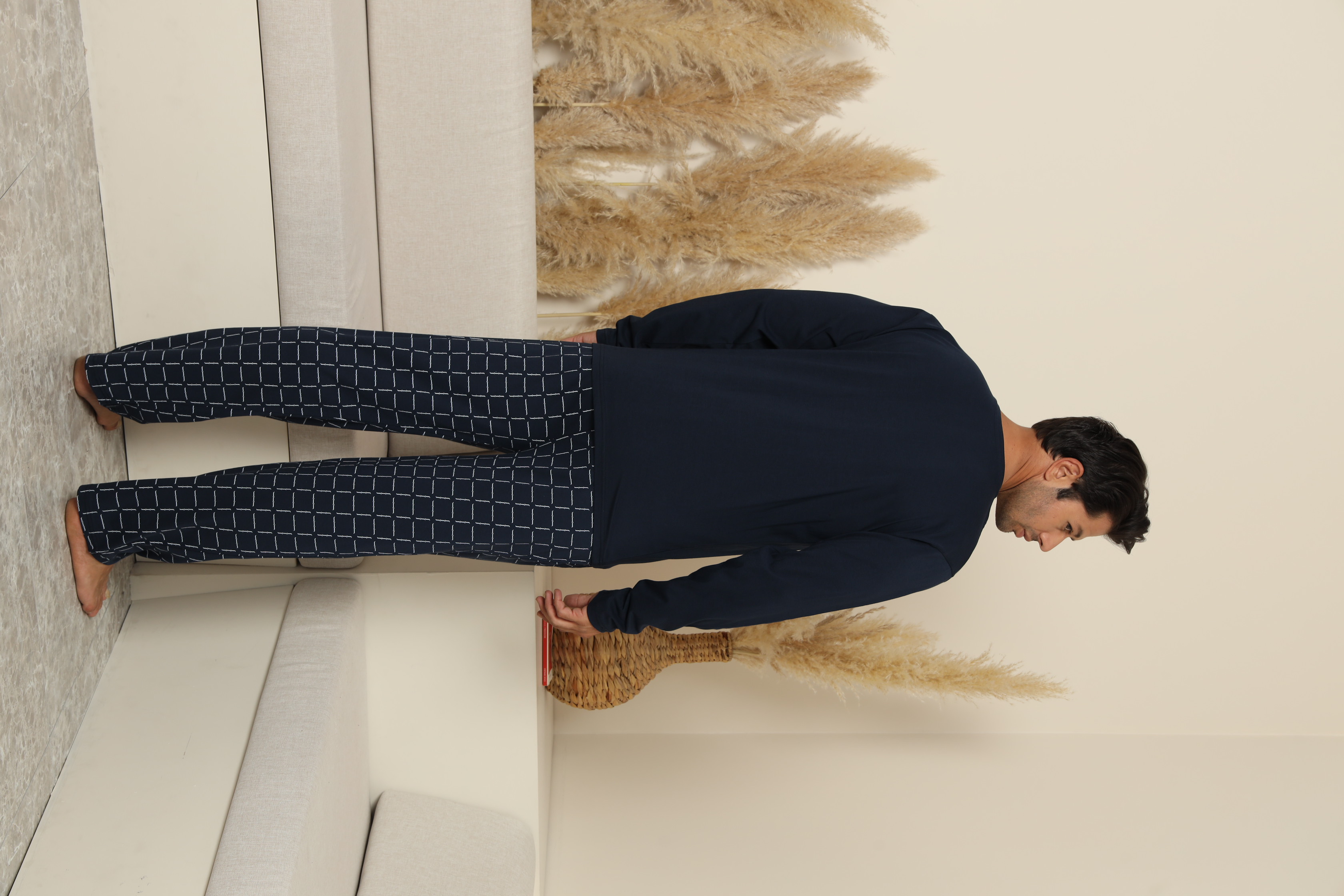Pijama confortabilă pentru bărbați, cu bluză cu mâneci lungi și pantaloni lungi cu buzunare .Guler rotund si buzunar  atasat pe piept. Fabricată dintr-un material moale și respirabil, perfect pentru un somn odihnitor.