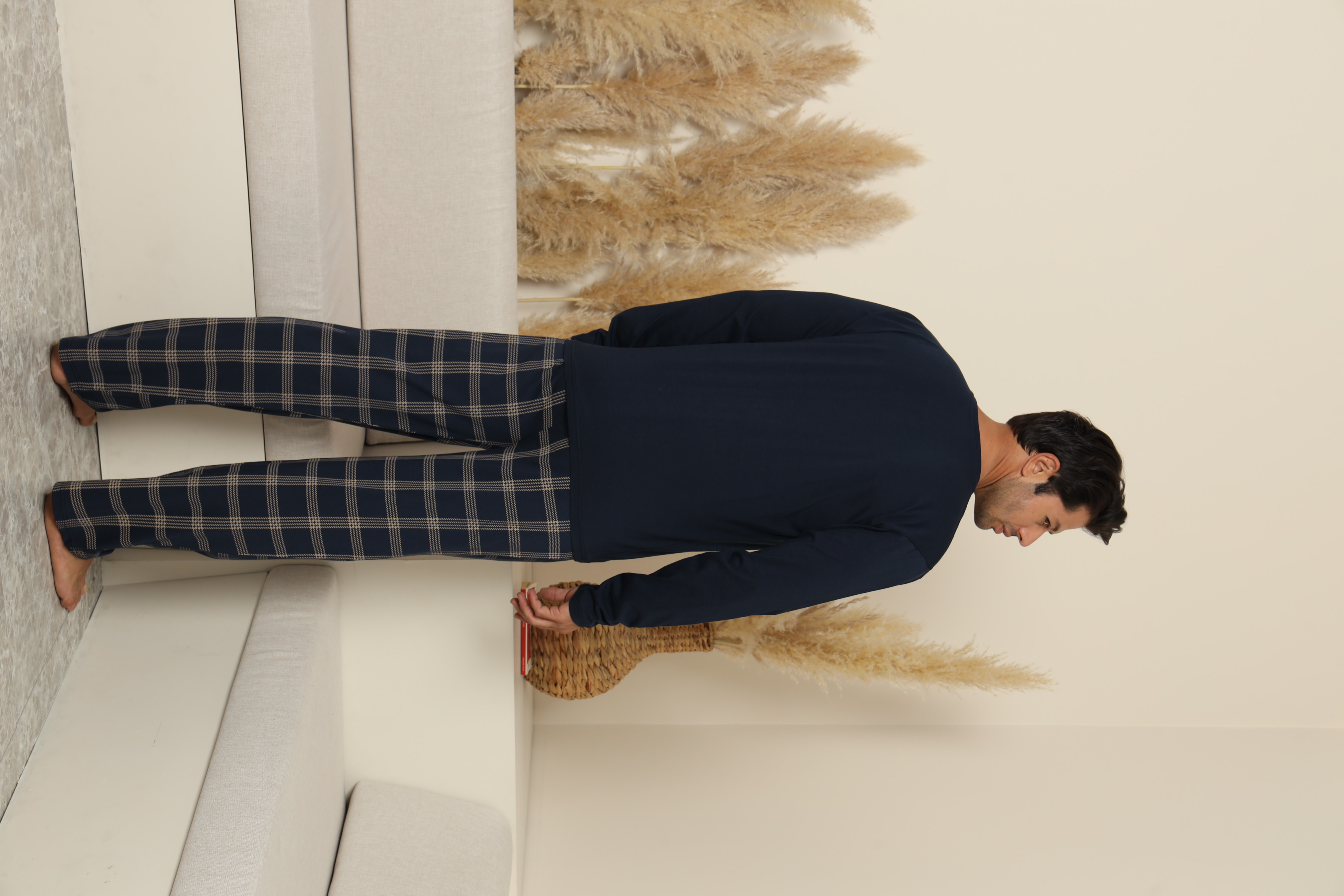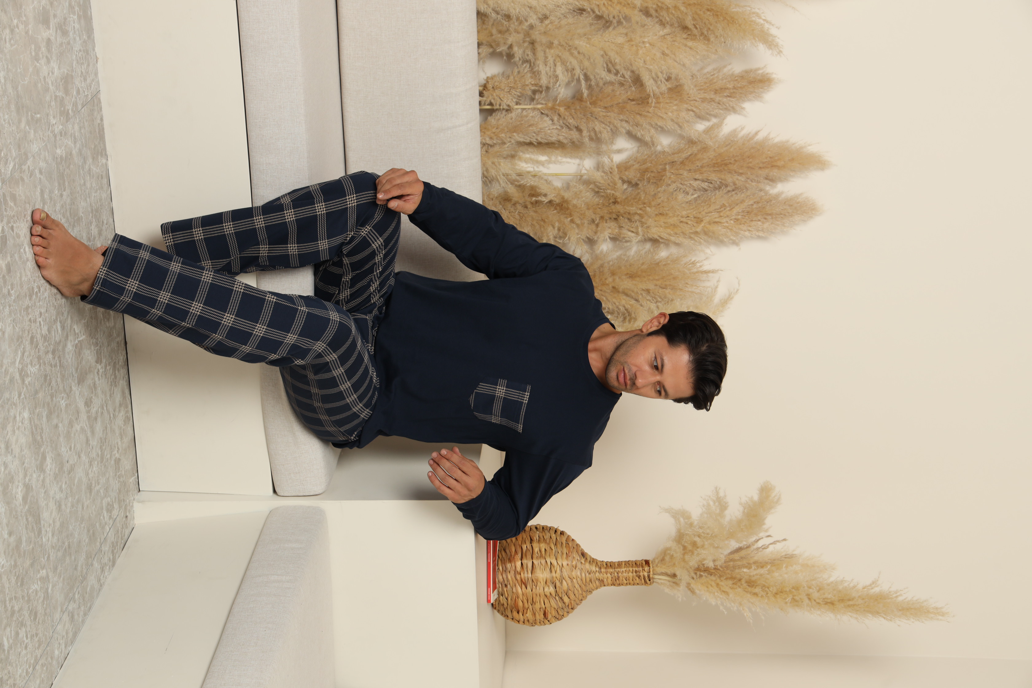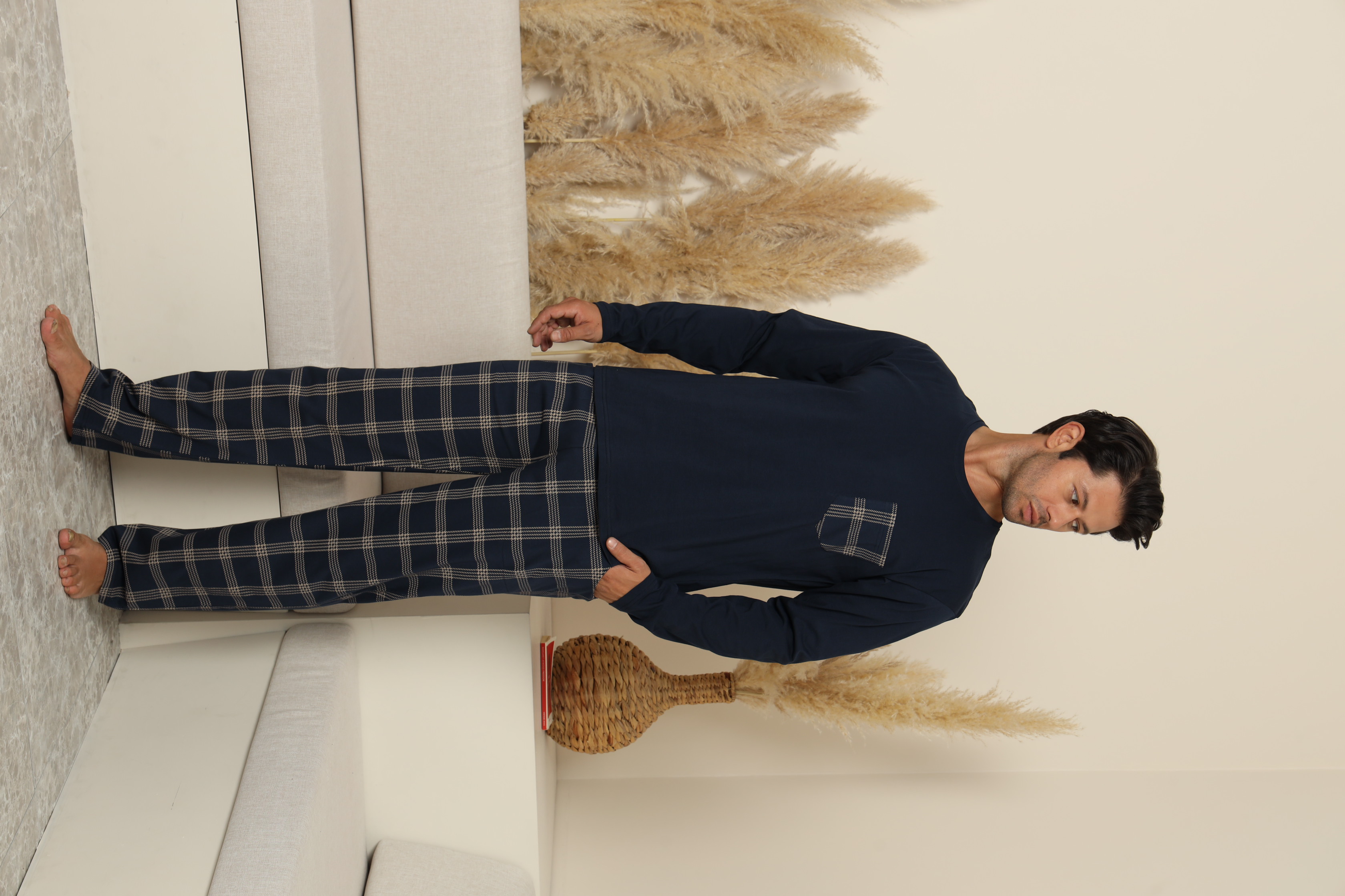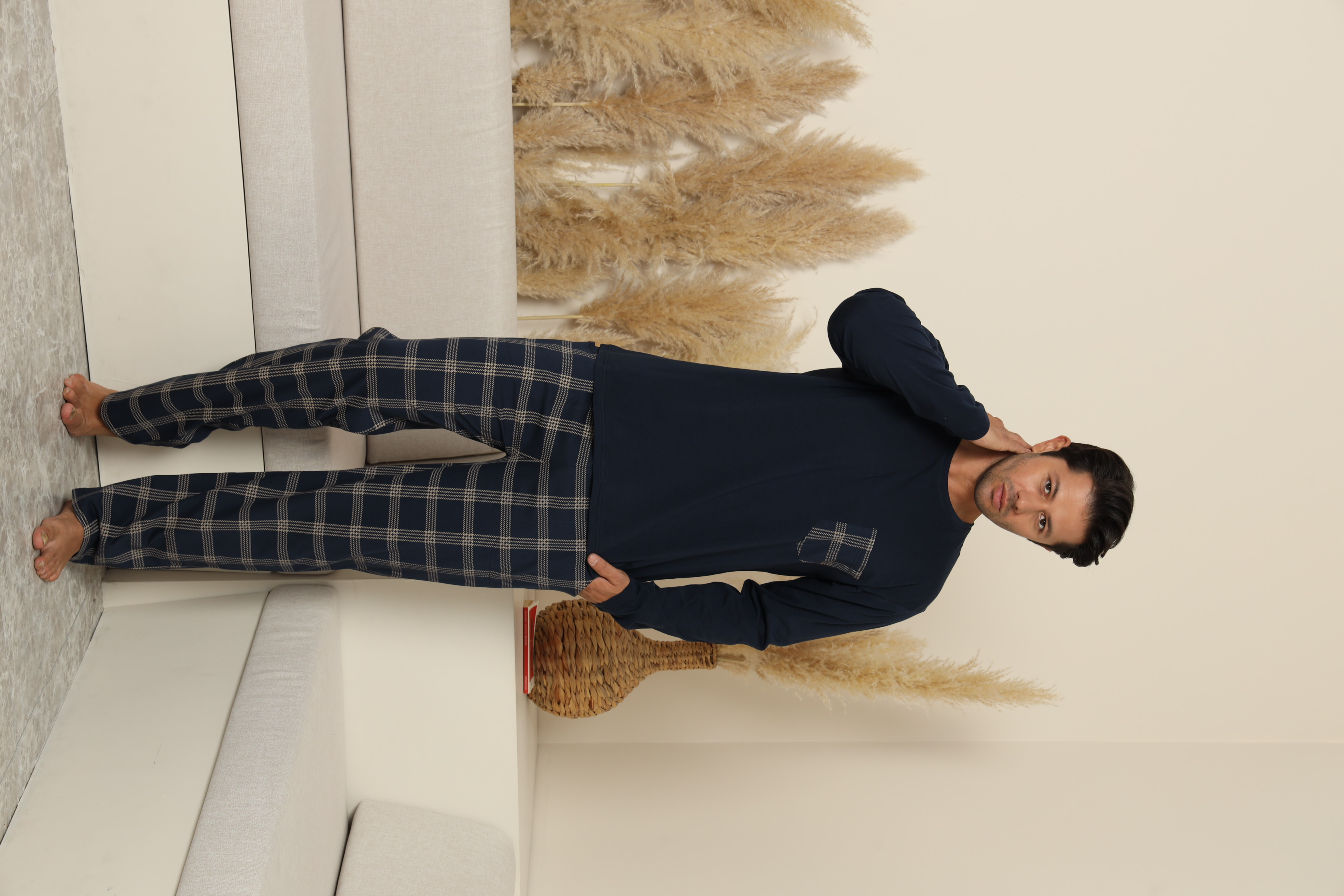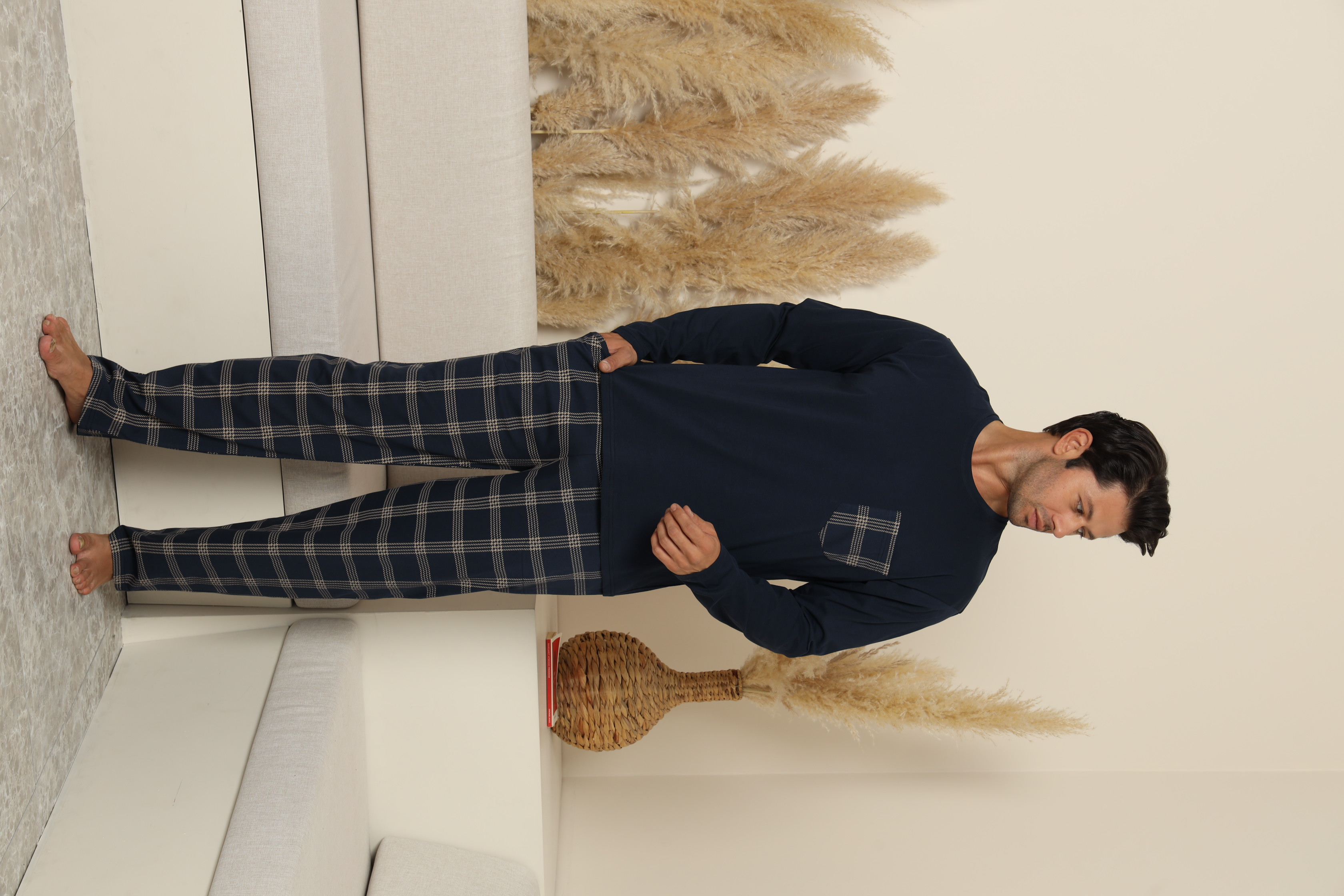 Pijama confortabilă pentru bărbați, cu bluză cu mâneci lungi și pantaloni lungi cu buzunare .Guler rotund si buzunar  atasat pe piept. Fabricată dintr-un material moale și respirabil, perfect pentru un somn odihnitor.