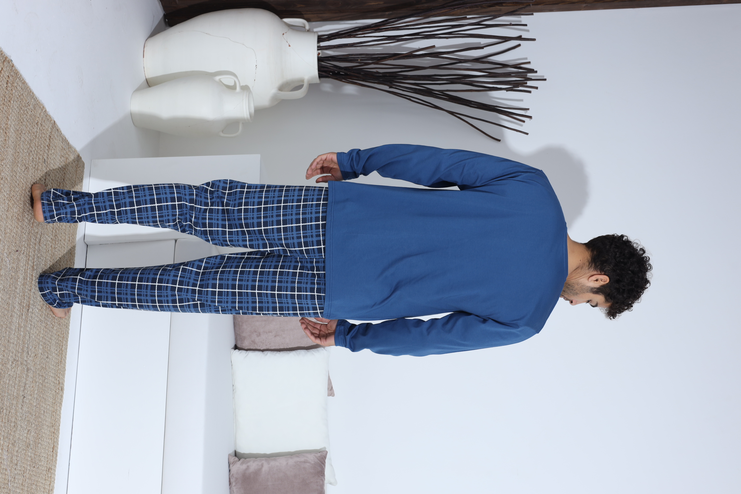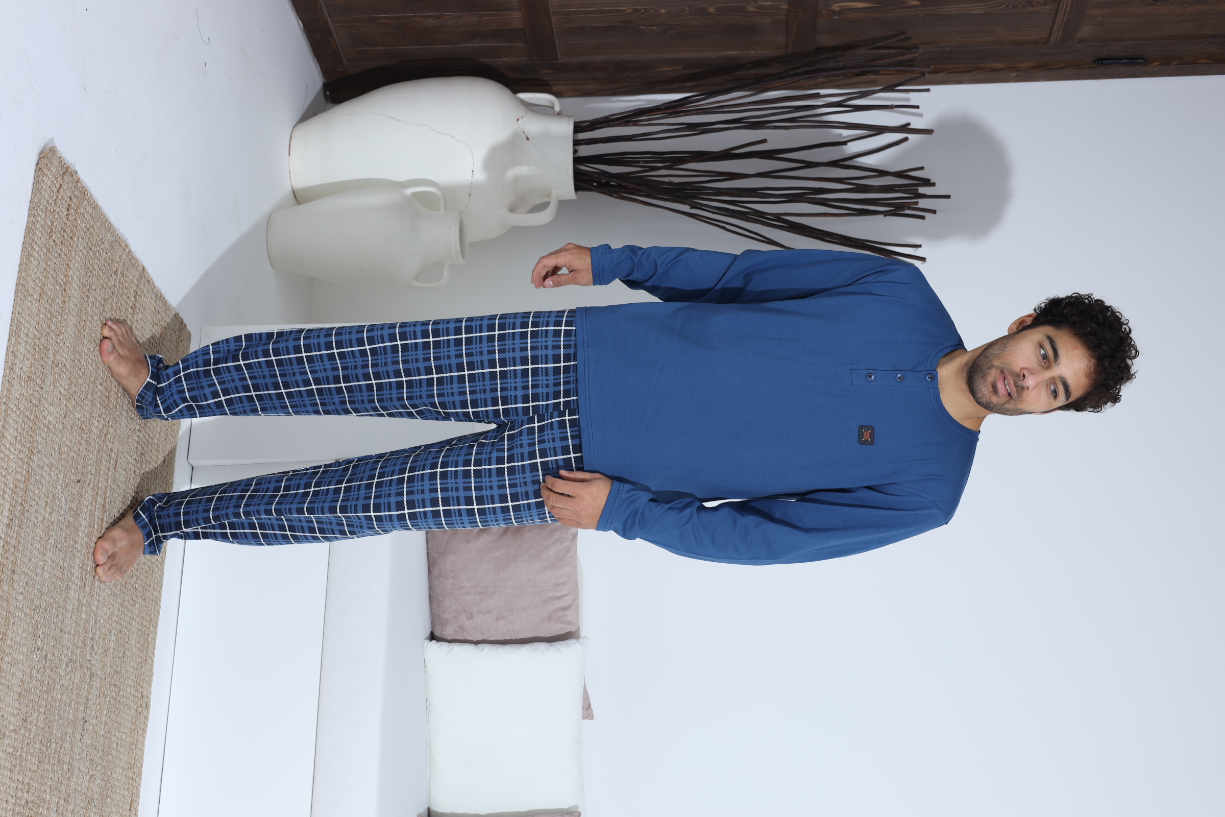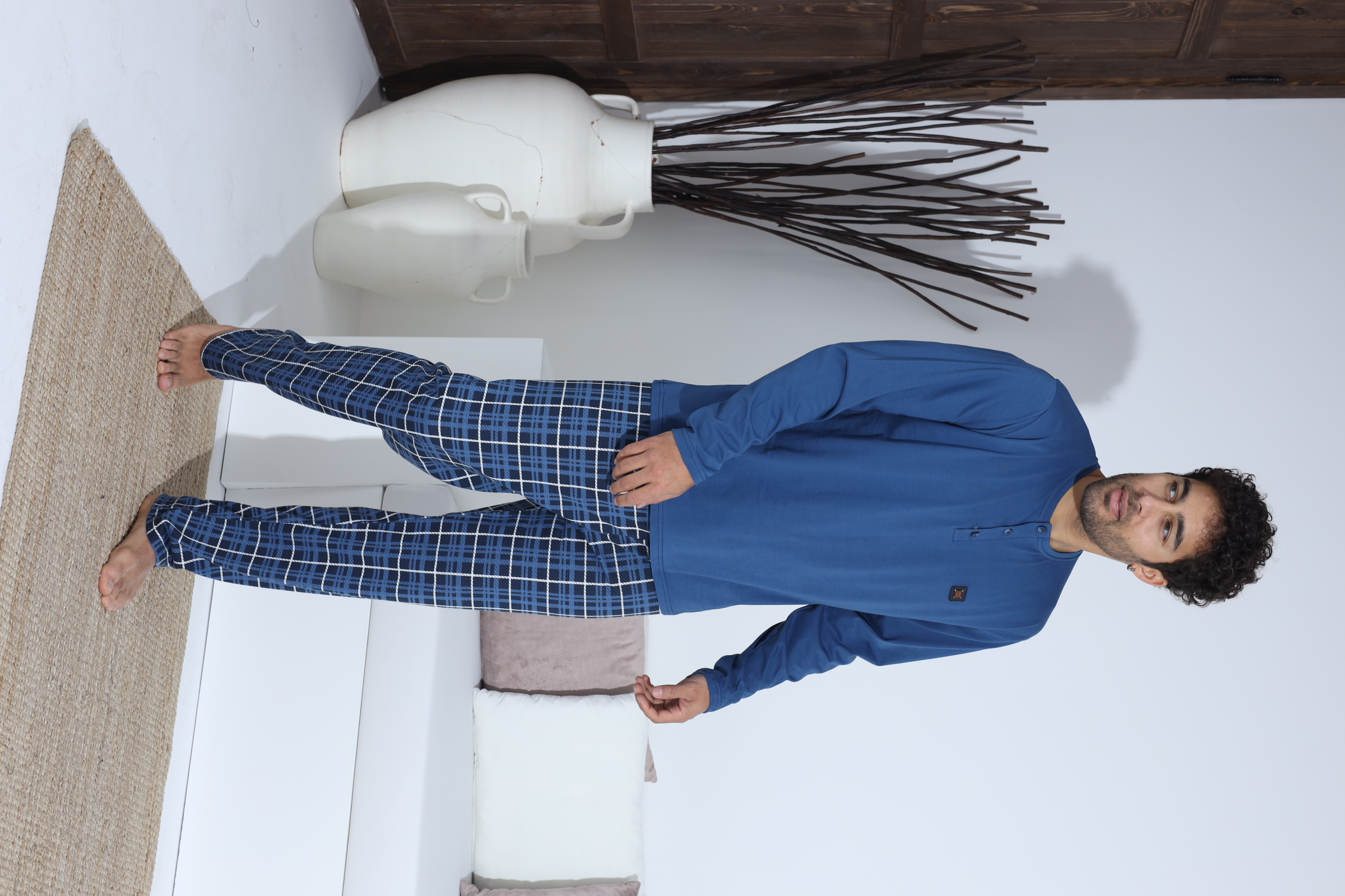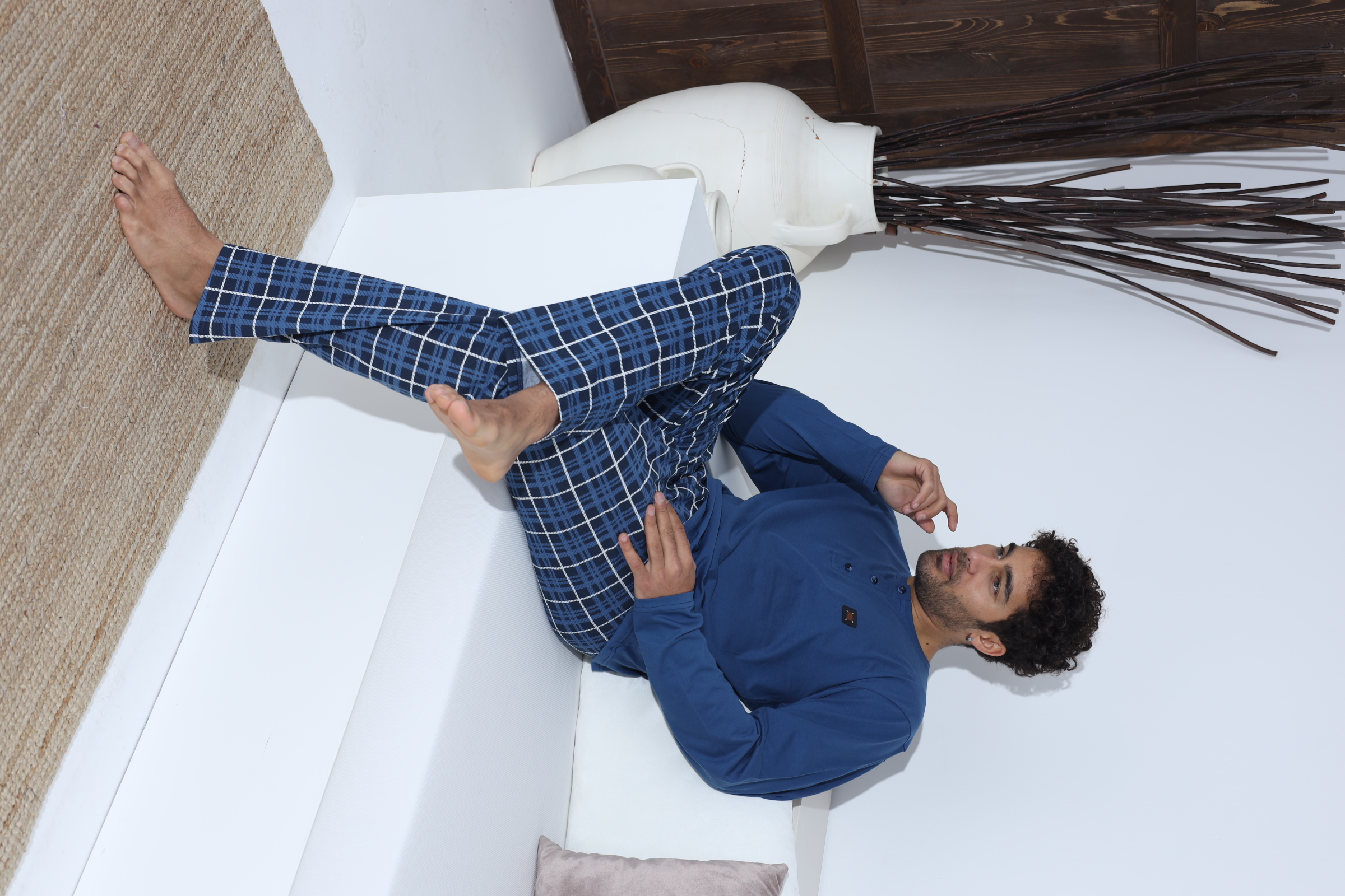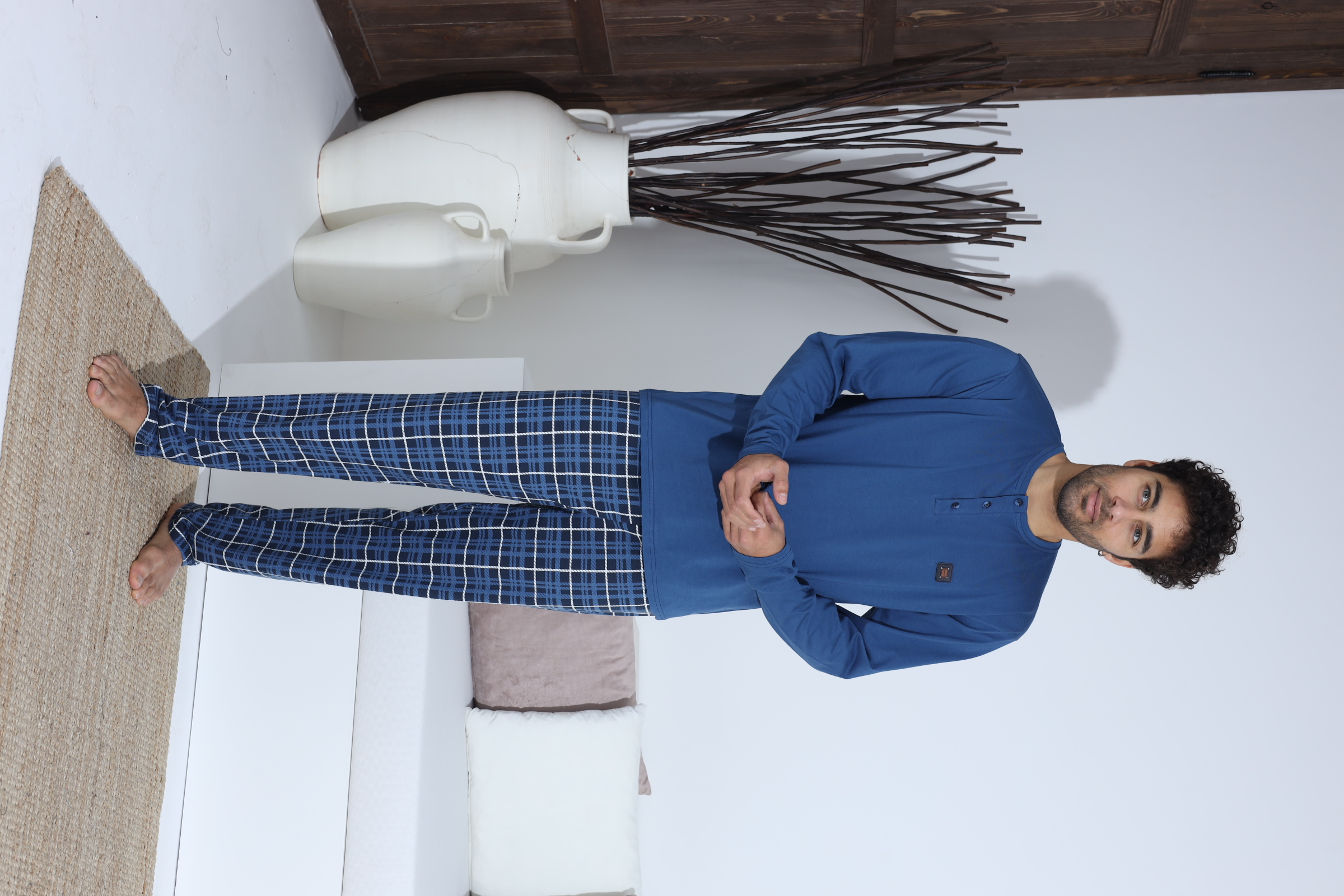 Pijama confortabilă pentru bărbați, cu bluză cu mâneci lungi și pantaloni lungi,cu guler rotund si trei nasturi pe piept. Fabricată dintr-un material moale și respirabil, perfect pentru un somn odihnitor.