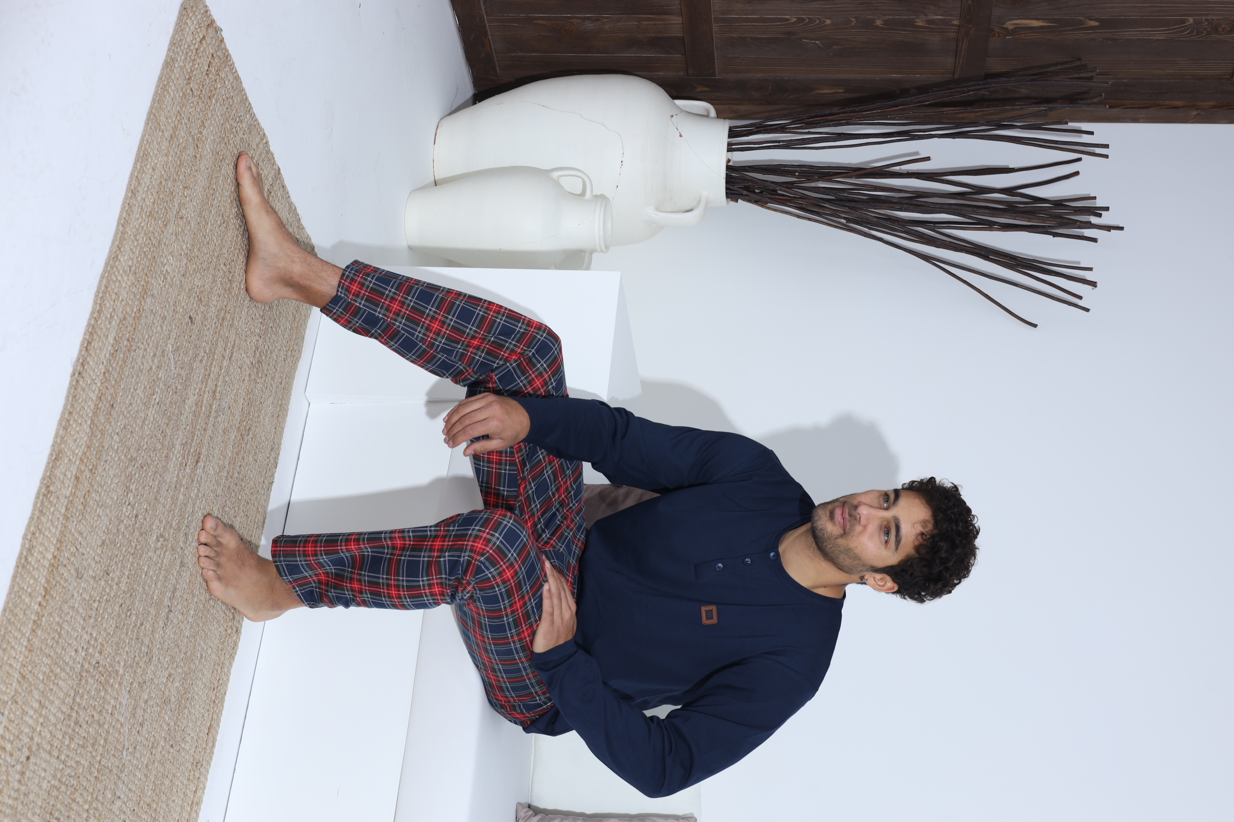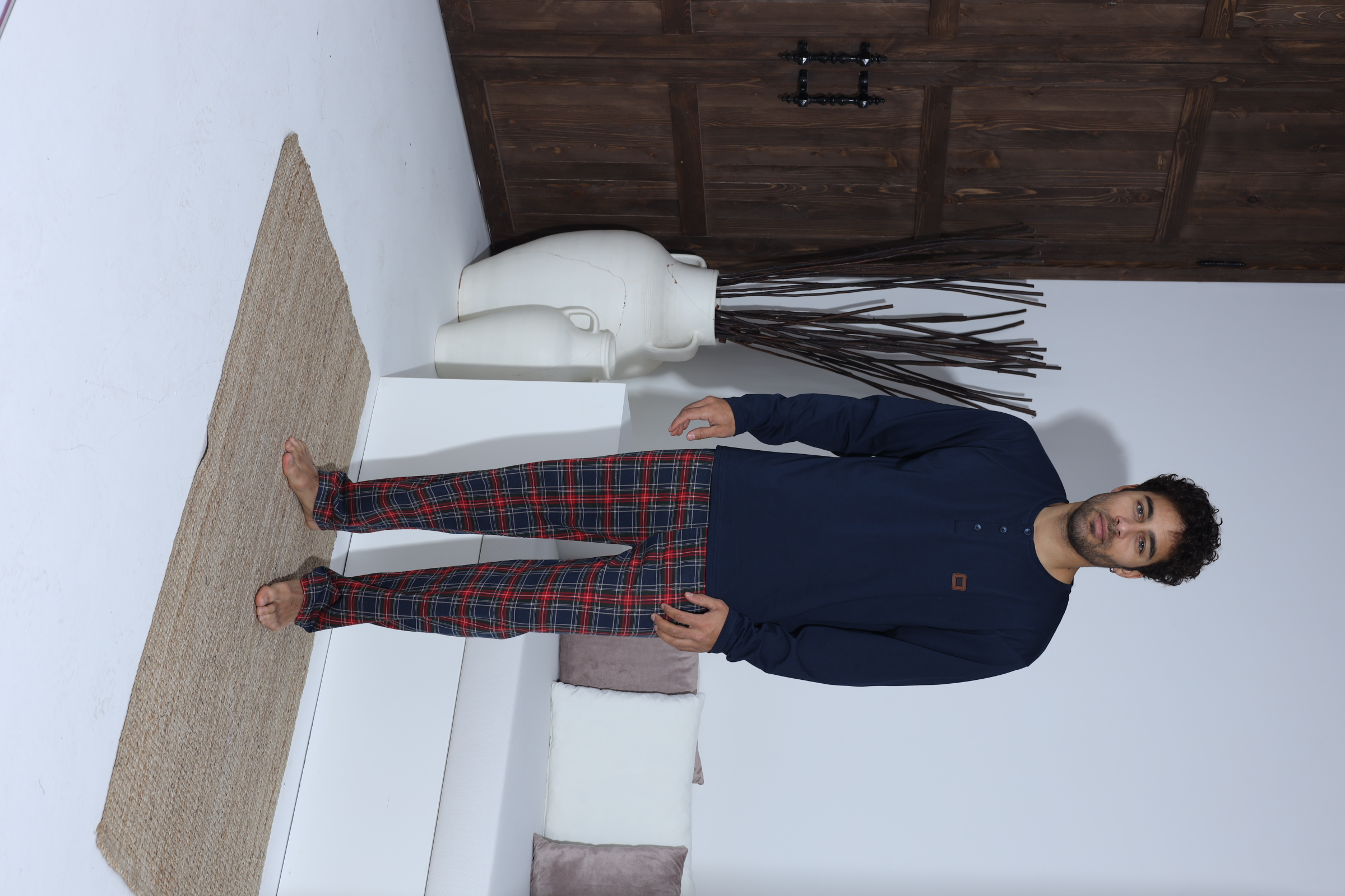 Pijama confortabilă pentru bărbați, cu bluză cu mâneci lungi și pantaloni lungi,cu guler rotund si trei nasturi pe piept. Fabricată dintr-un material moale și respirabil, perfect pentru un somn odihnitor.