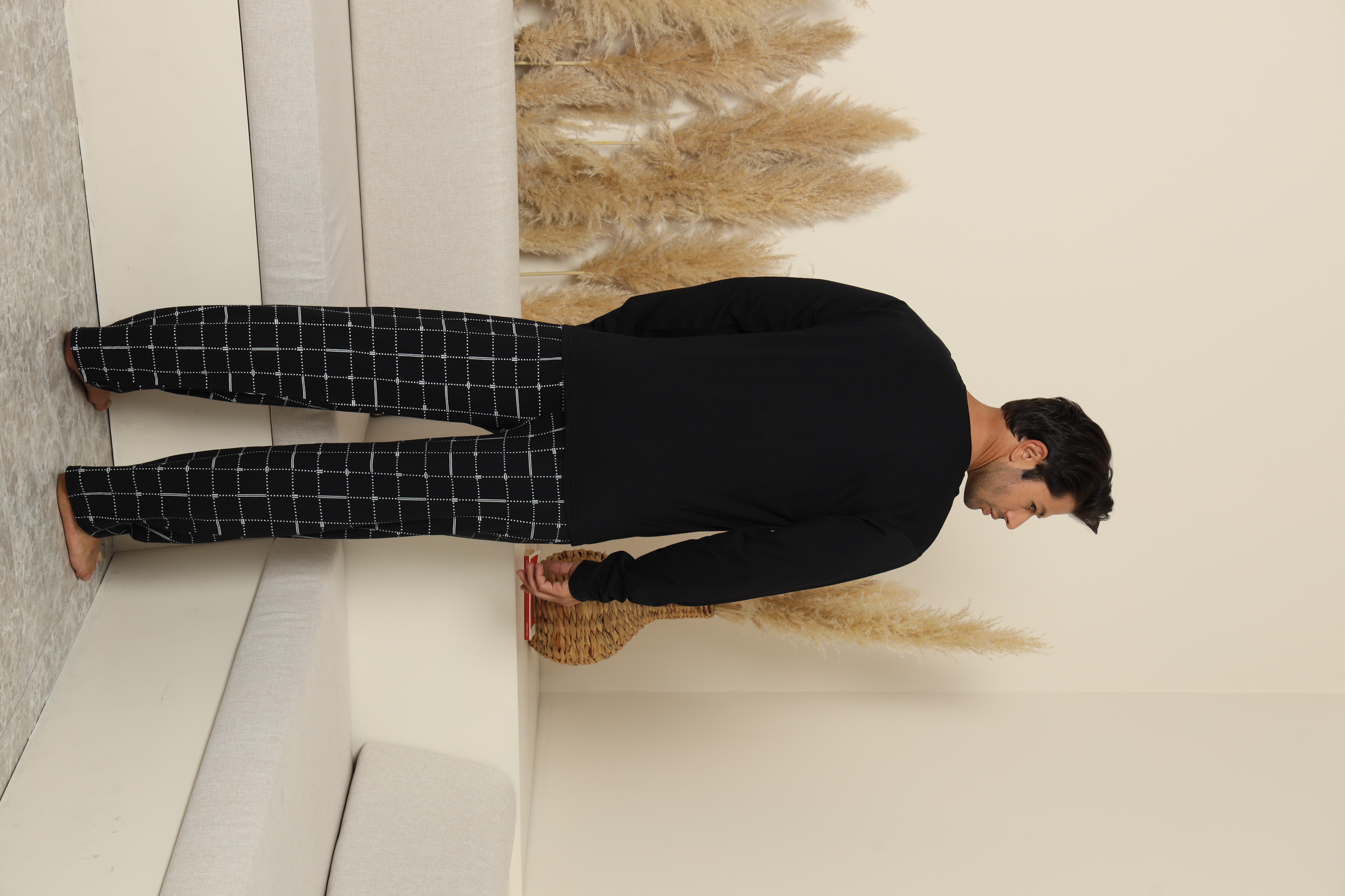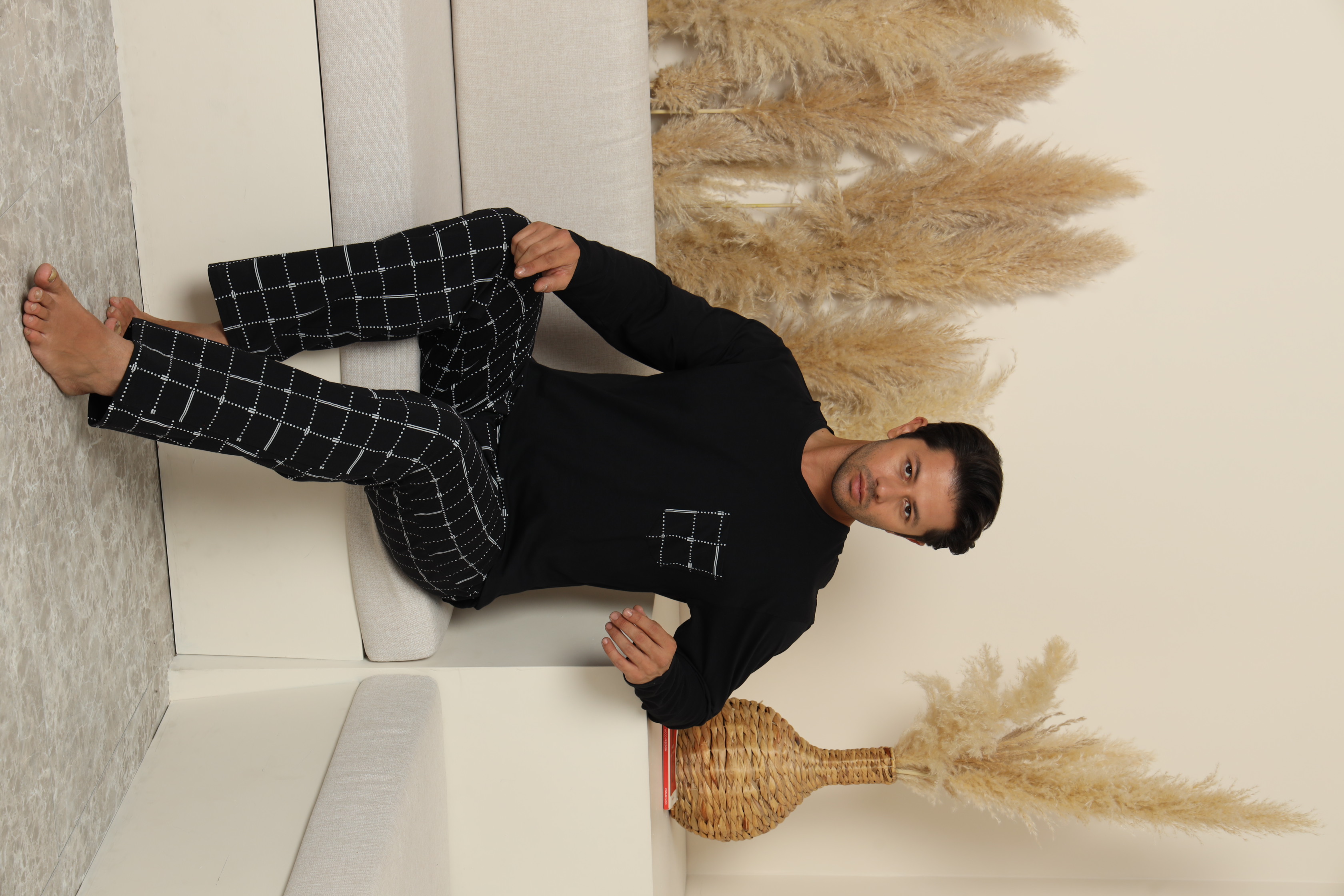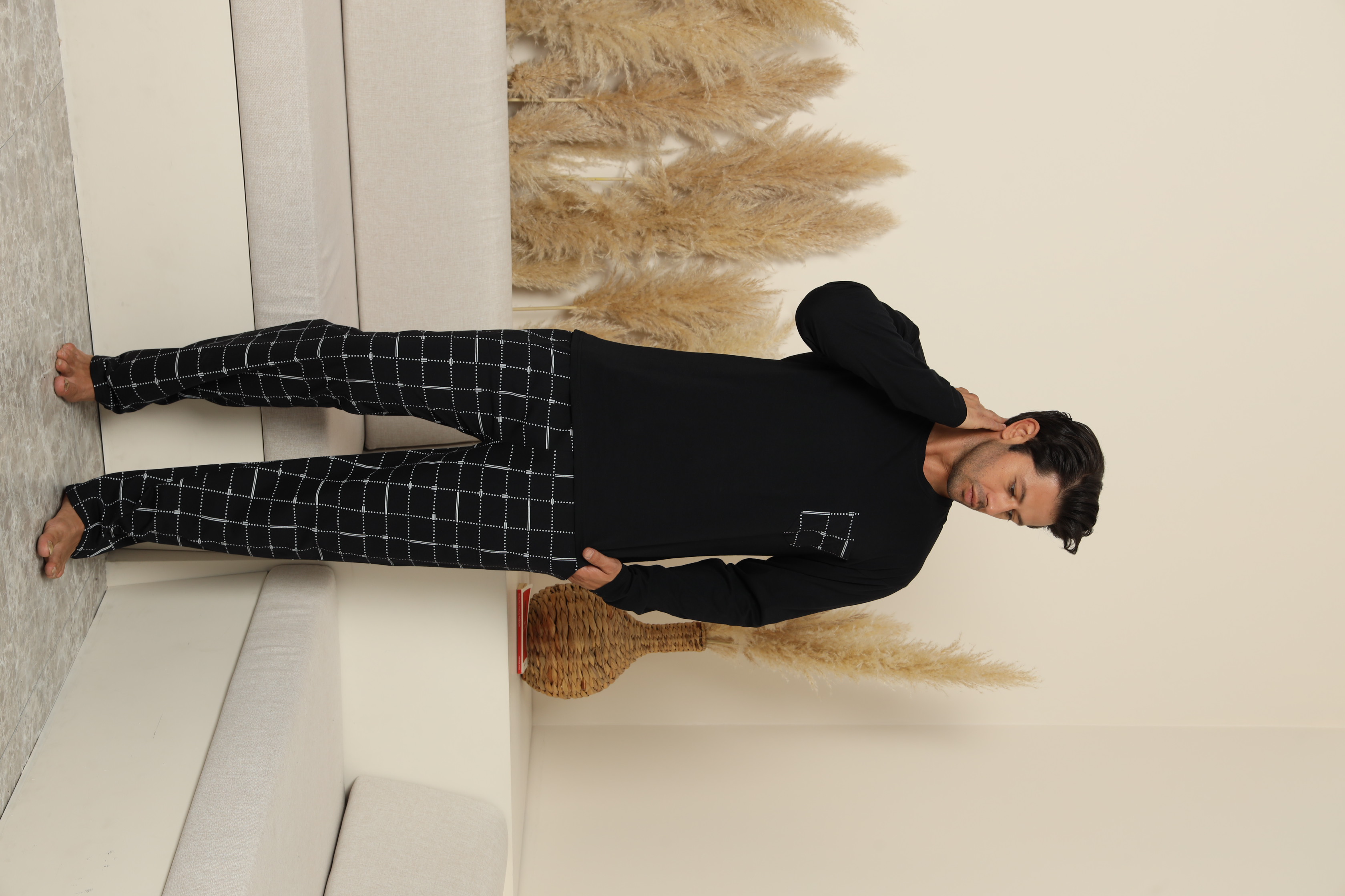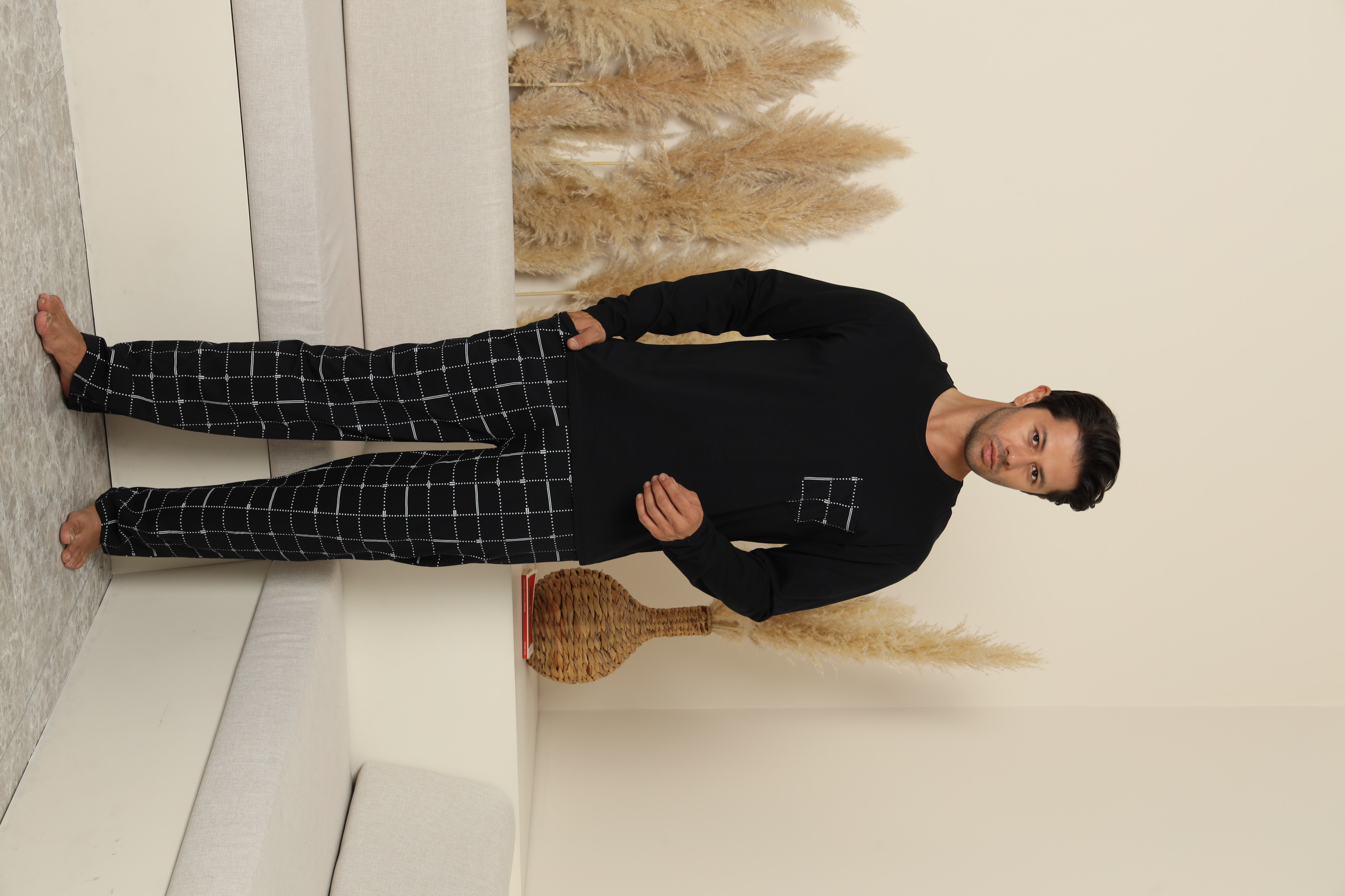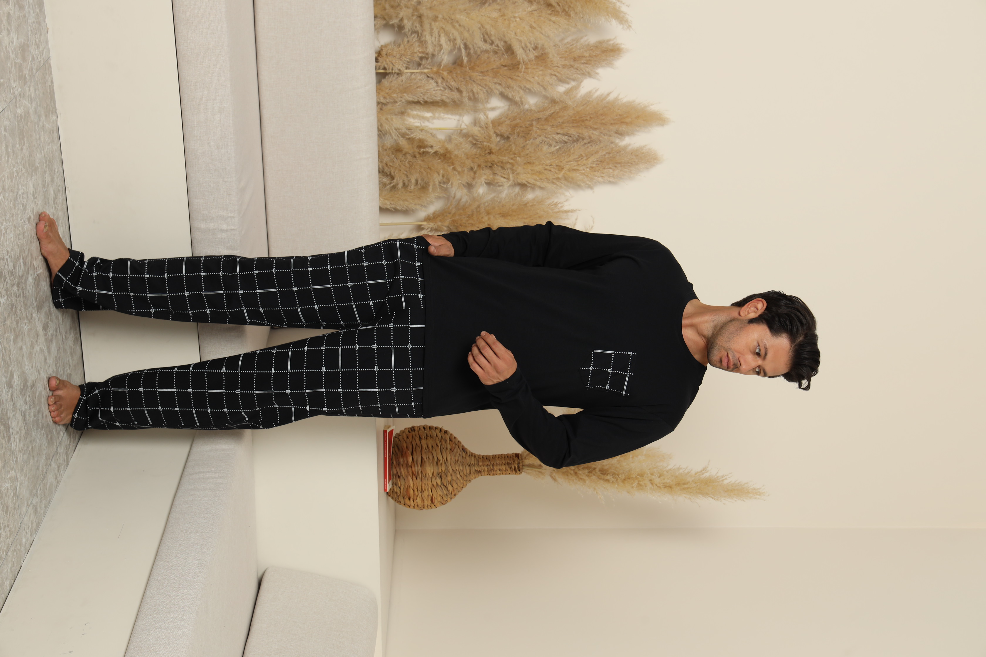 Pijama confortabilă pentru bărbați, cu bluză cu mâneci lungi și pantaloni lungi cu buzunare .Guler rotund si buzunar atasat pe piept. Fabricată dintr-un material moale și respirabil, perfect pentru un somn odihnitor.