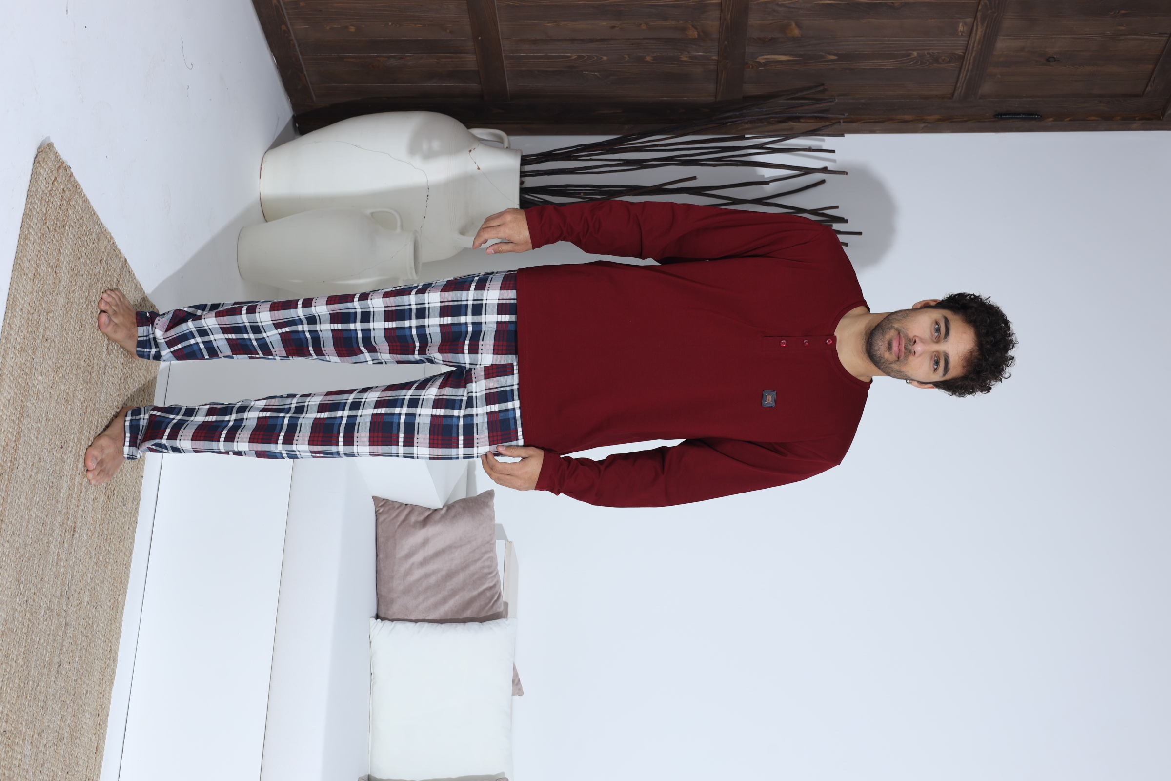 Pijama confortabilă pentru bărbați, cu bluză cu mâneci lungi și pantaloni lungi,cu guler rotund si trei nasturi pe piept. Fabricată dintr-un material moale și respirabil, perfect pentru un somn odihnitor.