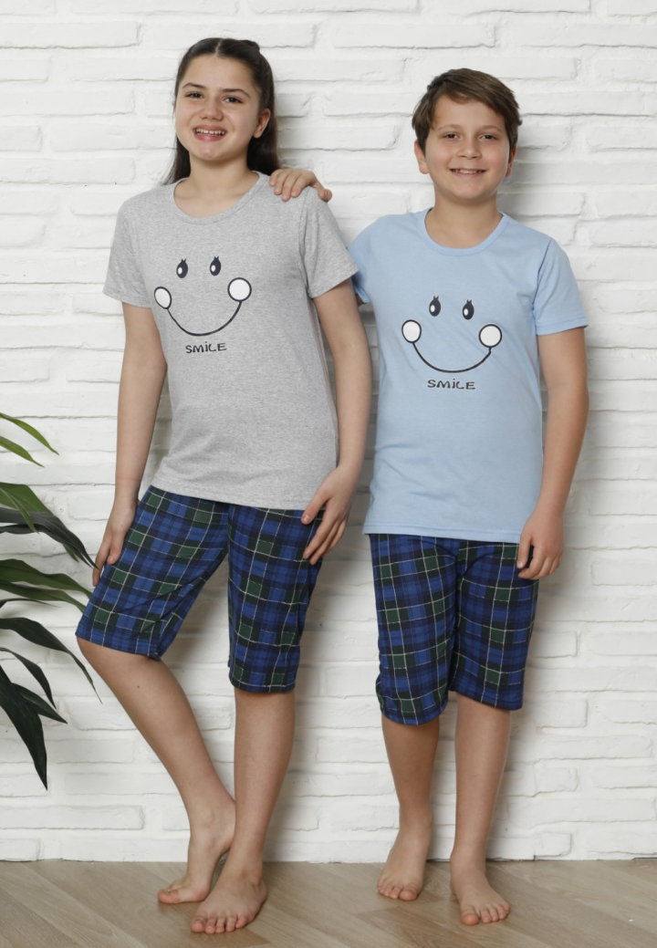 Pijama Copii cu maneca scurta si pantalon 3/4, culoare Albastru deschis si Gri ,Engros