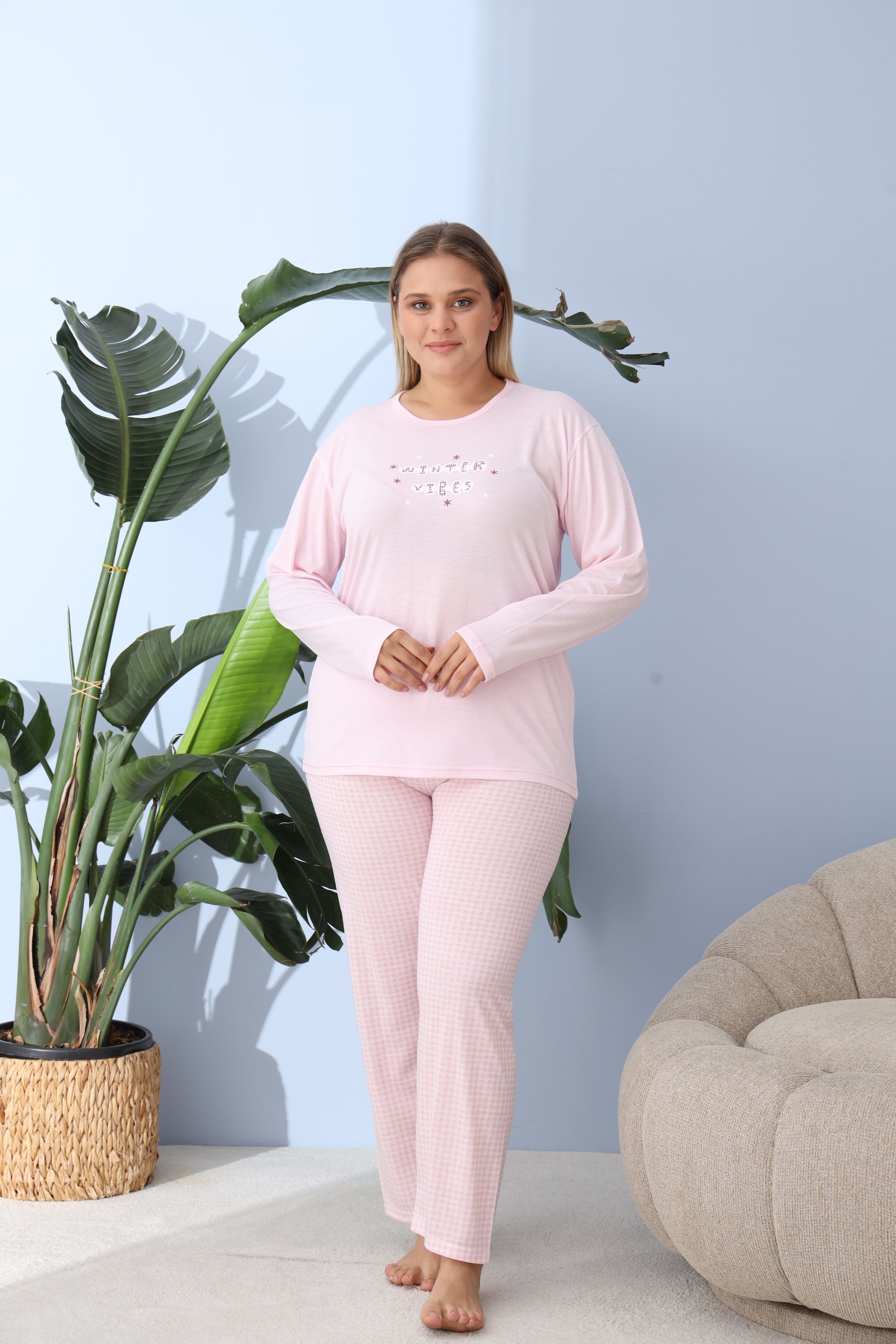 Pijama Dama ,Big Size ,'WINTER VIBES" cu Pantloni si Maneca lunga, Culoare Roz Deschis,Engros