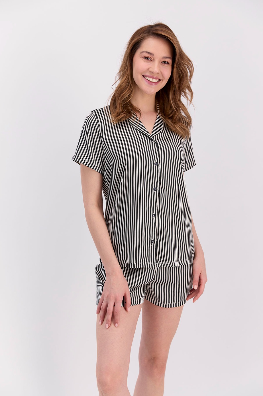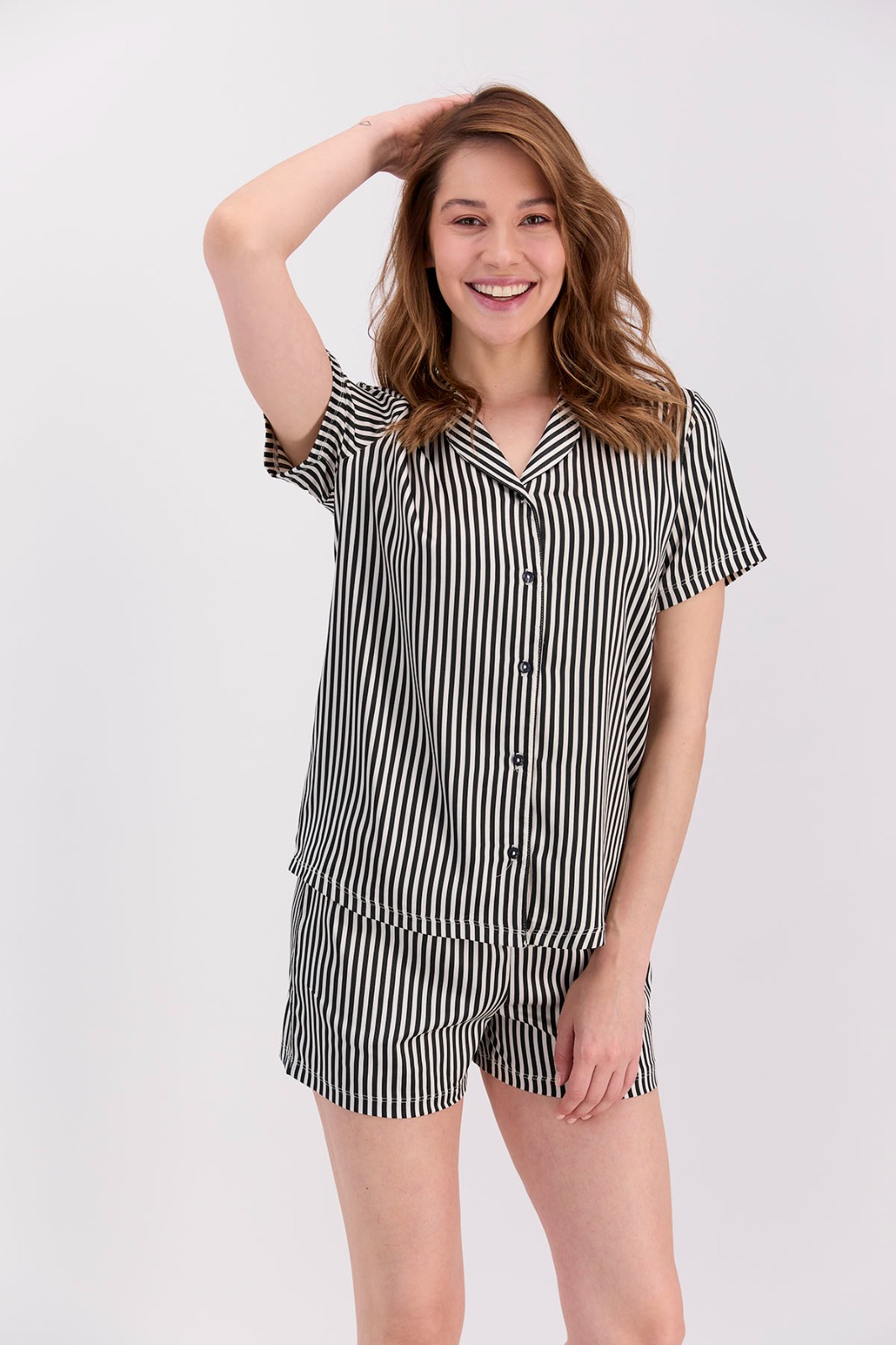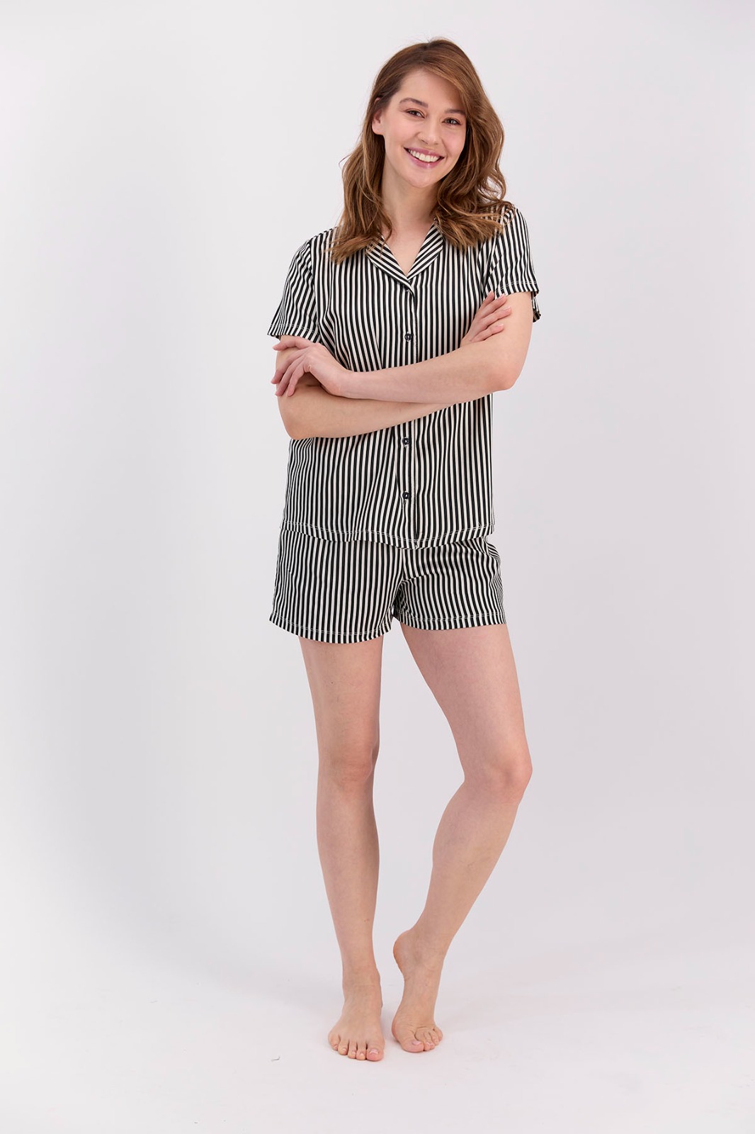 Pijama dama din bumbac cu mânecă scurtă și pantaloni scurti. Confortul este garantat de materialul ușor și natural, care permite pielii să respire, fiind ideal pentru nopțile calde de vară sau pentru momentele de relaxare acasă