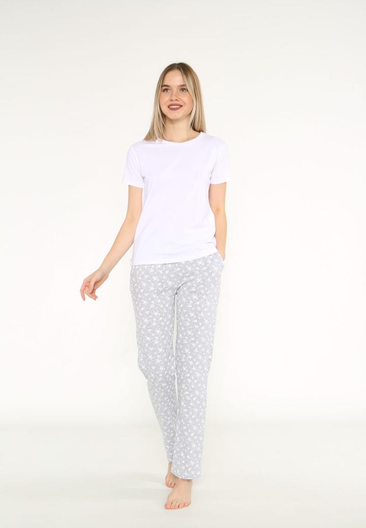 Pijama damă lejeră cu tricou alb și pantaloni lungi gri cu flori, realizată dintr-un amestec fin de bumbac și modal – pnfort absolut și eleganță naturală.