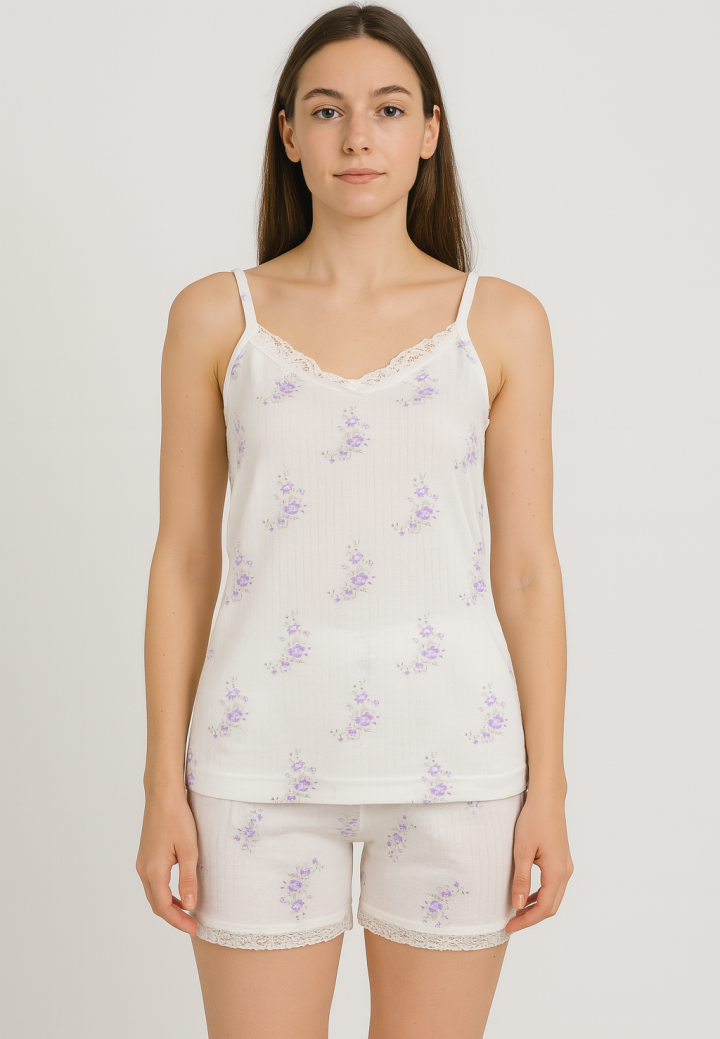 Pijama Damă Maiou și Short – Bretele Subțiri, Dantelă Delicată, Croială Lejeră, Imprimeu cu Flori Mov,Engros