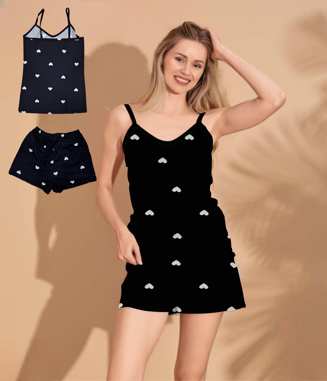 Pijama Damă, Maiou și Short, Imprimeu Inimi,Culoare Negru, Engros