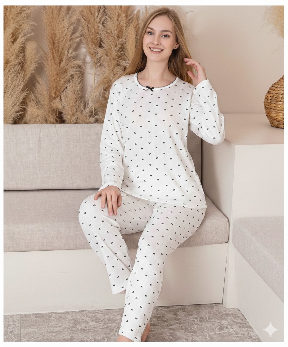 Culoarea albă, decorată cu inimioare negre, adaugă un aspect feminin și jucăuș, perfect pentru momentele de relaxare acasă. Materialul moale și călduros asigură un confort sporit pe durata nopții, fiind potrivit atât pentru somn, cât și pentru purtare în casă.