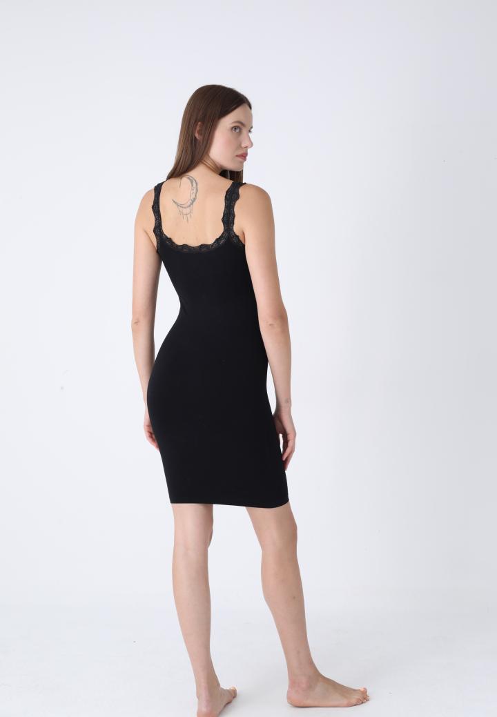 Rochie elegantă din dantelă neagră, fără cusături, cu lungime deasupra genunchiului și croială care urmează linia corpului.